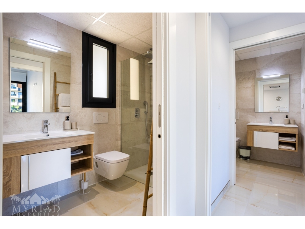 The apartment features two spacious bedrooms, both with fitted wardrobes that maximize space and add elegance to the overall design. The two modern and stylish bathrooms feature high-quality finishes, creating a relaxing and sophisticated atmosphere.