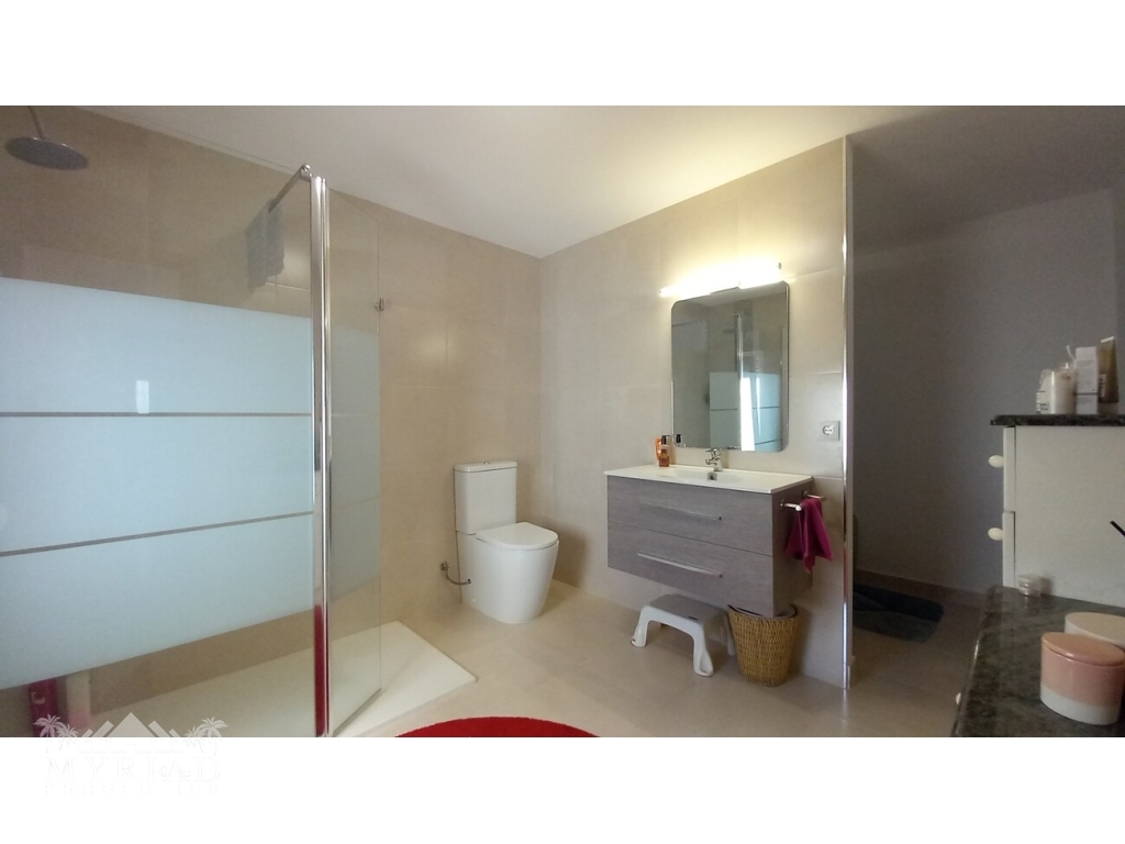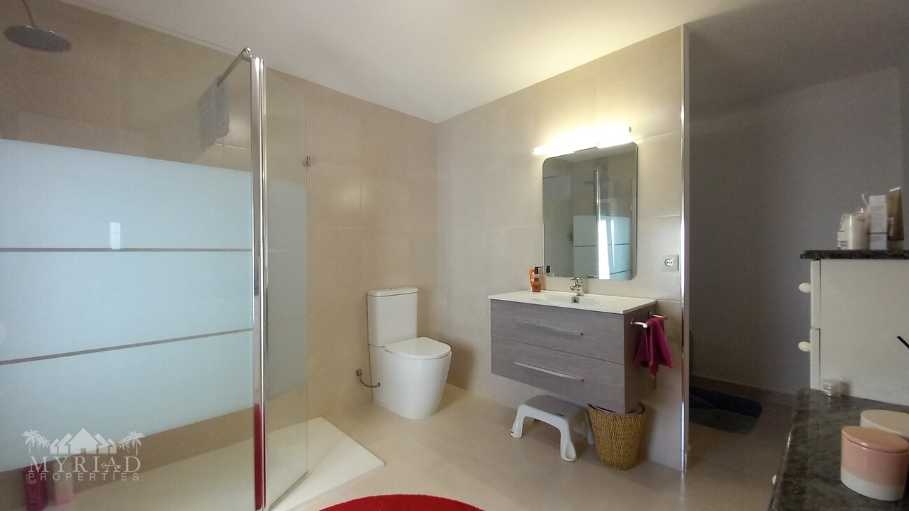 Two of the three double bedrooms are equipped with air conditioning, ceiling fans, and fitted wardrobes.