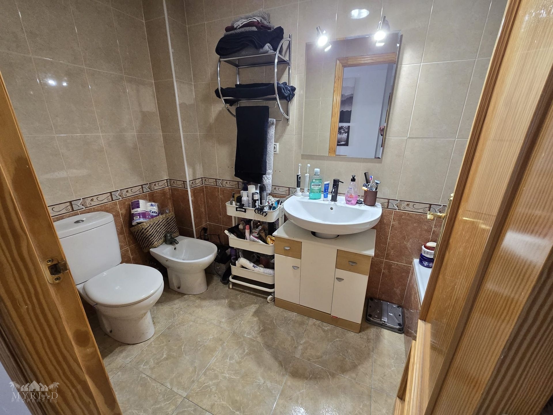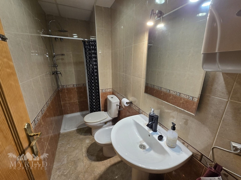 Upon entering the building, you can choose either the stairs or the lift to reach the first floor, where the apartment is well positioned with its front door facing the private outdoor area. Inside, the hallway first leads to the family bathroom, followed by a spacious kitchen with a utility room that provides access to the smaller outdoor space—an excellent spot to enjoy the fresh morning air. The corridor continues to the generously sized lounge, which opens onto its own balcony with views of the mountains and the medical centre. At this end of the apartment, you will also find two good-sized double bedrooms, one currently used as a dressing room or walk-in closet, as well as the master bedroom. The master bedroom enjoys mountain views and features its own private en-suite bathroom.