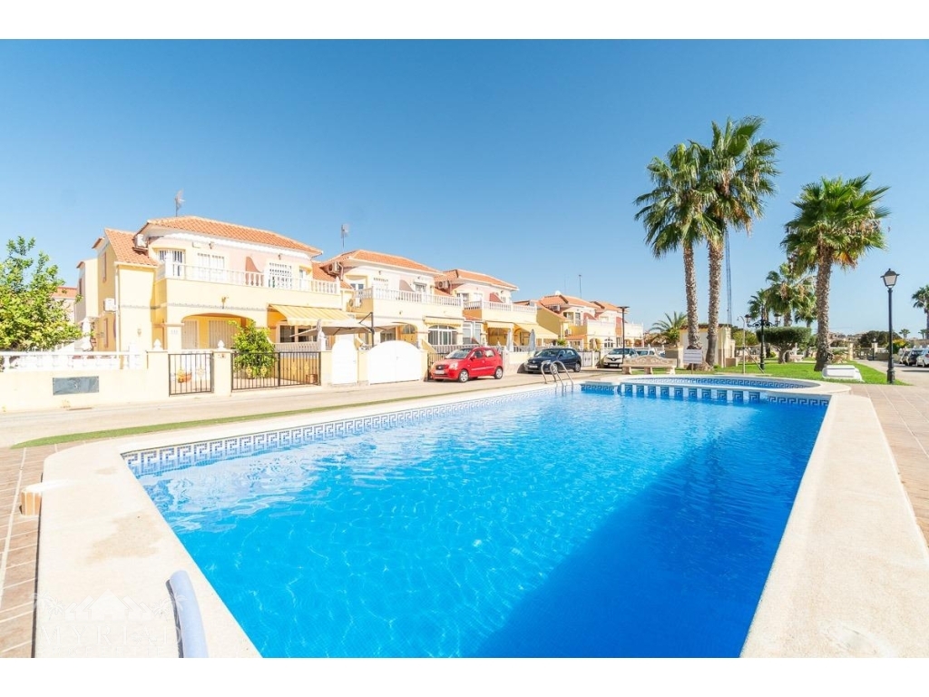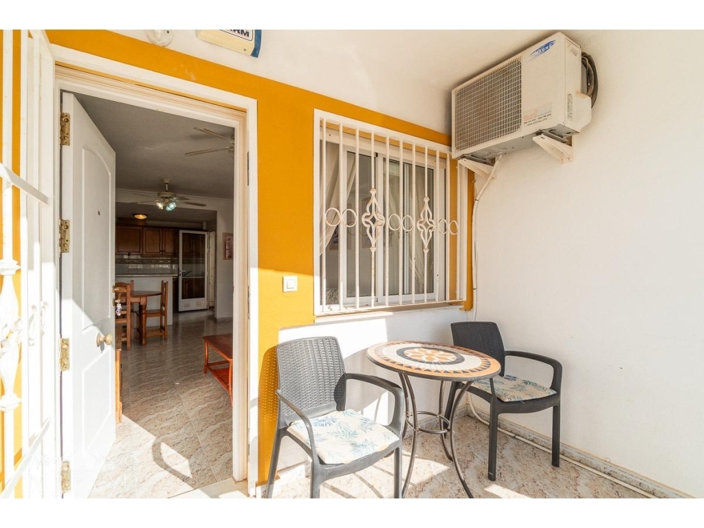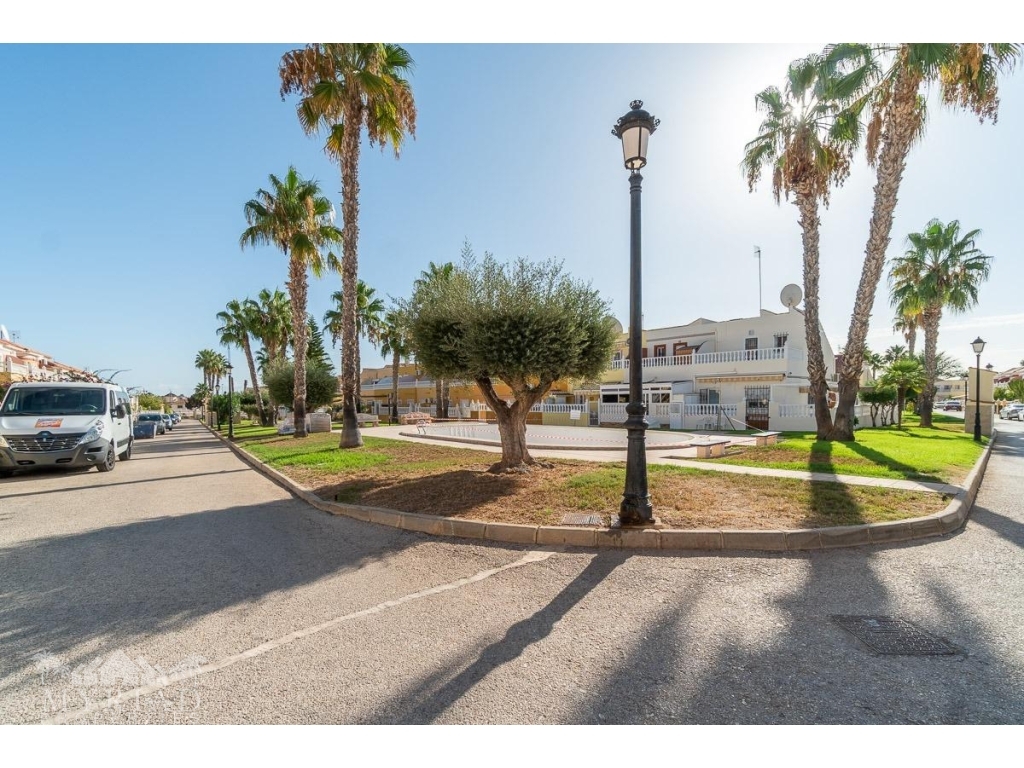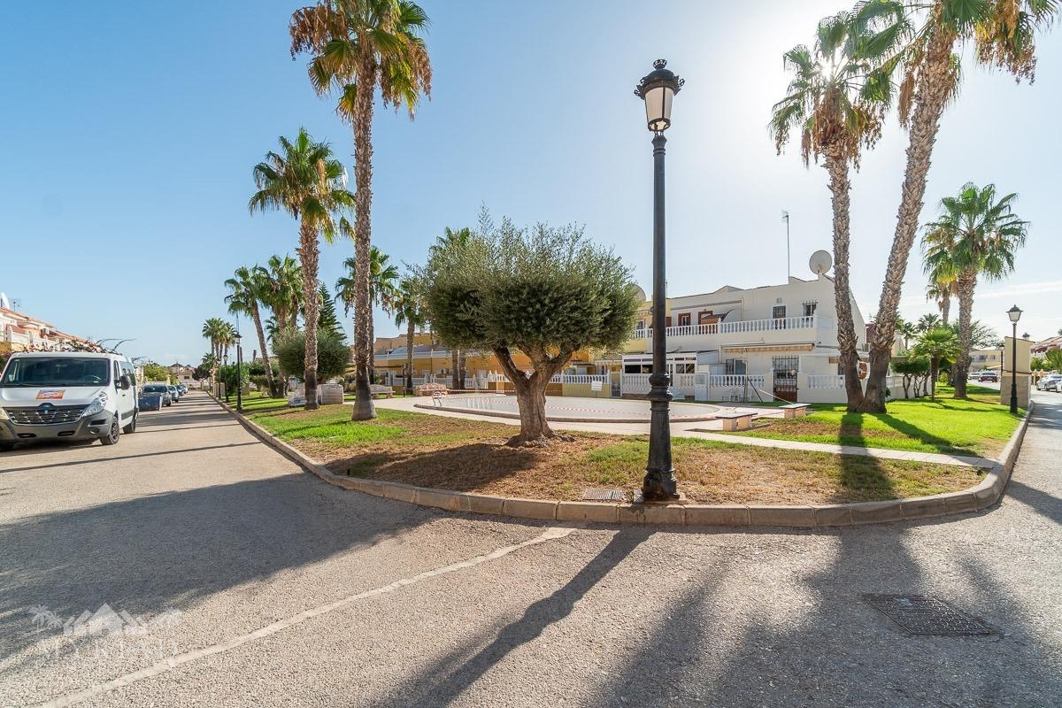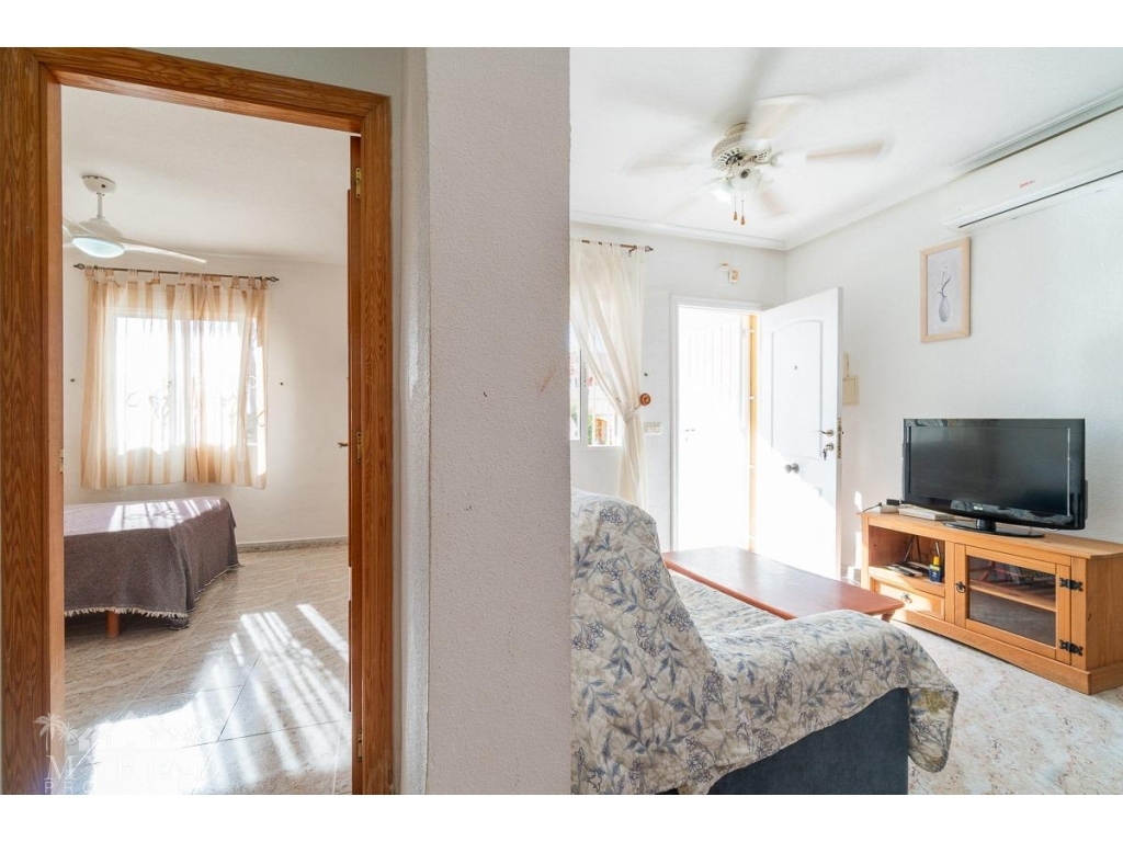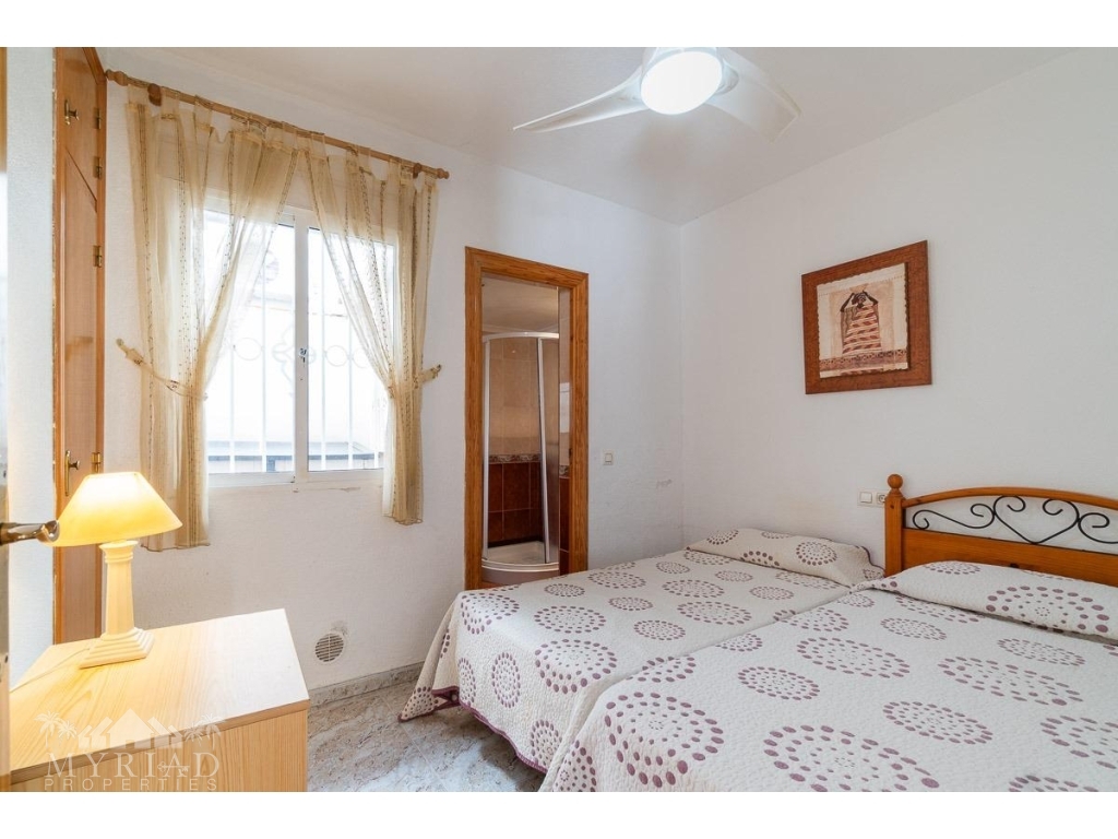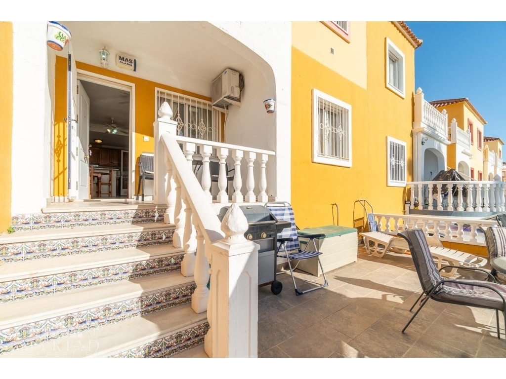 We present this charming ground-floor bungalow located in the sought-after area of Lomas de Cabo Roig, Orihuela Costa. With a built area of 59 m², this cozy apartment is ready to move in.~~You enter through a private garden leading to a lovely porch, perfect for dining outdoors or relaxing with family and friends. Inside, there is a bright living-dining room, a practical kitchen, two double bedrooms, and a full bathroom – all designed for comfort, whether for holidays or year-round living.~~The property faces east, allowing you to enjoy natural light from the early hours and sunshine all year round.~~The residential complex is gated and private, offering extra peace and security. It features two communal swimming pools surrounded by green areas, plus children’s play zones – ideal for families.~~Its location is unbeatable: within minutes you’ll find public transport, shopping centers, schools, hospitals, parks, and leisure areas.~~Thanks to the strong European tourism all year round, this property is not only a charming home but also an excellent investment opportunity for holiday rentals with great income potential.