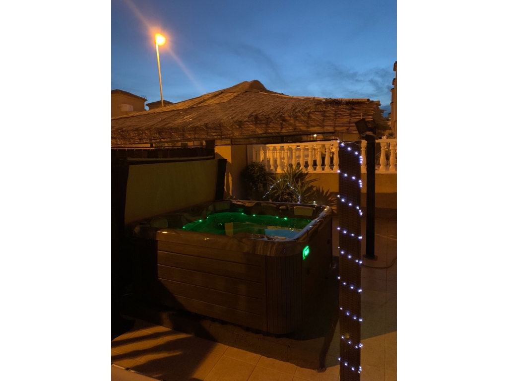 The house is built on two levels. On the ground floor, there is a kitchen that opens onto the living room, a bedroom and a bathroom. Upstairs, there is a bathroom and two bedrooms, one of which has a balcony. There is also a terrace leading to the solarium, where there is a storage room. The outdoor area is pleasant with several terraces, one of which is covered, a jacuzzi, a parking space and a storage room. The house has air conditioning in the living room and in all bedrooms. Each bedroom has a built-in wardrobe. It is sold fully furnished and has a tourist licence.