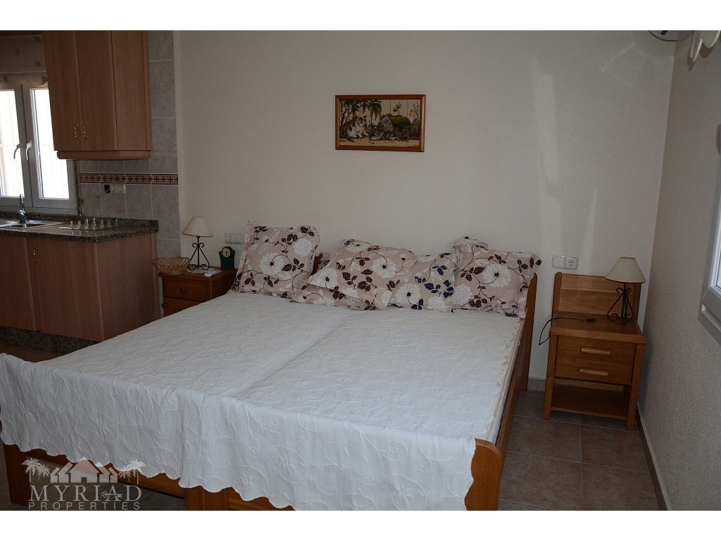 Self-contained apartment with private entrance, featuring a bedroom/living space, kitchen/lounge area, bathroom, and storage room with boiler.