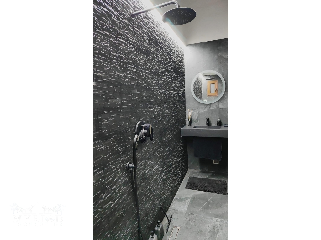 Exterior: White scraped monolayer, quartz gray wall covering, slate mural and Shelves.