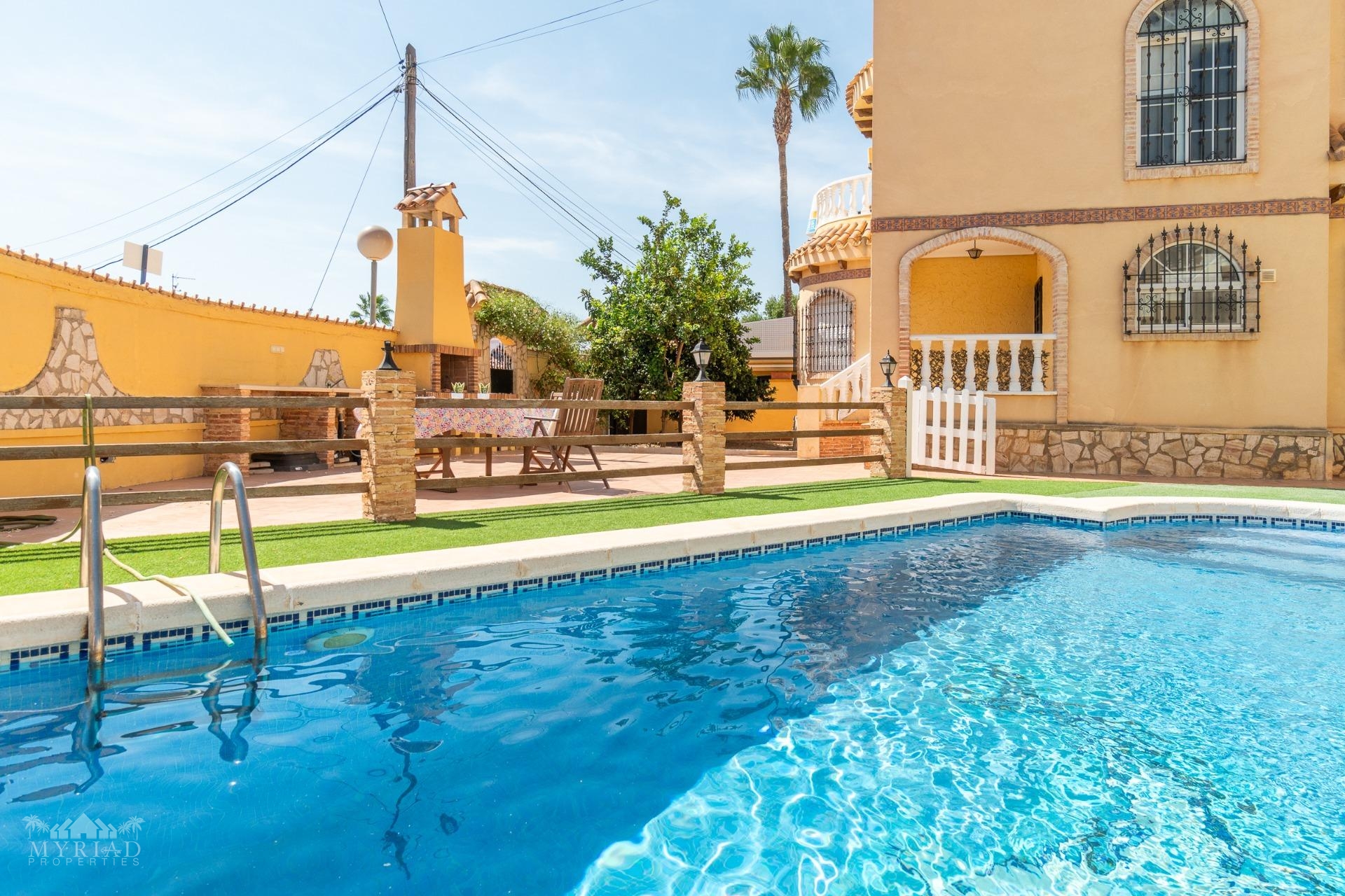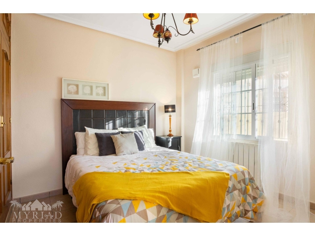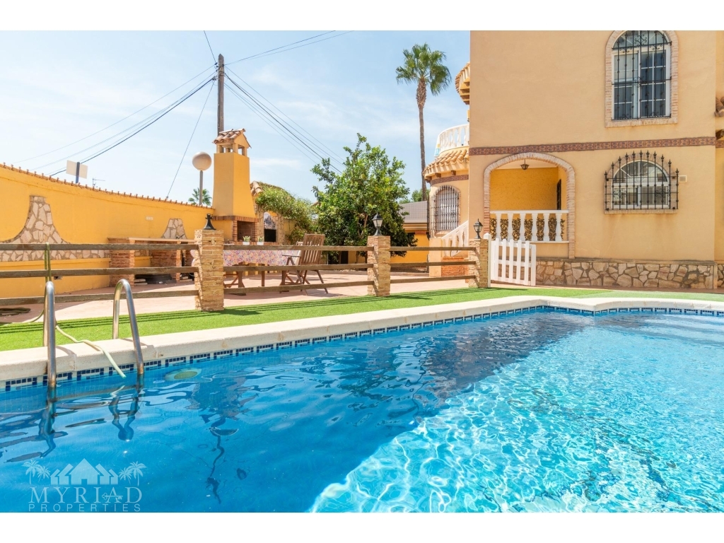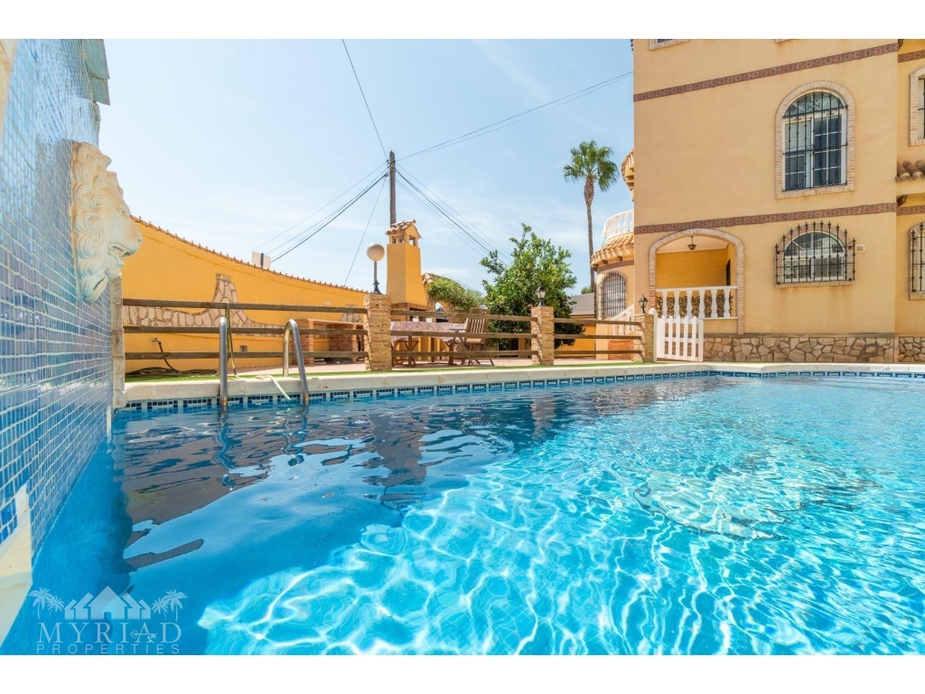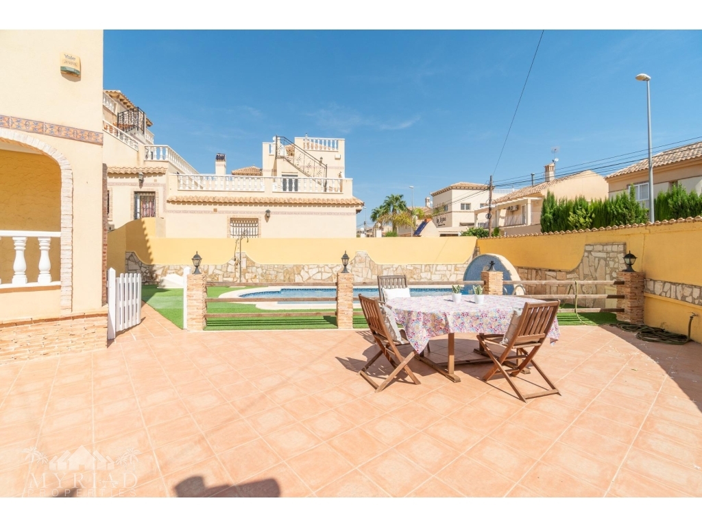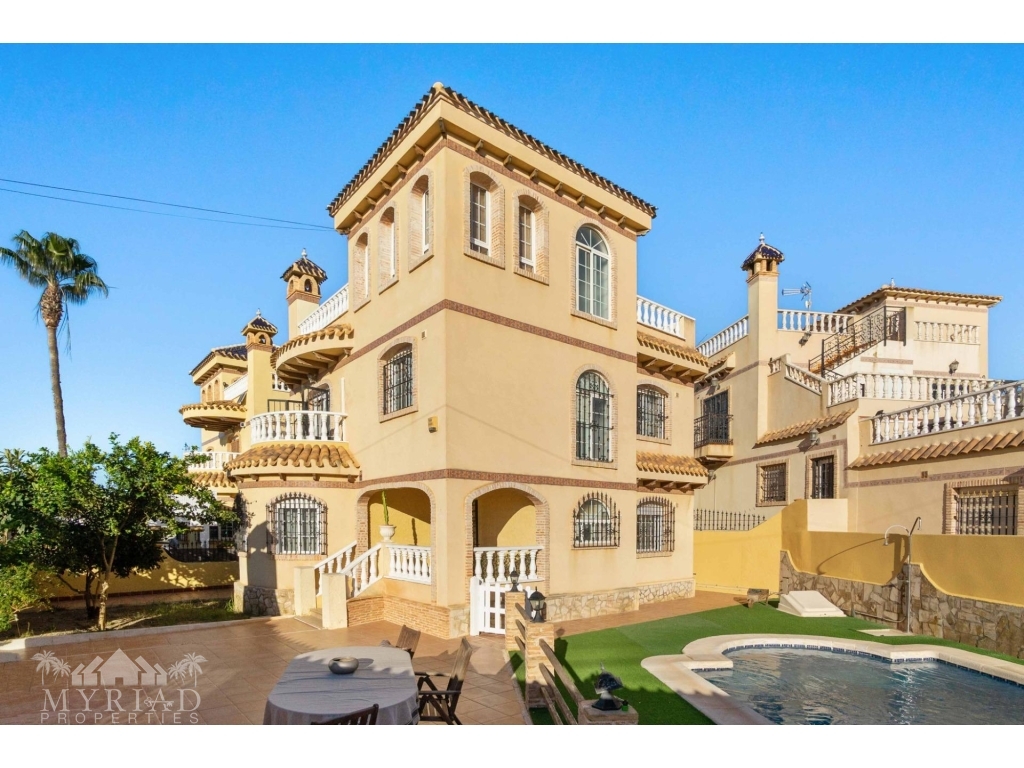 Welcome to your new home in Orihuela Costa, in the charming area of Las Mimosas!~~This spectacular house is presented as the opportunity you have been waiting for to live the life of your dreams in a paradisiacal environment. With a generous area of 161 square meters and a plot of more than 300 square meters, this home is an oasis of space and privacy . In addition, its location just 3000 meters from the beach guarantees you the pleasure of the sea and the sun always at your fingertips.Enjoy the spaciousness of this 5 bedroom home, with the advantage of a room on the ground floor for added comfort. On this floor we also find a bathroom. The first floor offers 3 bedrooms and 2 bathrooms, 1 en suite. On the top floor we find the fifth bedroom very bright.~~This property is ready for you to move in and feel at home from the first moment. The equipped kitchen will allow you to give free rein to your culinary creativity, and the south-east orientation provides you with incomparable natural luminosity throughout the day. The additional amenities of this house are countless. Enjoy the convenience of running water, the comfort of air conditioning and the security of an alarm system. Built-in wardrobes, a pantry and a laundry room make it easy to organize your daily life. The house comes fully furnished, meaning you can move in without complications and start enjoying your spaces from day one. The garden, with its trees and a barbecue area, becomes the perfect setting for your family gatherings and outdoor moments. Relax and immerse yourself in the waters of your private pool or join the community in the community pool.~~The solarium offers you a corner of tranquility for your moments of reflection, while the clear views and the Mediterranean breeze caress your soul. The location of this house is simply exceptional, with shopping centers, hospitals, parks, supermarkets and children's areas nearby , which makes everyday life extremely comfortable.Community fees are only 402 euros per year, which guarantees the impeccable maintenance of the common areas.In short, this house in Orihuela Costa is much more than a property ; It is a lifestyle.~~A life of comfort, beauty and tranquility awaits you here. Don't miss this opportunity and contact us today to visit your new home!