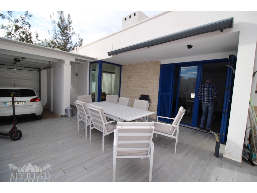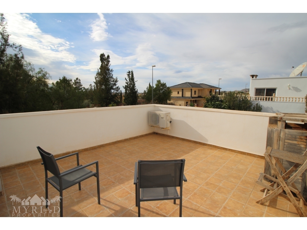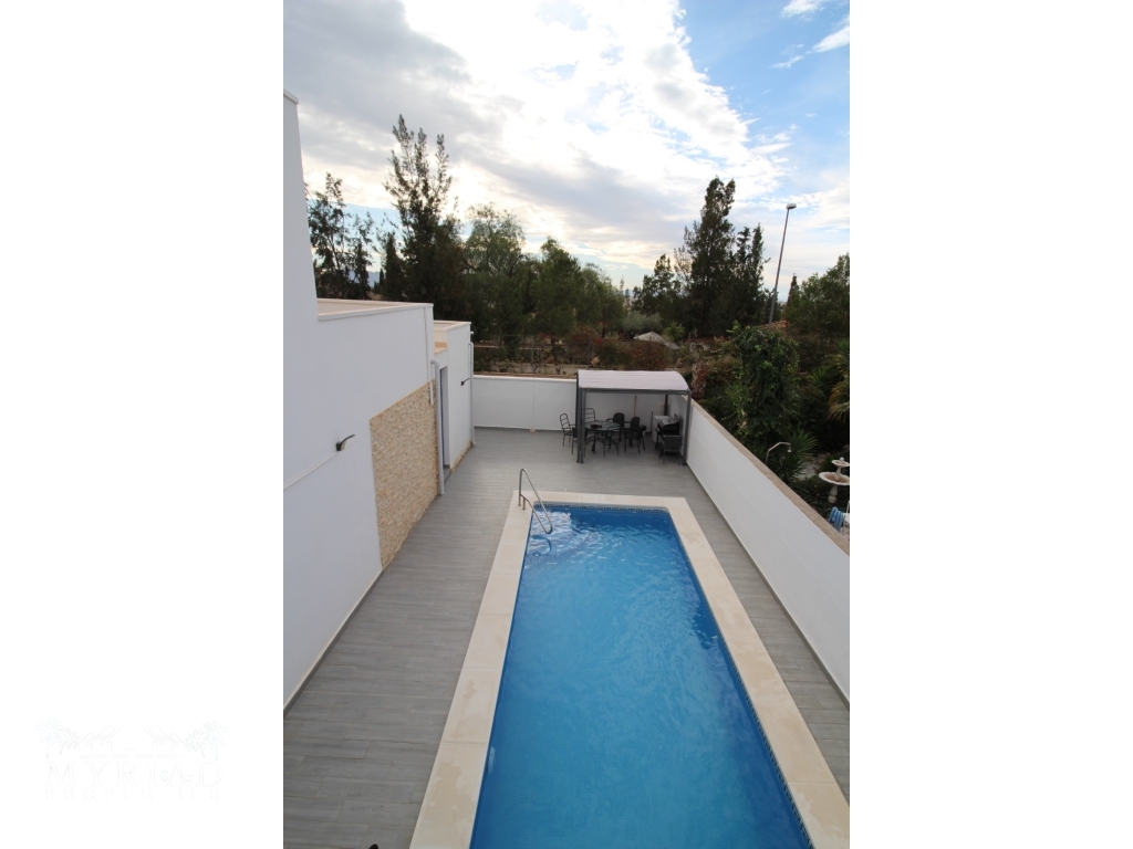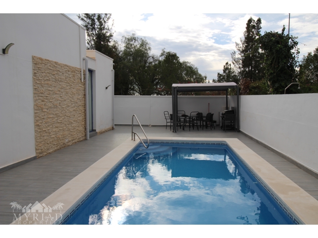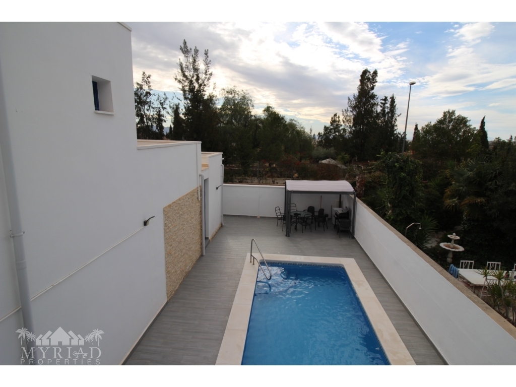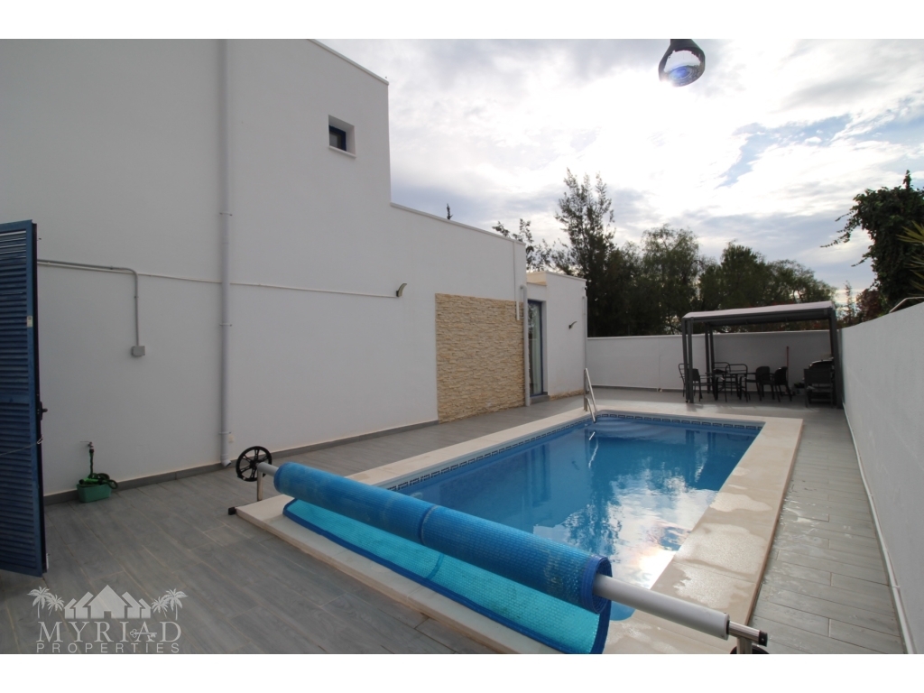 Beautiful modern style villa located in a very quiet residential area 1 km from the spa and 2 kms from the town of Fortuna with all amenities. It consists on the ground floor of a large living room, kitchen and dining room, 2 bedrooms with fitted wardrobes, bathroom and storage. Upstairs there are 2 additional bedrooms, each with terrace and a second bathroom. The outdoor areas are fully tiled for easy maintenance. This beautiful villa has all modern comforts and much more. It is connected to the drinking water network, the electricity network but also has a brand new photovoltaic system with lithium batteries (10KW). There is fiber optic for internet, a heat pump to heat the pool, solar screens on each facade, air conditioning units in all rooms, an extendable terrace cover, a swimming pool tarp (new) , surveillance cameras, It should also be noted that the pool was refurbished 2 months ago. There also is a community pool 200 m away At 25 minutes from the beautiful city of Murcia, 45 minutes from the airport and beaches.