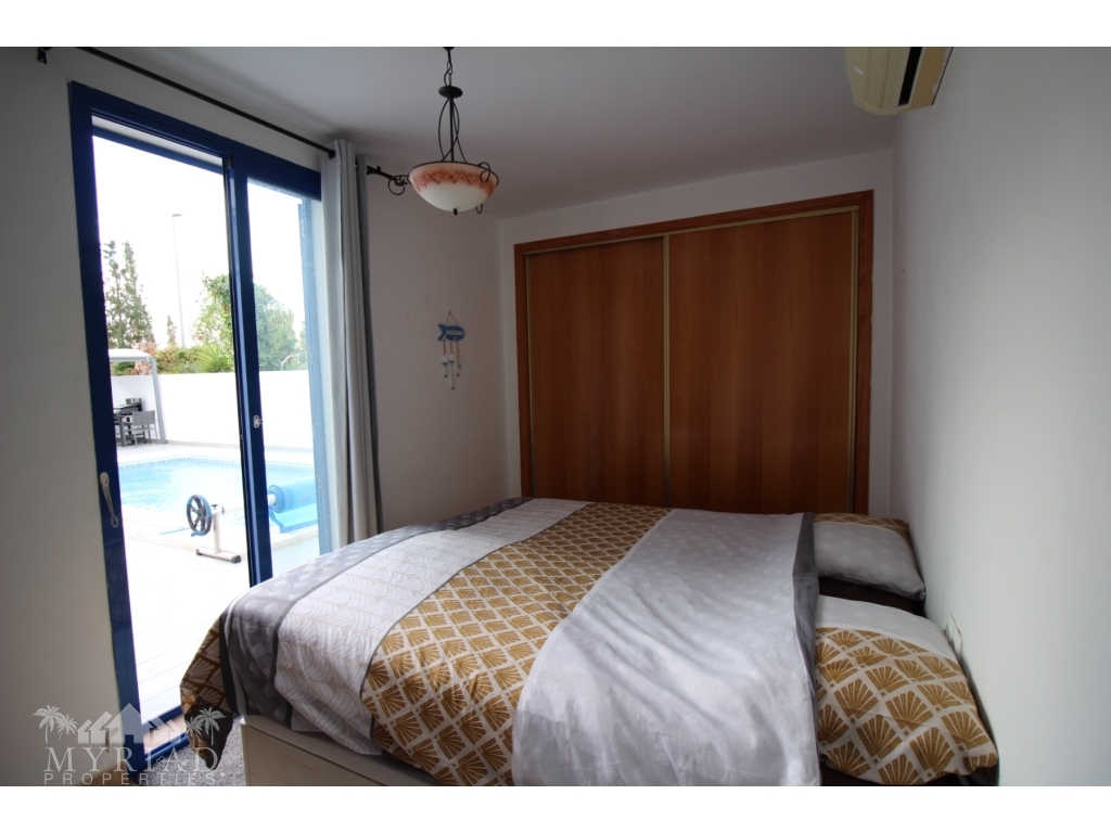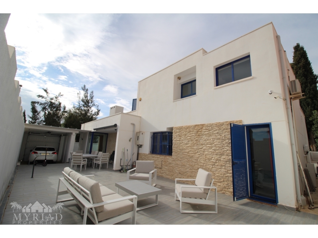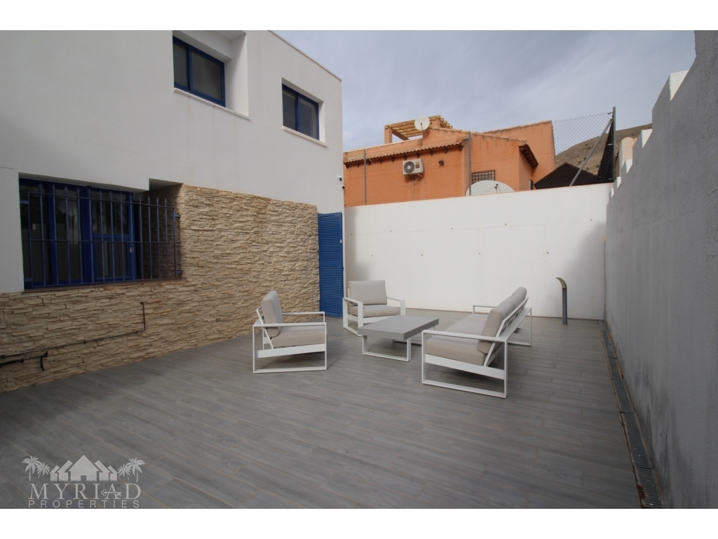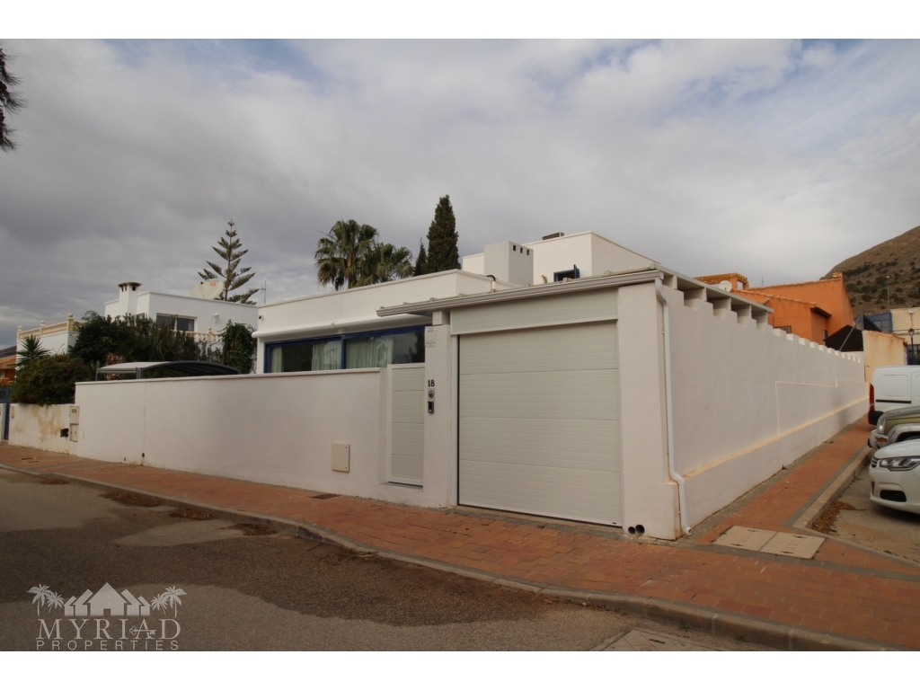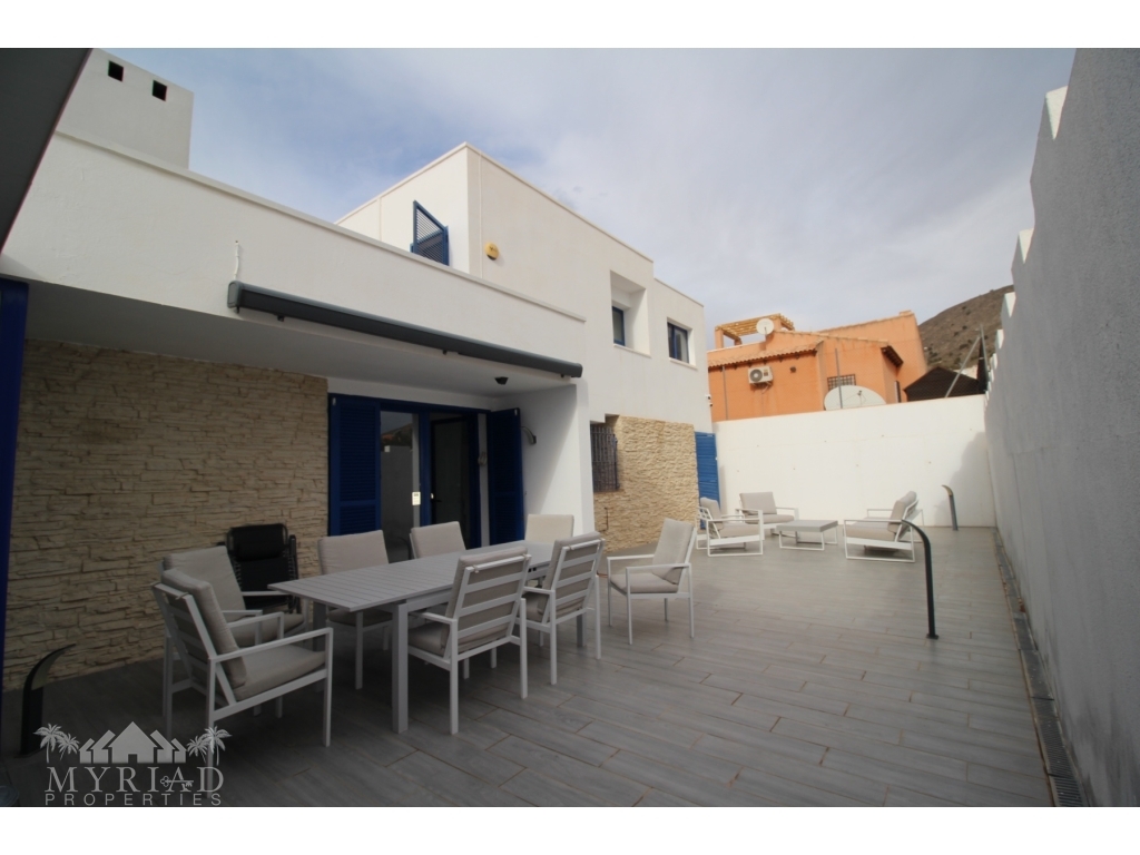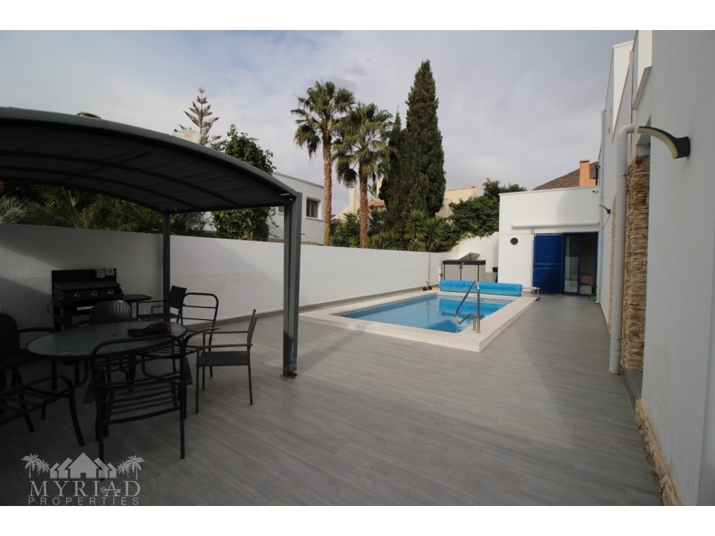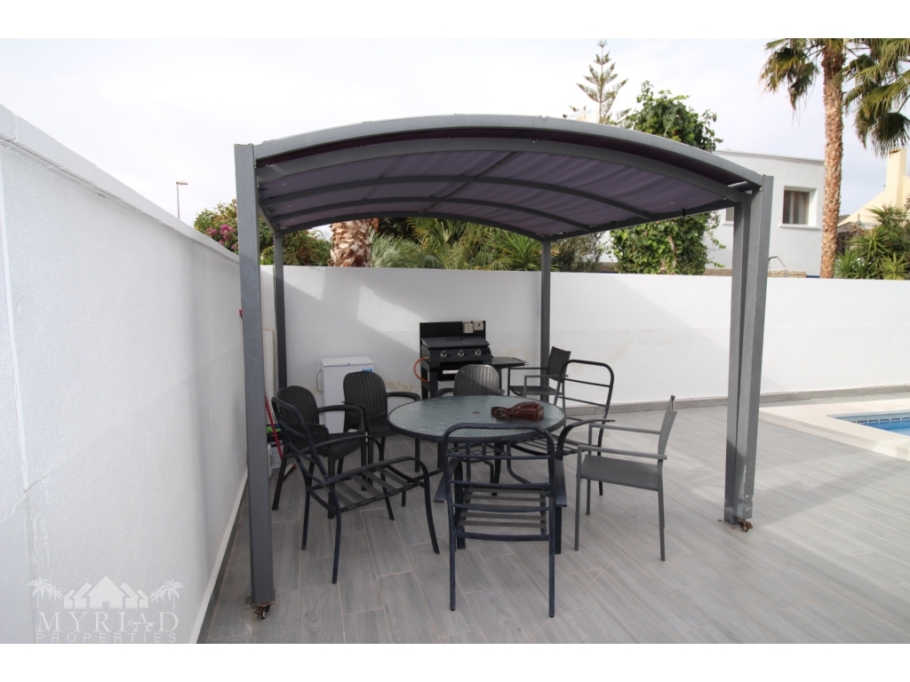 Beautiful modern style villa located in a very quiet residential area 1 km from the spa and 2 kms from the town of Fortuna with all amenities. It consists on the ground floor of a large living room, kitchen and dining room, 2 bedrooms with fitted wardrobes, bathroom and storage. Upstairs there are 2 additional bedrooms, each with terrace and a second bathroom. The outdoor areas are fully tiled for easy maintenance. This beautiful villa has all modern comforts and much more. It is connected to the drinking water network, the electricity network but also has a brand new photovoltaic system with lithium batteries (10KW). There is fiber optic for internet, a heat pump to heat the pool, solar screens on each facade, air conditioning units in all rooms, an extendable terrace cover, a swimming pool tarp (new) , surveillance cameras, It should also be noted that the pool was refurbished 2 months ago. There also is a community pool 200 m away At 25 minutes from the beautiful city of Murcia, 45 minutes from the airport and beaches.