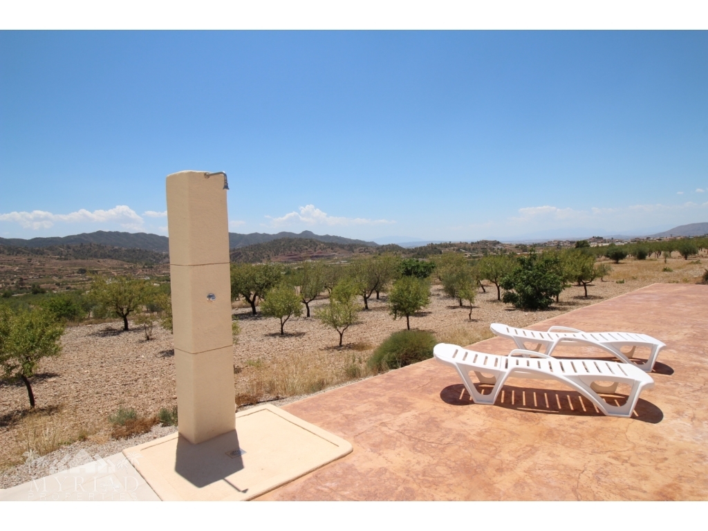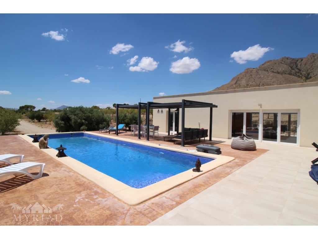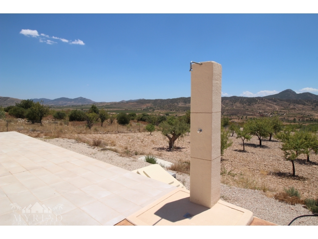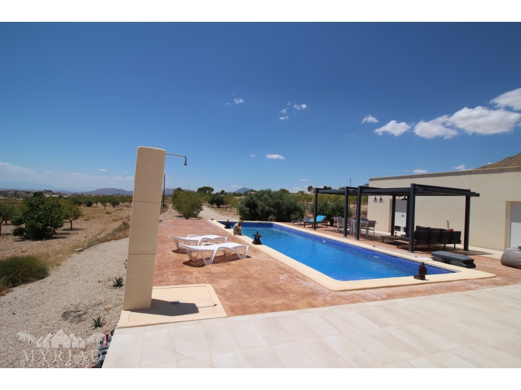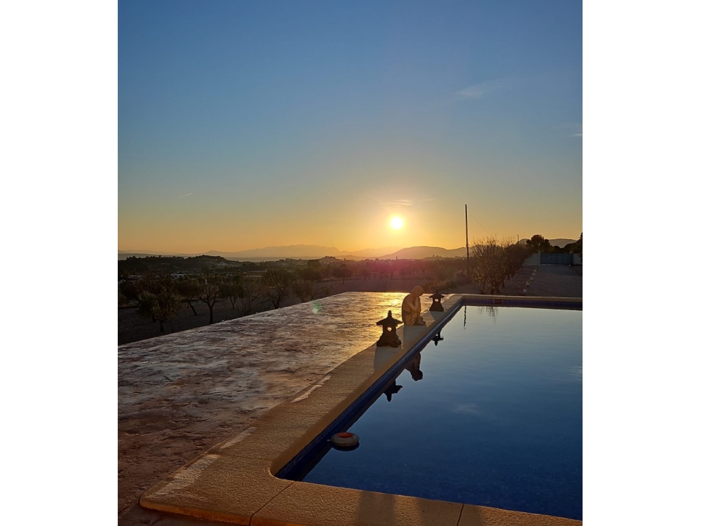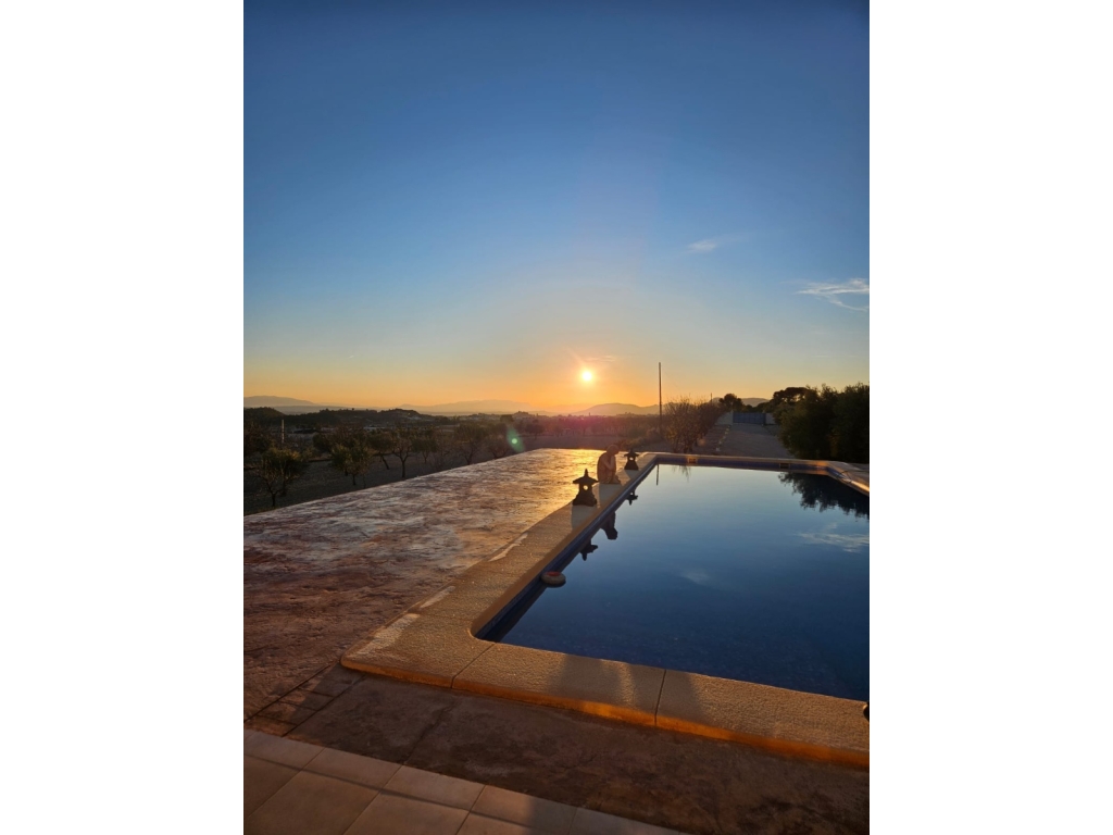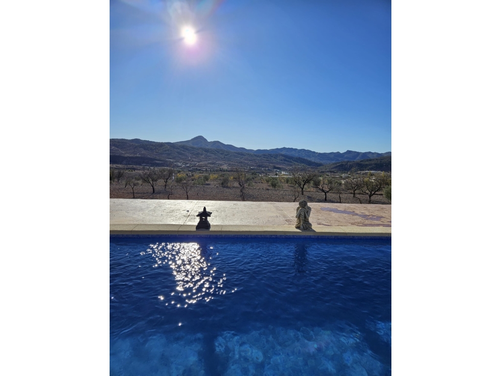 This property is located high up in a quiet location with extraordinary views of the mountains and the valley of Hondon. The land of more than 12000 m2 is planted with many olive, almond and fig trees. There is still plenty of room for other fruit trees. The villa built only 4 years ago is almost new since occupied only a few weeks during school holidays. It consists of an entrance hall, a living space (living room/ dining room/ open kitchen) of 70m2 with 2 bay windows each overlooking a terrace. There is also a third terrace on the side to enjoy the sun from breakfast. There are 4 bedrooms of beautiful dimensions and 3 bathrooms, 2 of which are directly en suite. One of the rooms is located at the end of the building and is completely independent. On the front, a large terrace overlooks the magnificent swimming pool (12,5x4 m) heated by a heat pump and offers truly incredible views. On this terrace is a pergola to enjoy the landscape while being in the shade. This house enjoys all modern comforts: water, internet with fiber optics, centralized hot/cold air conditioning, ceiling fan, alarm system with peripheral detectors, one gaz boiler and one elecgtrci boiler brand new.. It can be connected to the electrical grid that runs right in front of it, but it is completely autonomous thanks to photovoltaic panels and lithium batteries (10kw). It will be sold mostly furnished (inventory available) Energy certificate A. The village of Macisvenda with all amenities is less than 5 minutes away, the beaches 45 minutes away, the airports of Murcia or Alicante 50 minutes and the superb city of Murcia 35 minutes. You really have to come and see to realize the beauty of the place