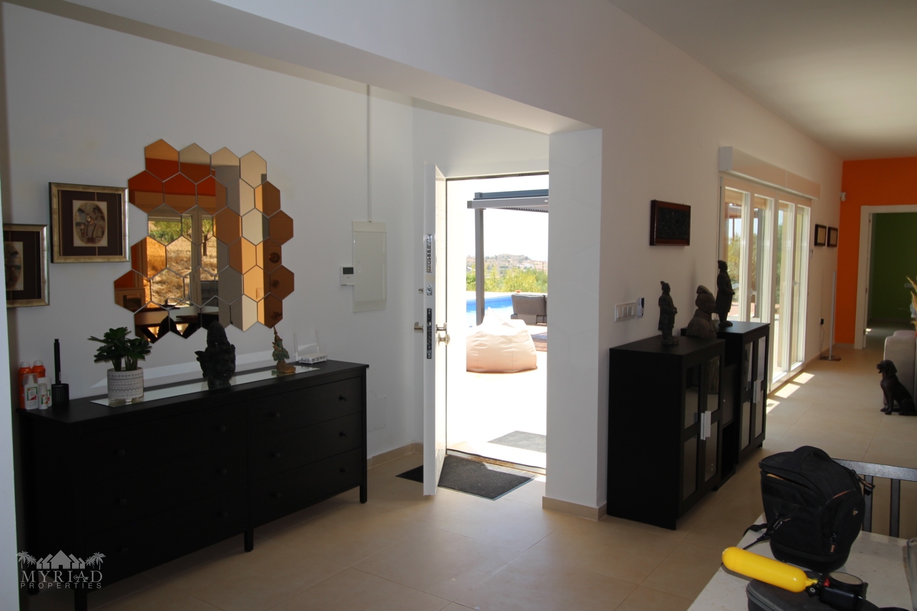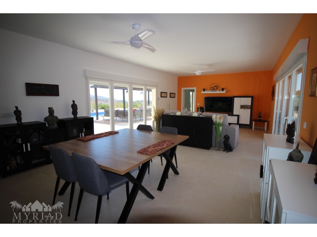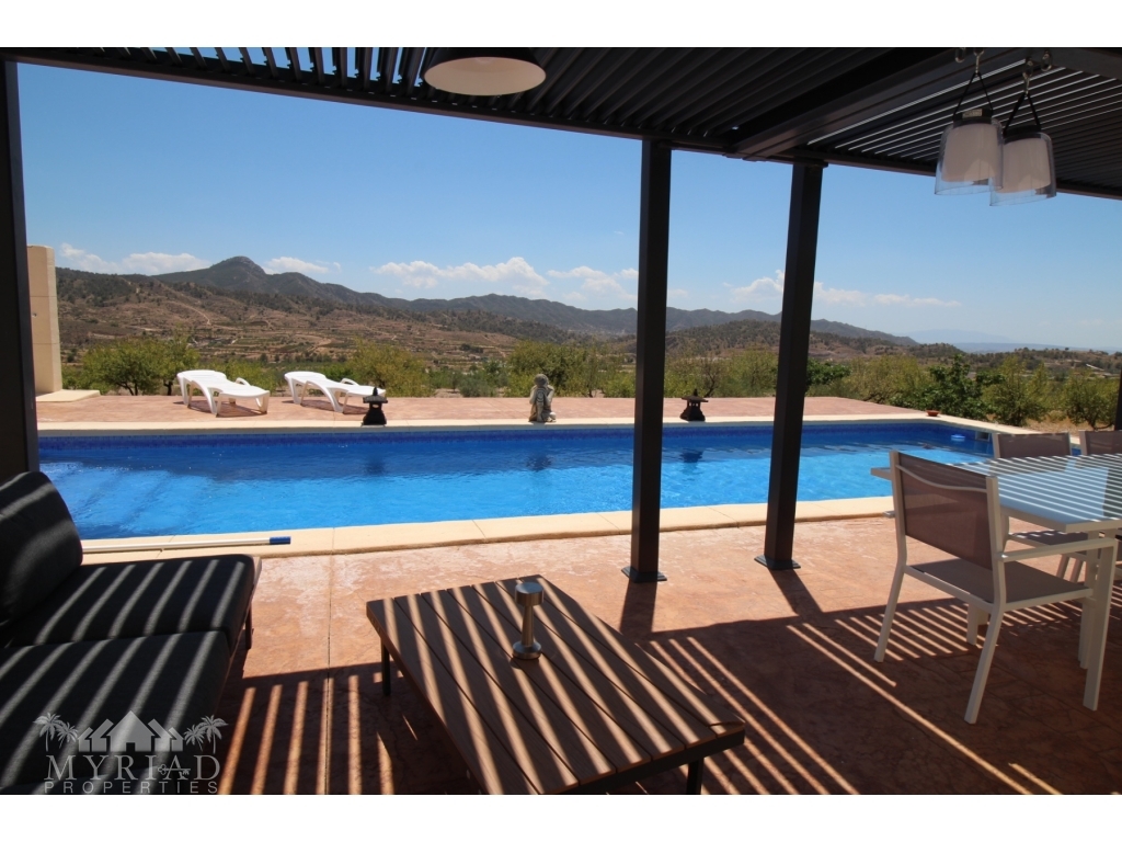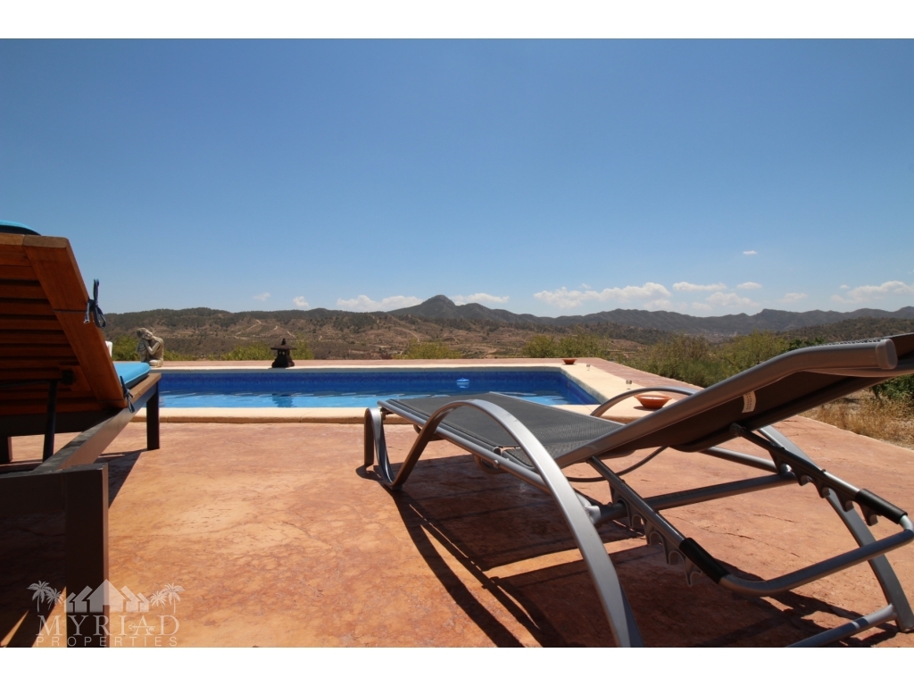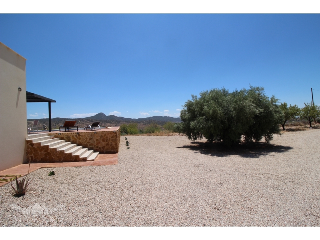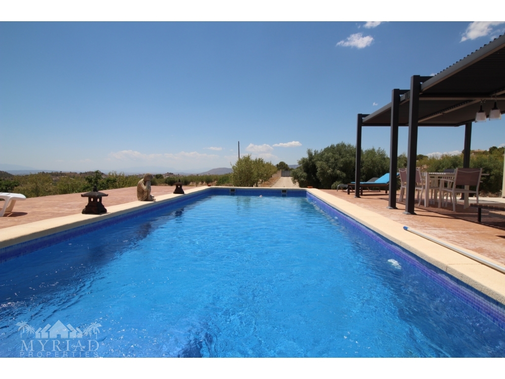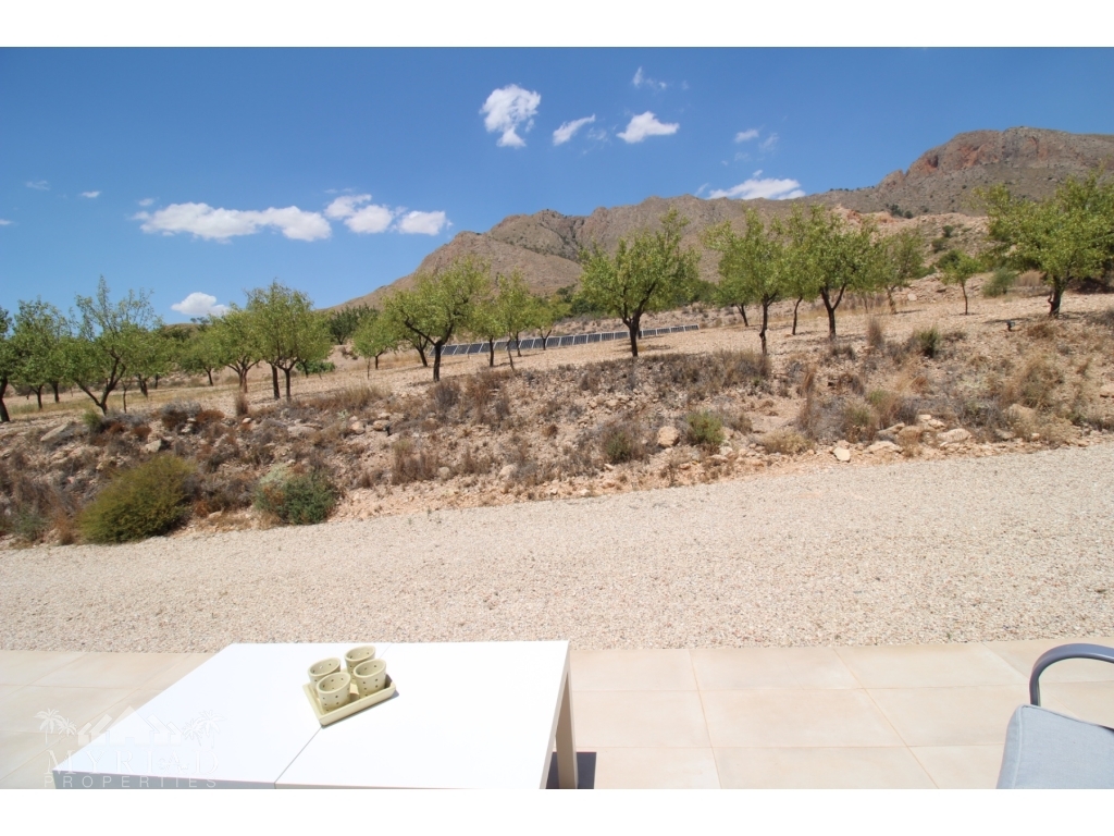 This property is located high up in a quiet location with extraordinary views of the mountains and the valley of Hondon. The land of more than 12000 m2 is planted with many olive, almond and fig trees. There is still plenty of room for other fruit trees. The villa built only 4 years ago is almost new since occupied only a few weeks during school holidays. It consists of an entrance hall, a living space (living room/ dining room/ open kitchen) of 70m2 with 2 bay windows each overlooking a terrace. There is also a third terrace on the side to enjoy the sun from breakfast. There are 4 bedrooms of beautiful dimensions and 3 bathrooms, 2 of which are directly en suite. One of the rooms is located at the end of the building and is completely independent. On the front, a large terrace overlooks the magnificent swimming pool (12,5x4 m) heated by a heat pump and offers truly incredible views. On this terrace is a pergola to enjoy the landscape while being in the shade. This house enjoys all modern comforts: water, internet with fiber optics, centralized hot/cold air conditioning, ceiling fan, alarm system with peripheral detectors, one gaz boiler and one elecgtrci boiler brand new.. It can be connected to the electrical grid that runs right in front of it, but it is completely autonomous thanks to photovoltaic panels and lithium batteries (10kw). It will be sold mostly furnished (inventory available) Energy certificate A. The village of Macisvenda with all amenities is less than 5 minutes away, the beaches 45 minutes away, the airports of Murcia or Alicante 50 minutes and the superb city of Murcia 35 minutes. You really have to come and see to realize the beauty of the place