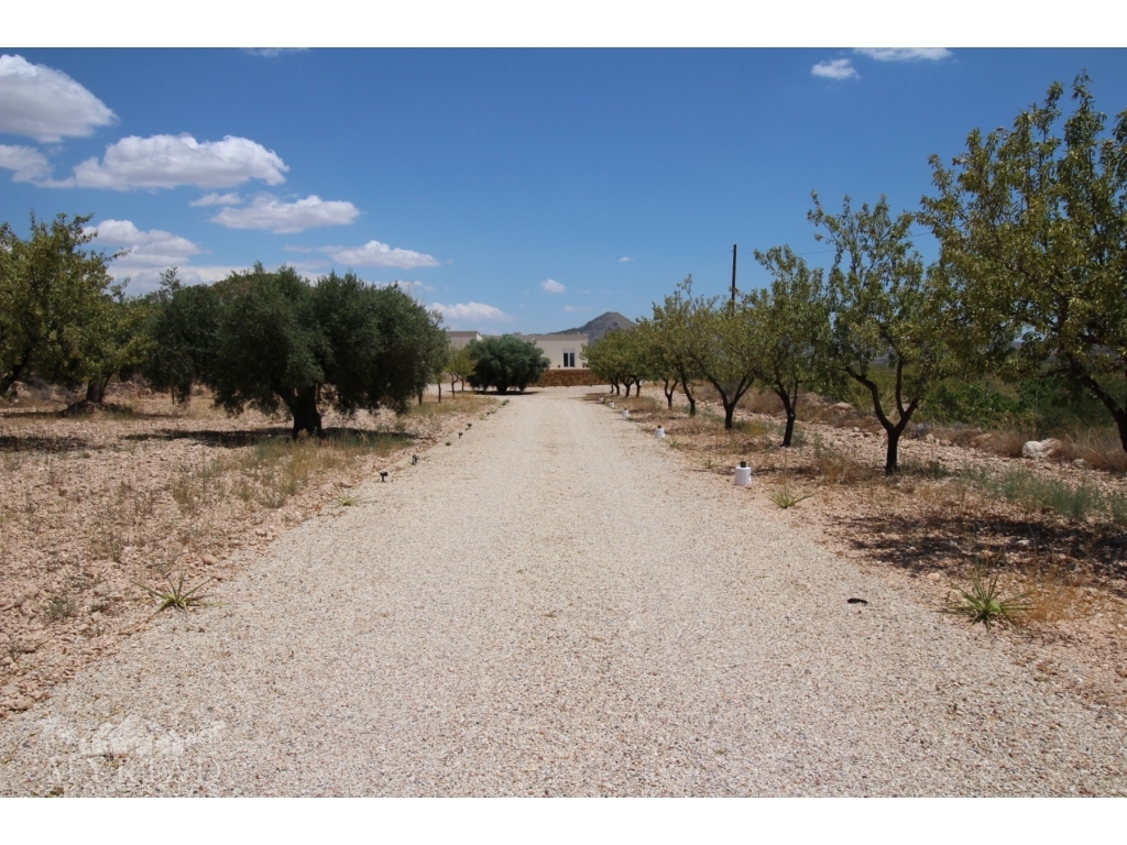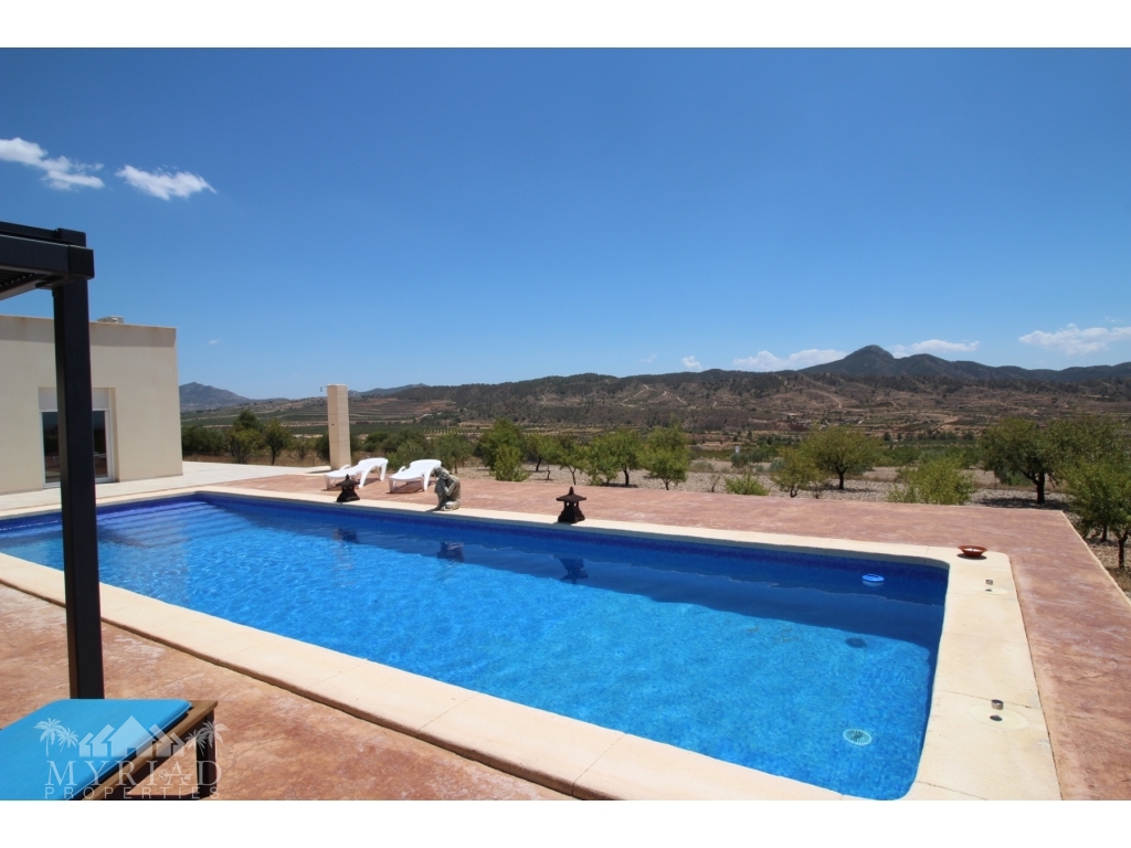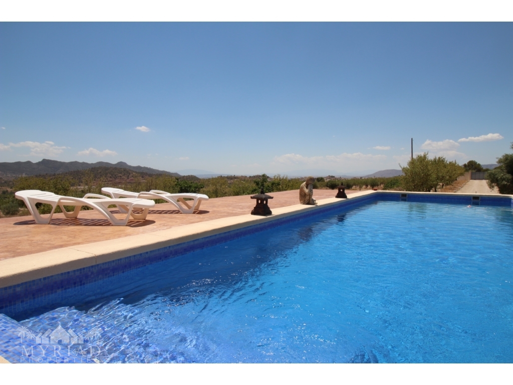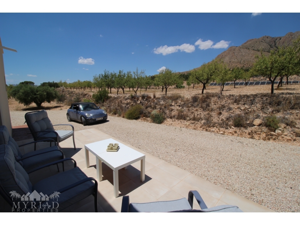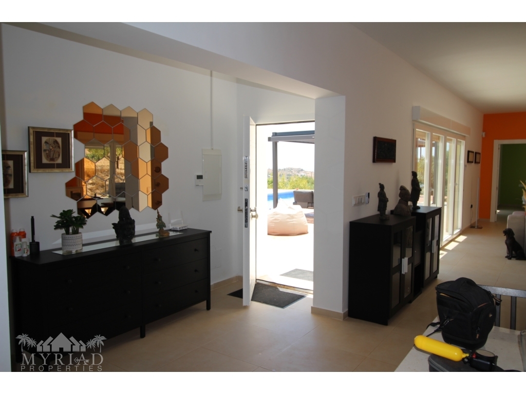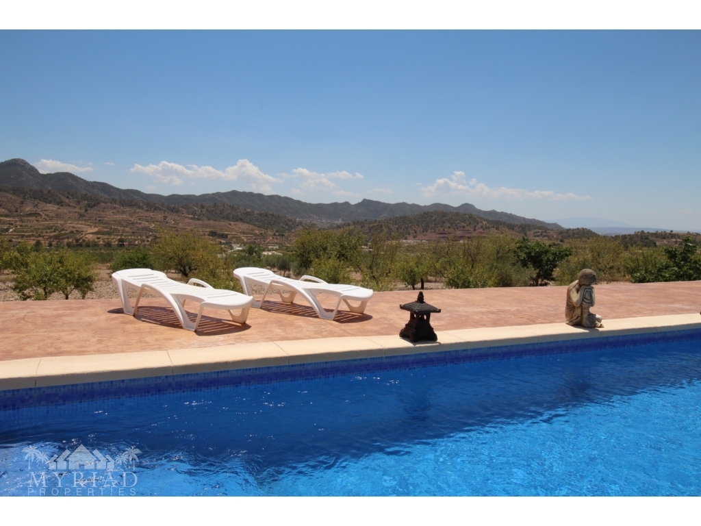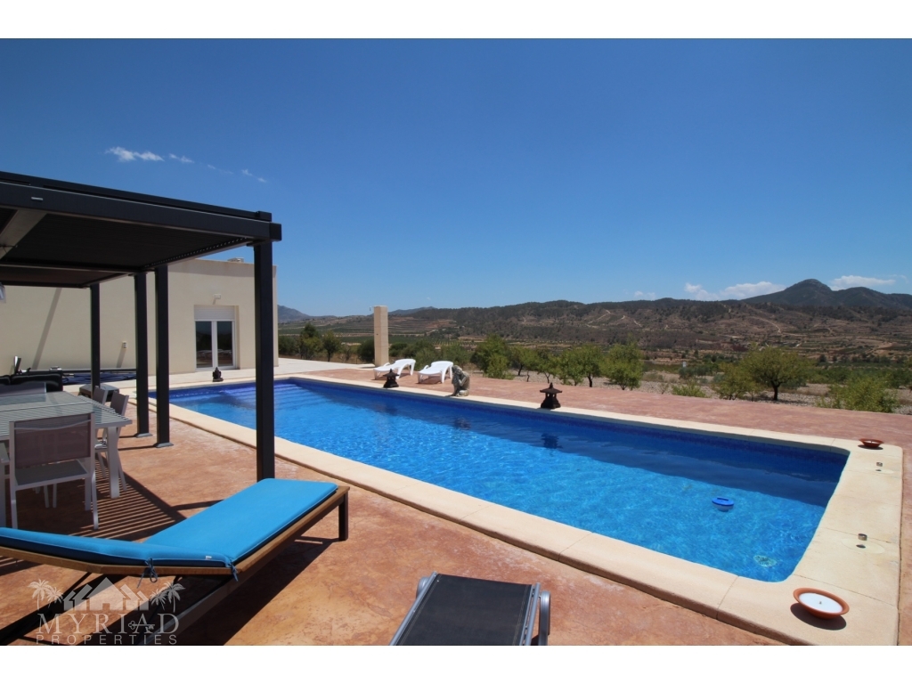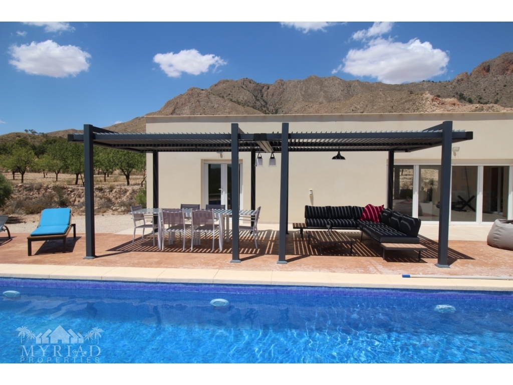 This property is located high up in a quiet location with extraordinary views of the mountains and the valley of Hondon. The land of more than 12000 m2 is planted with many olive, almond and fig trees. There is still plenty of room for other fruit trees. The villa built only 4 years ago is almost new since occupied only a few weeks during school holidays. It consists of an entrance hall, a living space (living room/ dining room/ open kitchen) of 70m2 with 2 bay windows each overlooking a terrace. There is also a third terrace on the side to enjoy the sun from breakfast. There are 4 bedrooms of beautiful dimensions and 3 bathrooms, 2 of which are directly en suite. One of the rooms is located at the end of the building and is completely independent. On the front, a large terrace overlooks the magnificent swimming pool (12,5x4 m) heated by a heat pump and offers truly incredible views. On this terrace is a pergola to enjoy the landscape while being in the shade. This house enjoys all modern comforts: water, internet with fiber optics, centralized hot/cold air conditioning, ceiling fan, alarm system with peripheral detectors, one gaz boiler and one elecgtrci boiler brand new.. It can be connected to the electrical grid that runs right in front of it, but it is completely autonomous thanks to photovoltaic panels and lithium batteries (10kw). It will be sold mostly furnished (inventory available) Energy certificate A. The village of Macisvenda with all amenities is less than 5 minutes away, the beaches 45 minutes away, the airports of Murcia or Alicante 50 minutes and the superb city of Murcia 35 minutes. You really have to come and see to realize the beauty of the place