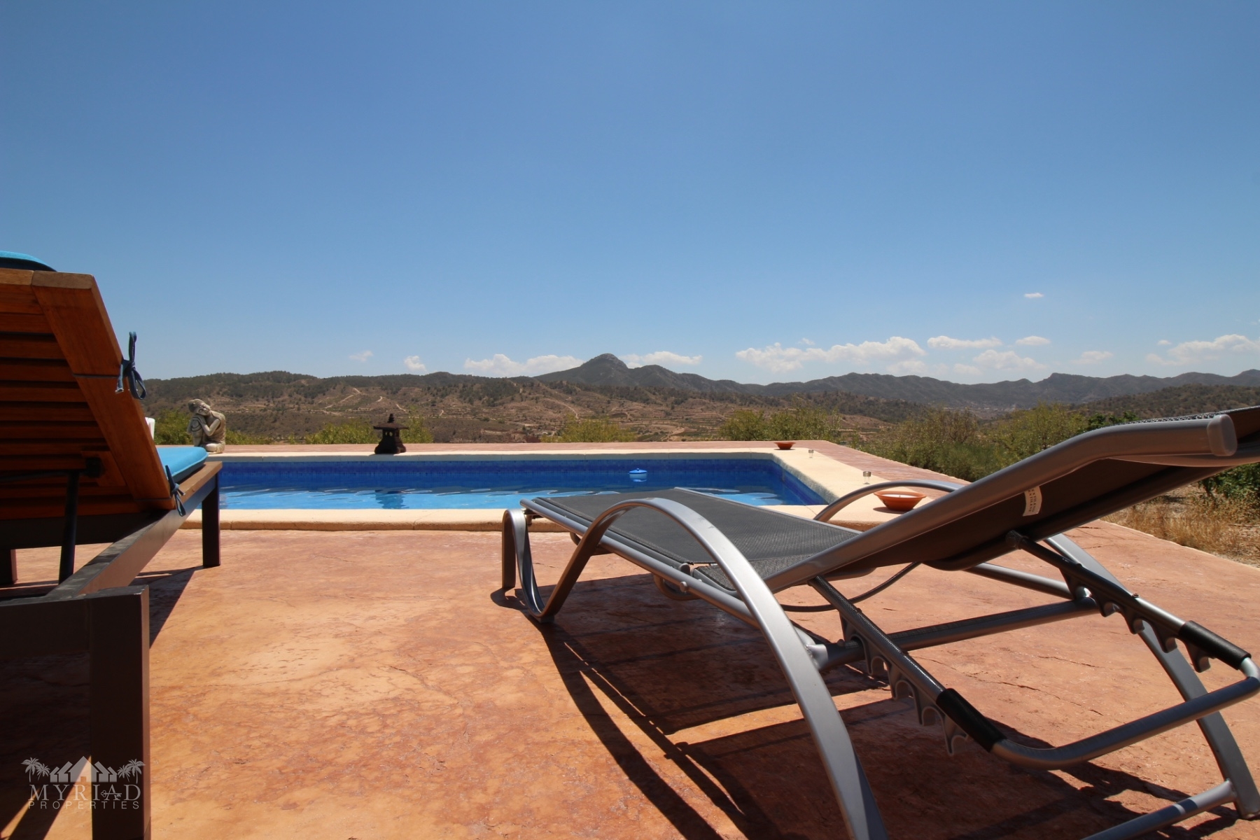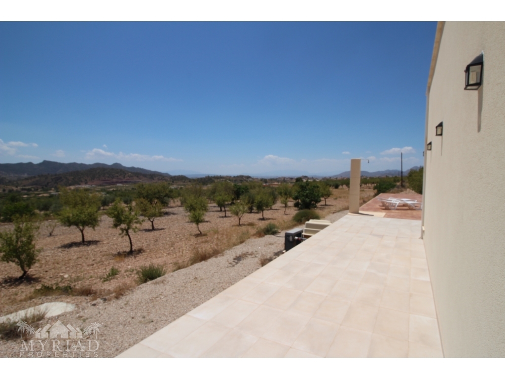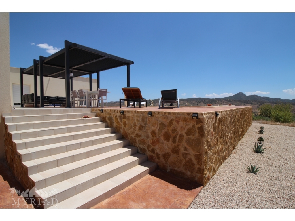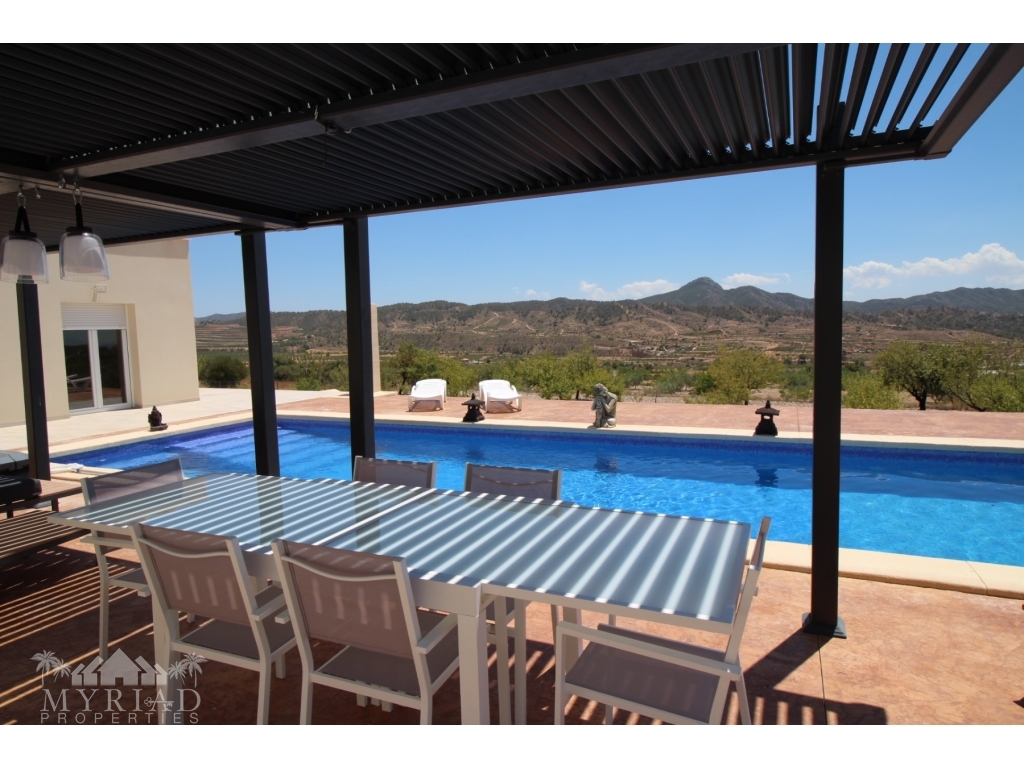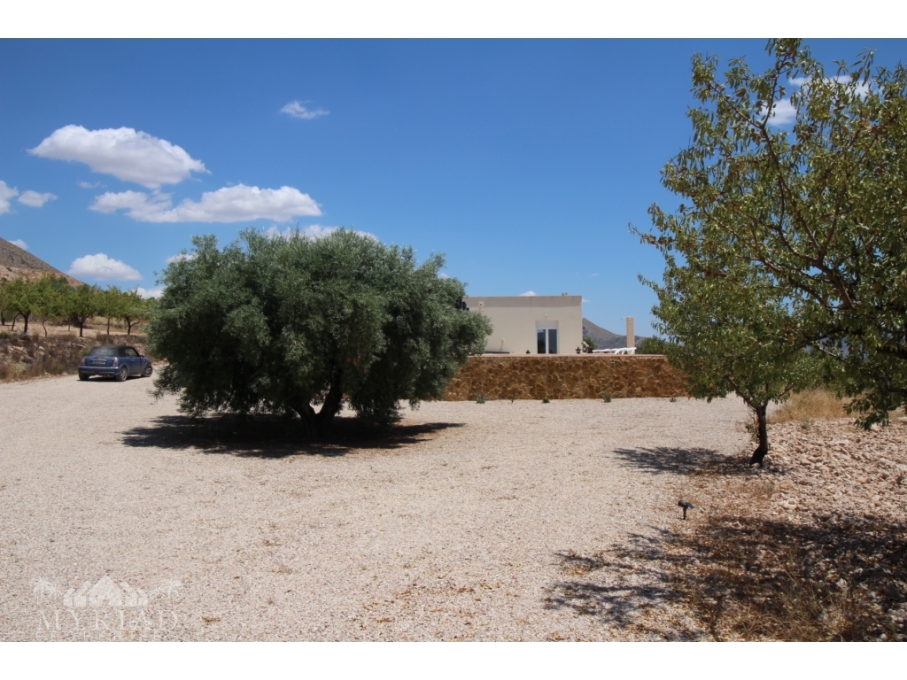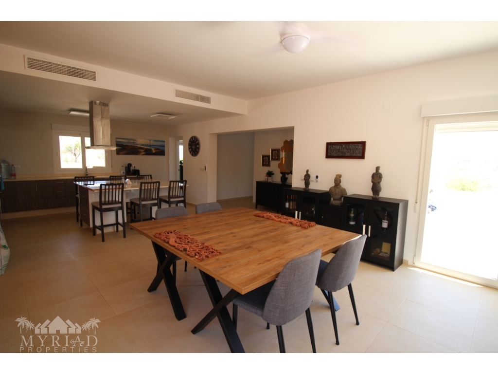 This property is located high up in a quiet location with extraordinary views of the mountains and the valley of Hondon. The land of more than 12000 m2 is planted with many olive, almond and fig trees. There is still plenty of room for other fruit trees. The villa built only 4 years ago is almost new since occupied only a few weeks during school holidays. It consists of an entrance hall, a living space (living room/ dining room/ open kitchen) of 70m2 with 2 bay windows each overlooking a terrace. There is also a third terrace on the side to enjoy the sun from breakfast. There are 4 bedrooms of beautiful dimensions and 3 bathrooms, 2 of which are directly en suite. One of the rooms is located at the end of the building and is completely independent. On the front, a large terrace overlooks the magnificent swimming pool (12,5x4 m) heated by a heat pump and offers truly incredible views. On this terrace is a pergola to enjoy the landscape while being in the shade. This house enjoys all modern comforts: water, internet with fiber optics, centralized hot/cold air conditioning, ceiling fan, alarm system with peripheral detectors, one gaz boiler and one elecgtrci boiler brand new.. It can be connected to the electrical grid that runs right in front of it, but it is completely autonomous thanks to photovoltaic panels and lithium batteries (10kw). It will be sold mostly furnished (inventory available) Energy certificate A. The village of Macisvenda with all amenities is less than 5 minutes away, the beaches 45 minutes away, the airports of Murcia or Alicante 50 minutes and the superb city of Murcia 35 minutes. You really have to come and see to realize the beauty of the place
