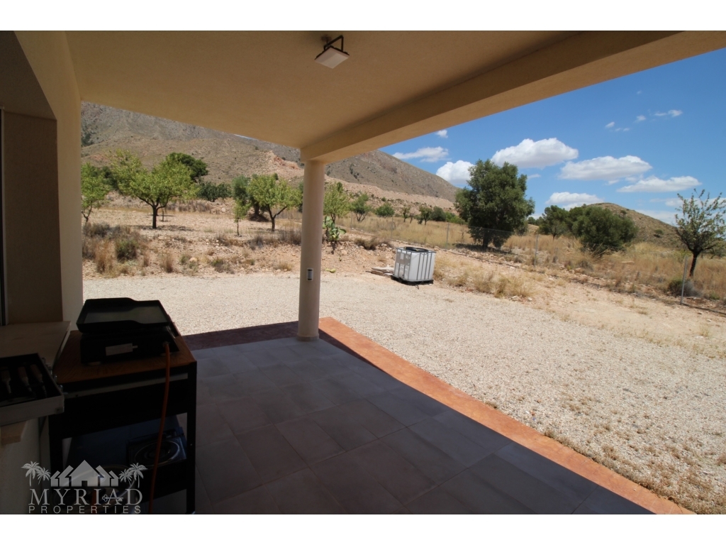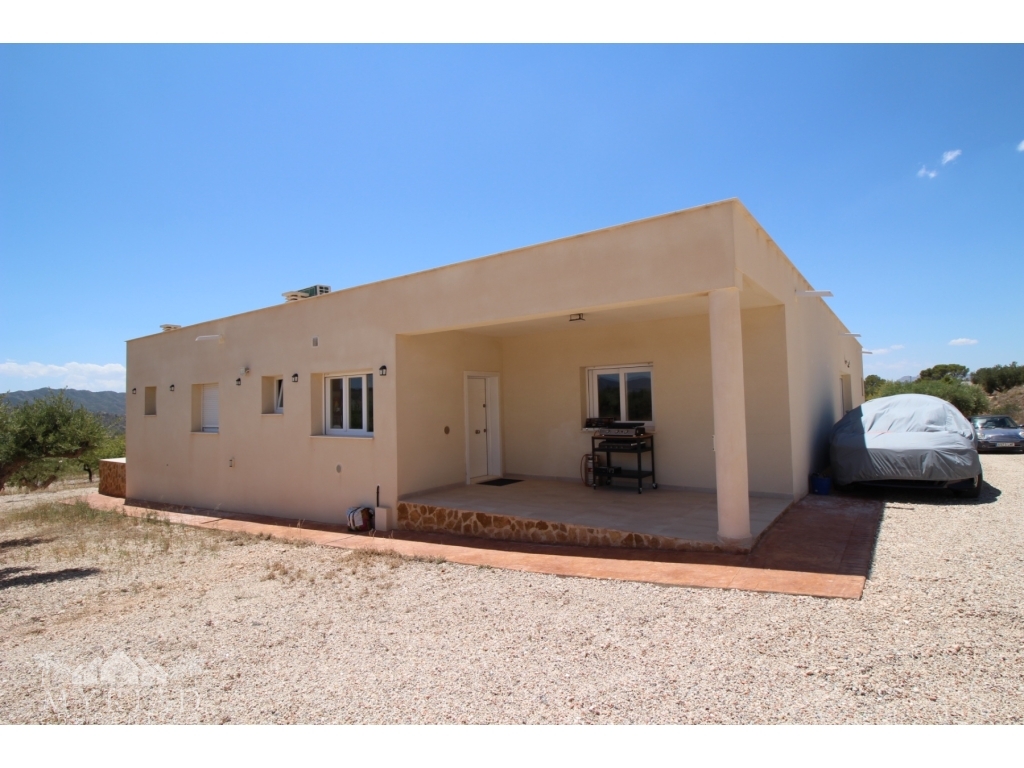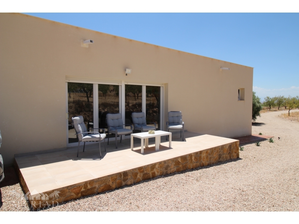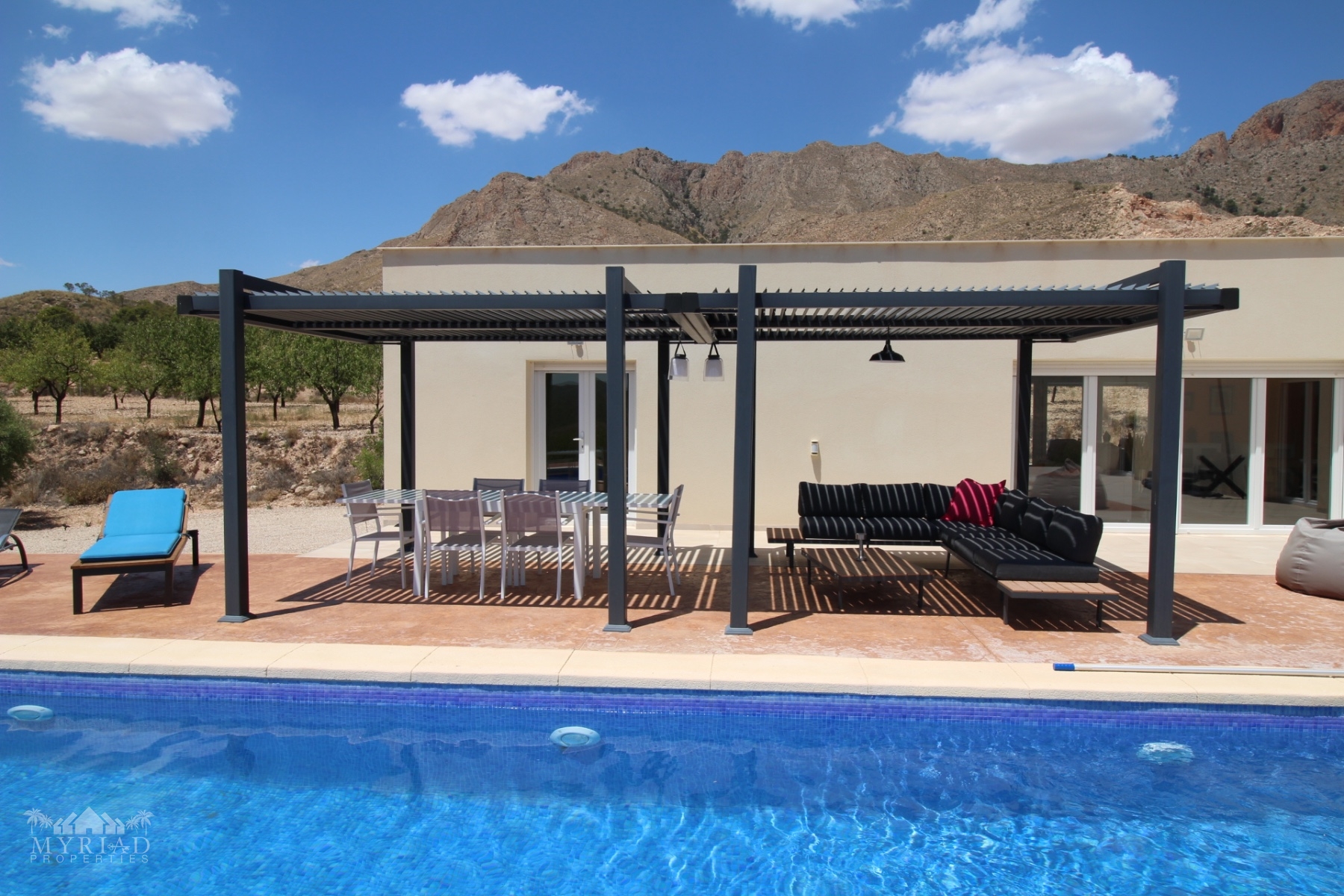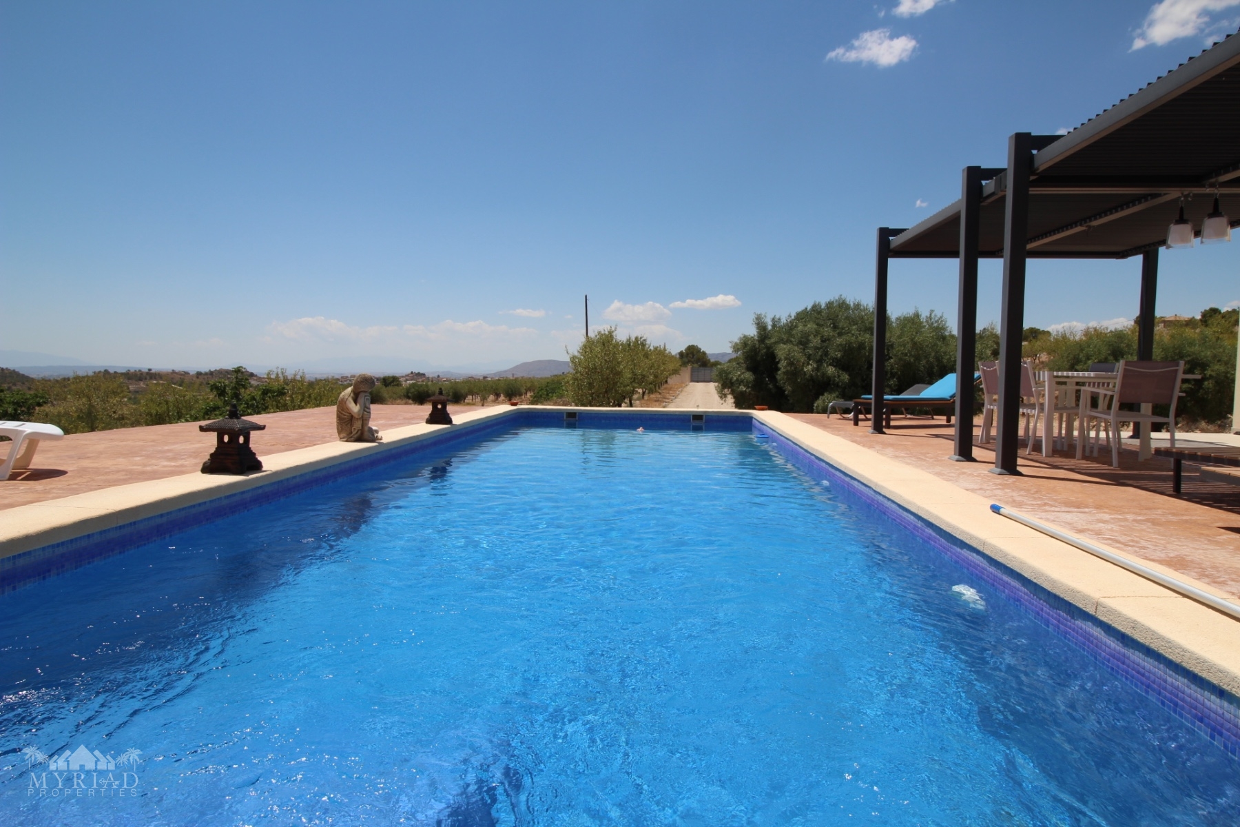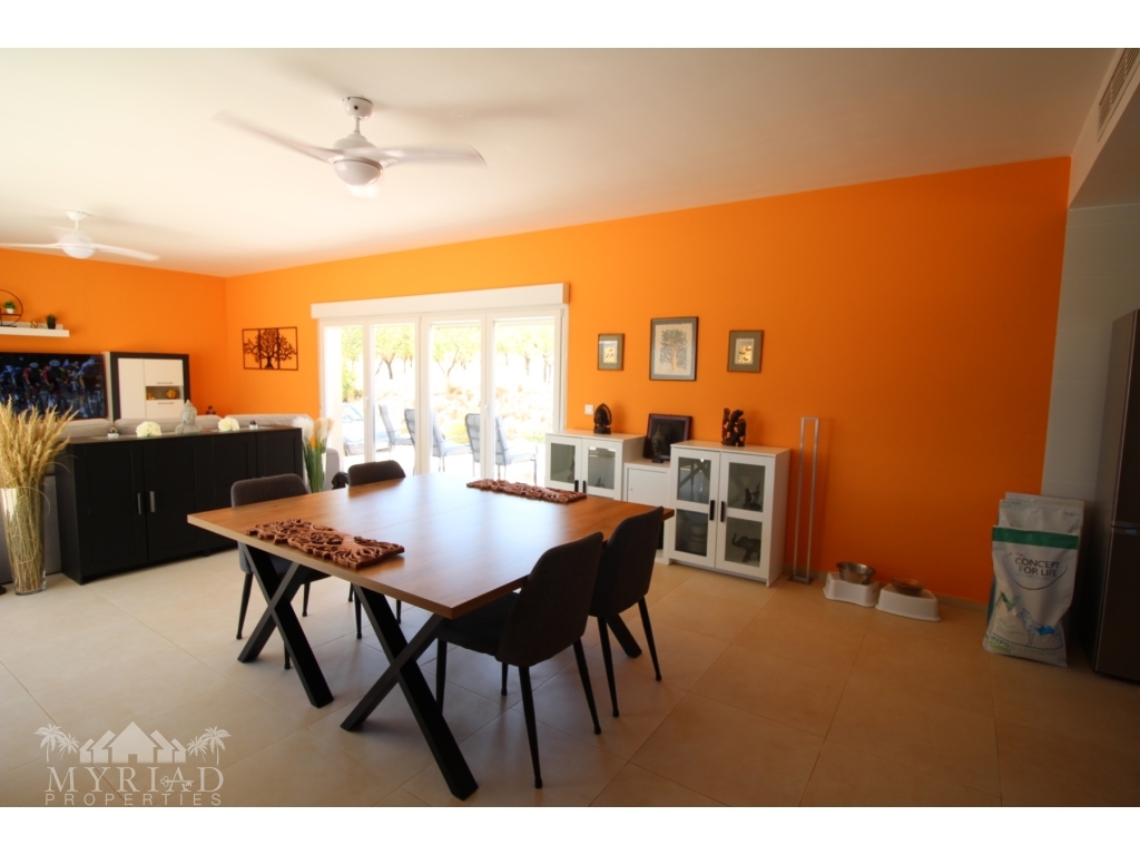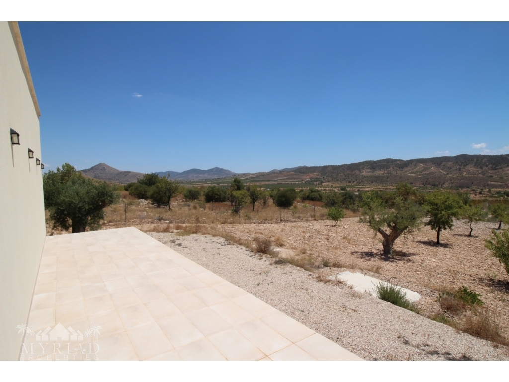 This property is located high up in a quiet location with extraordinary views of the mountains and the valley of Hondon. The land of more than 12000 m2 is planted with many olive, almond and fig trees. There is still plenty of room for other fruit trees. The villa built only 4 years ago is almost new since occupied only a few weeks during school holidays. It consists of an entrance hall, a living space (living room/ dining room/ open kitchen) of 70m2 with 2 bay windows each overlooking a terrace. There is also a third terrace on the side to enjoy the sun from breakfast. There are 4 bedrooms of beautiful dimensions and 3 bathrooms, 2 of which are directly en suite. One of the rooms is located at the end of the building and is completely independent. On the front, a large terrace overlooks the magnificent swimming pool (12,5x4 m) heated by a heat pump and offers truly incredible views. On this terrace is a pergola to enjoy the landscape while being in the shade. This house enjoys all modern comforts: water, internet with fiber optics, centralized hot/cold air conditioning, ceiling fan, alarm system with peripheral detectors, one gaz boiler and one elecgtrci boiler brand new.. It can be connected to the electrical grid that runs right in front of it, but it is completely autonomous thanks to photovoltaic panels and lithium batteries (10kw). It will be sold mostly furnished (inventory available) Energy certificate A. The village of Macisvenda with all amenities is less than 5 minutes away, the beaches 45 minutes away, the airports of Murcia or Alicante 50 minutes and the superb city of Murcia 35 minutes. You really have to come and see to realize the beauty of the place