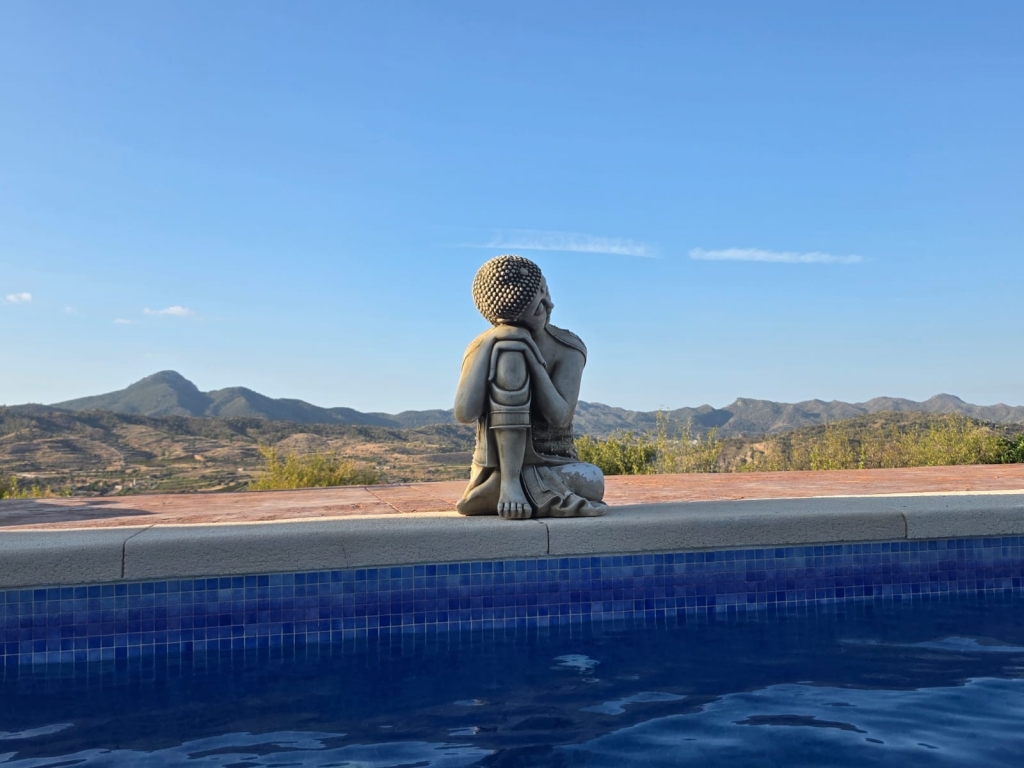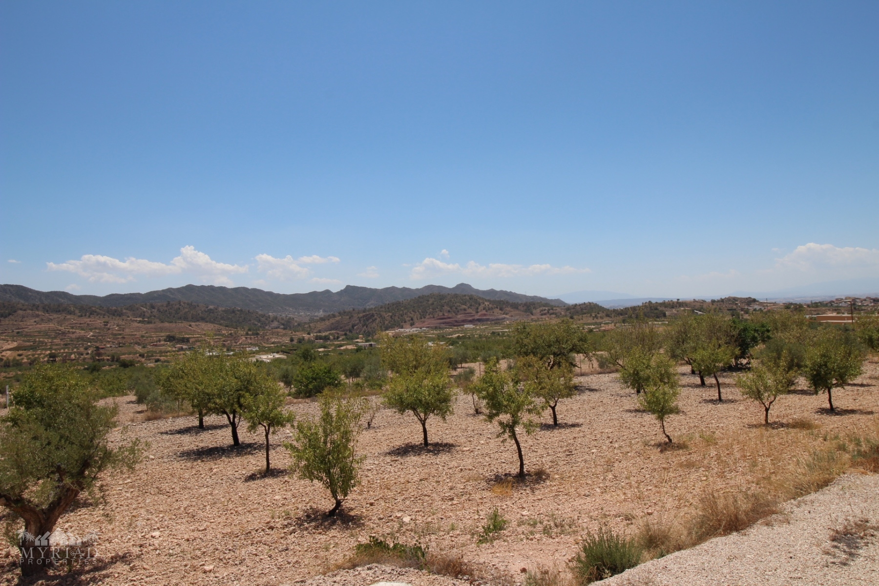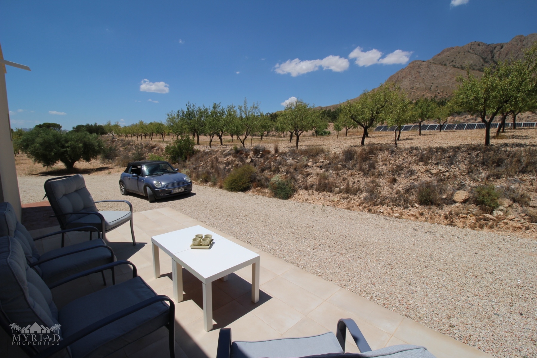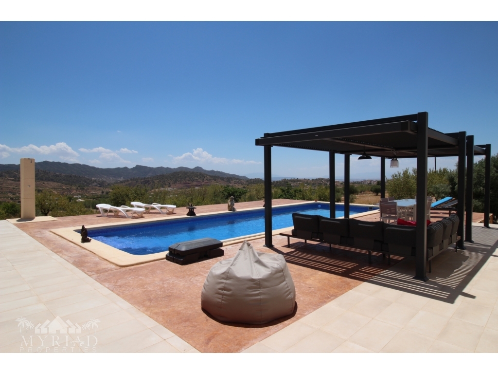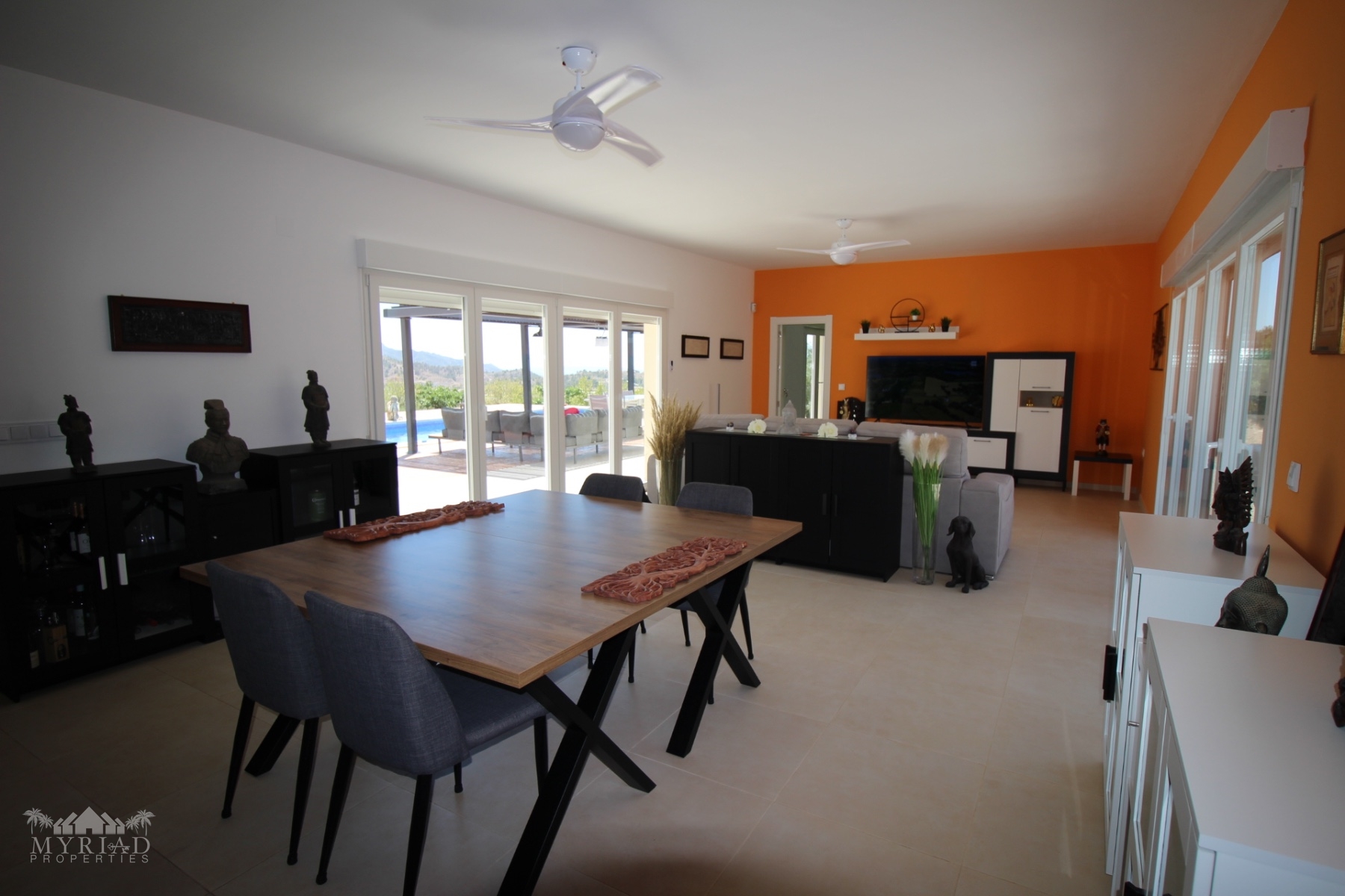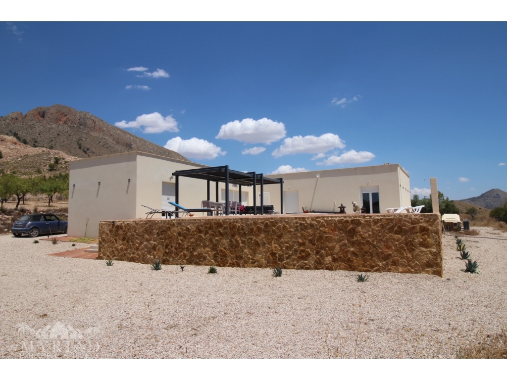 This property is located high up in a quiet location with extraordinary views of the mountains and the valley of Hondon. The land of more than 12000 m2 is planted with many olive, almond and fig trees. There is still plenty of room for other fruit trees. The villa built only 4 years ago is almost new since occupied only a few weeks during school holidays. It consists of an entrance hall, a living space (living room/ dining room/ open kitchen) of 70m2 with 2 bay windows each overlooking a terrace. There is also a third terrace on the side to enjoy the sun from breakfast. There are 4 bedrooms of beautiful dimensions and 3 bathrooms, 2 of which are directly en suite. One of the rooms is located at the end of the building and is completely independent. On the front, a large terrace overlooks the magnificent swimming pool (12,5x4 m) heated by a heat pump and offers truly incredible views. On this terrace is a pergola to enjoy the landscape while being in the shade. This house enjoys all modern comforts: water, internet with fiber optics, centralized hot/cold air conditioning, ceiling fan, alarm system with peripheral detectors, one gaz boiler and one elecgtrci boiler brand new.. It can be connected to the electrical grid that runs right in front of it, but it is completely autonomous thanks to photovoltaic panels and lithium batteries (10kw). It will be sold mostly furnished (inventory available) Energy certificate A. The village of Macisvenda with all amenities is less than 5 minutes away, the beaches 45 minutes away, the airports of Murcia or Alicante 50 minutes and the superb city of Murcia 35 minutes. You really have to come and see to realize the beauty of the place