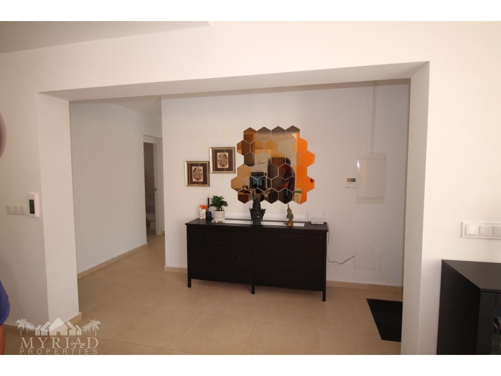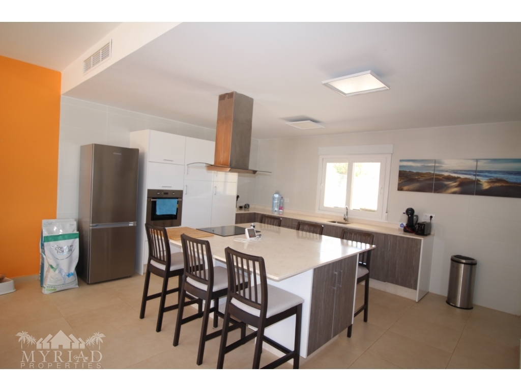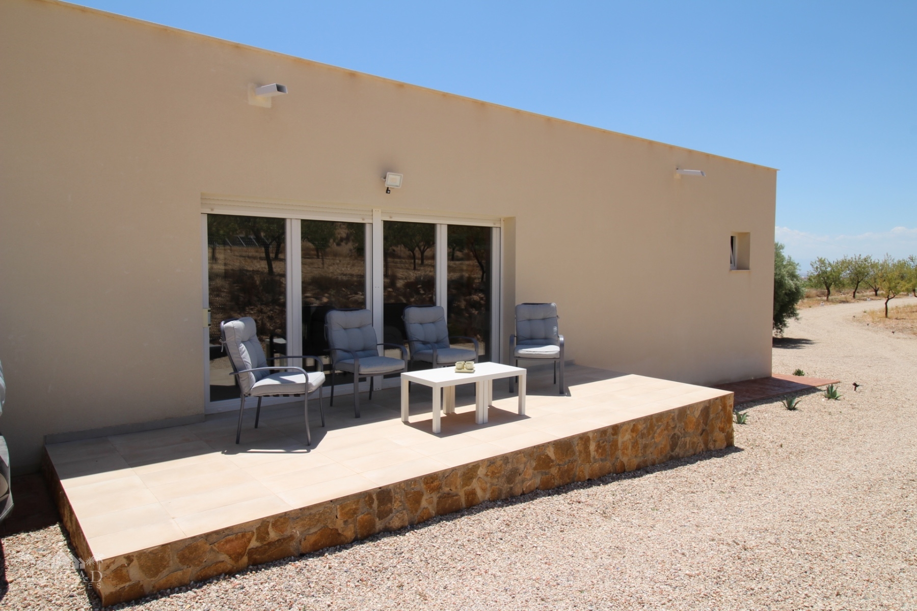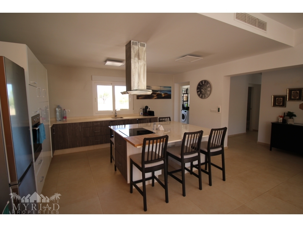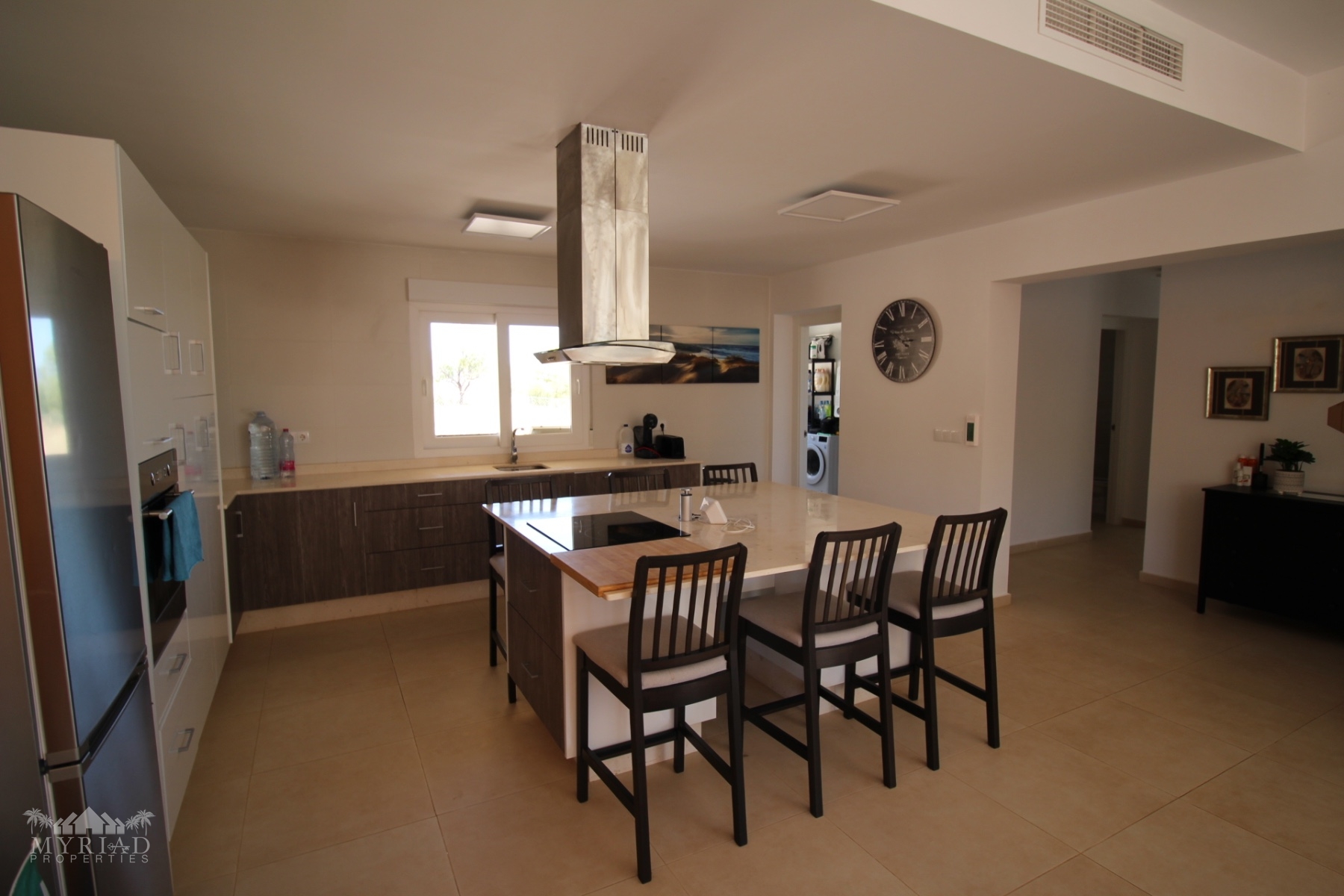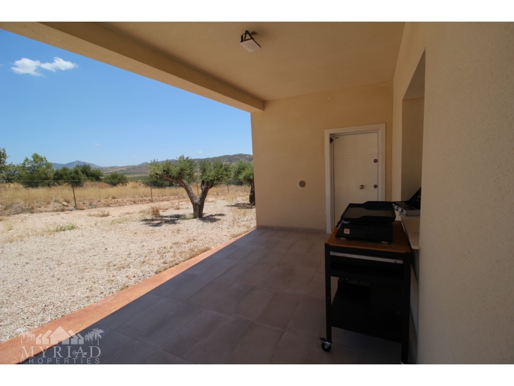 This property is located high up in a quiet location with extraordinary views of the mountains and the valley of Hondon. The land of more than 12000 m2 is planted with many olive, almond and fig trees. There is still plenty of room for other fruit trees. The villa built only 4 years ago is almost new since occupied only a few weeks during school holidays. It consists of an entrance hall, a living space (living room/ dining room/ open kitchen) of 70m2 with 2 bay windows each overlooking a terrace. There is also a third terrace on the side to enjoy the sun from breakfast. There are 4 bedrooms of beautiful dimensions and 3 bathrooms, 2 of which are directly en suite. One of the rooms is located at the end of the building and is completely independent. On the front, a large terrace overlooks the magnificent swimming pool (12,5x4 m) heated by a heat pump and offers truly incredible views. On this terrace is a pergola to enjoy the landscape while being in the shade. This house enjoys all modern comforts: water, internet with fiber optics, centralized hot/cold air conditioning, ceiling fan, alarm system with peripheral detectors, one gaz boiler and one elecgtrci boiler brand new.. It can be connected to the electrical grid that runs right in front of it, but it is completely autonomous thanks to photovoltaic panels and lithium batteries (10kw). It will be sold mostly furnished (inventory available) Energy certificate A. The village of Macisvenda with all amenities is less than 5 minutes away, the beaches 45 minutes away, the airports of Murcia or Alicante 50 minutes and the superb city of Murcia 35 minutes. You really have to come and see to realize the beauty of the place