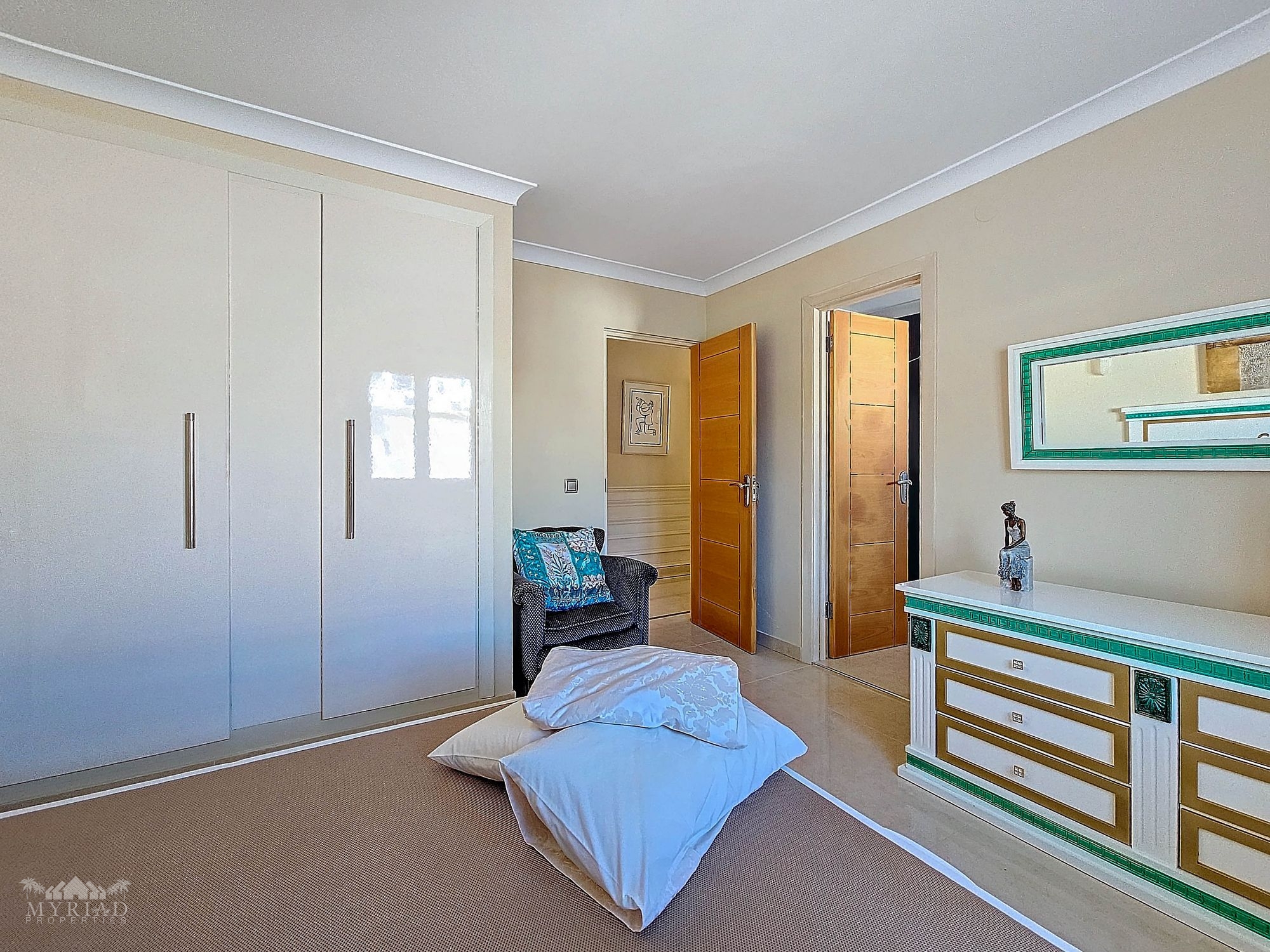 A stylish staircase leads you to the upper floor, where you will find additional storage space and access to a narrow balcony that wraps around the rear and side of the villa. This balcony is accessible from two bedrooms. Here, you will also find a bedroom with built-in wardrobes and an ensuite bathroom with a bathtub, as well as a bedroom with built-in wardrobes and an ensuite bathroom with a shower. This bedroom also provides access to a generous terrace.