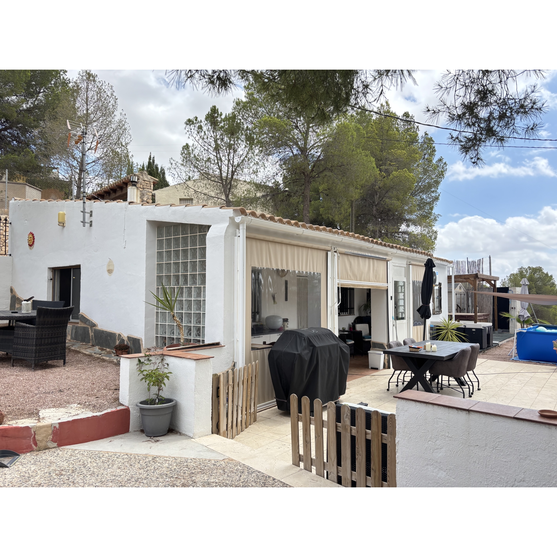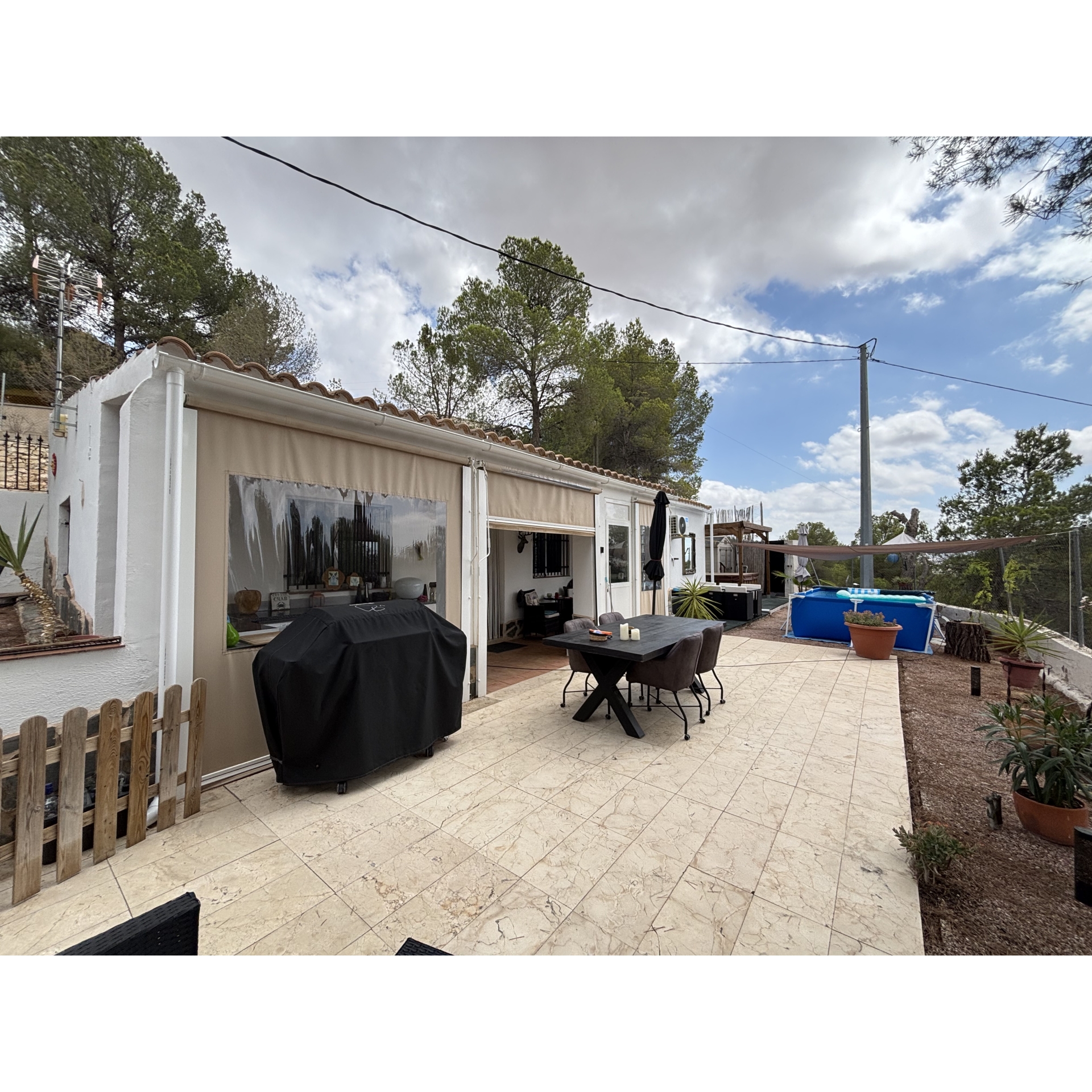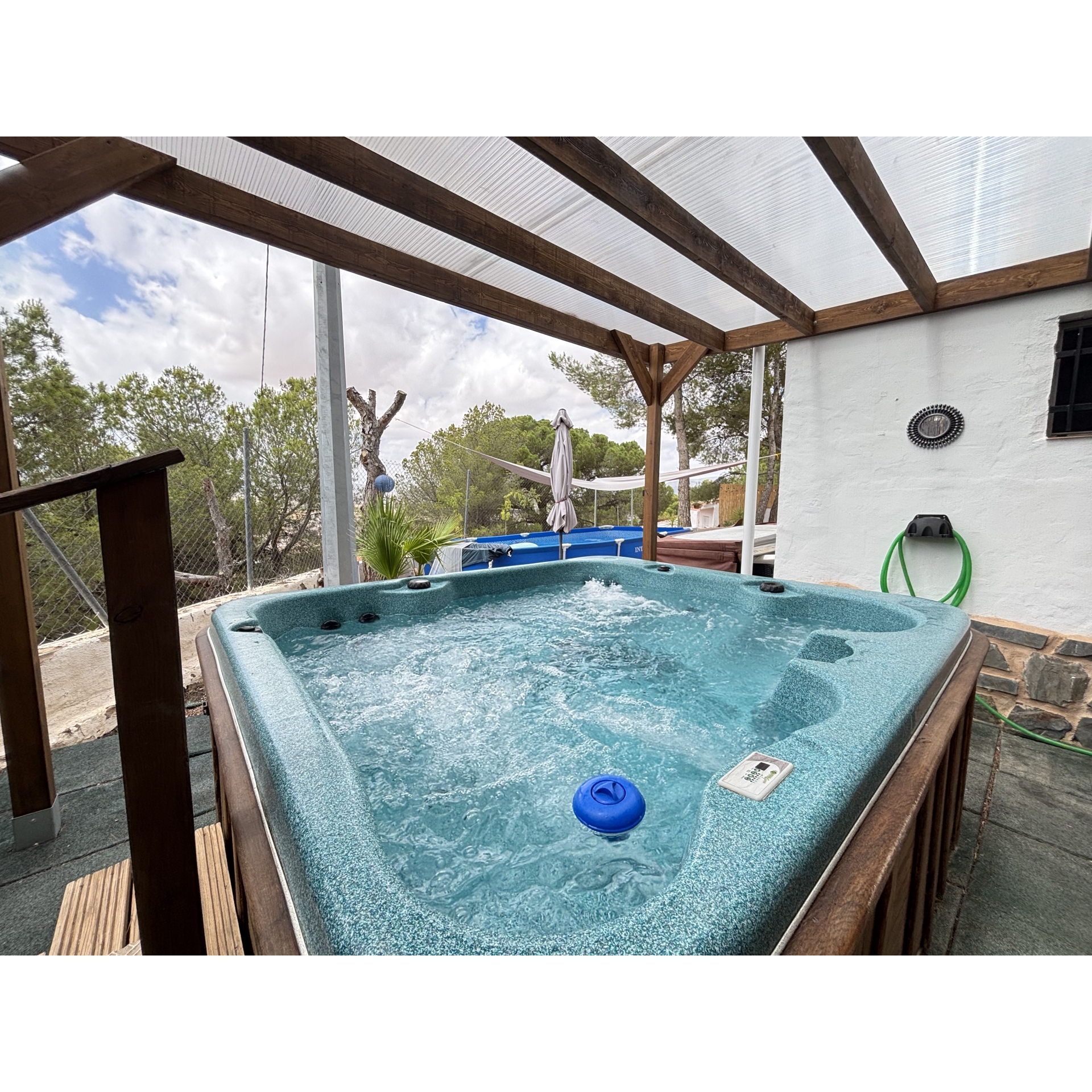 The grounds have been thoughtfully designed to maximise both the space and the stunning location. A series of beautifully arranged terraces offer a variety of atmospheres throughout the day—from sun-drenched spots ideal for relaxing in the Mediterranean climate, to shaded corners providing welcome respite during the warmer months. A charming covered chill-out area houses a private jacuzzi, creating the perfect setting to unwind in complete tranquillity all year round. In addition, a well-positioned above-ground swimming pool allows you to cool off while soaking in the incredible views and peaceful surroundings.