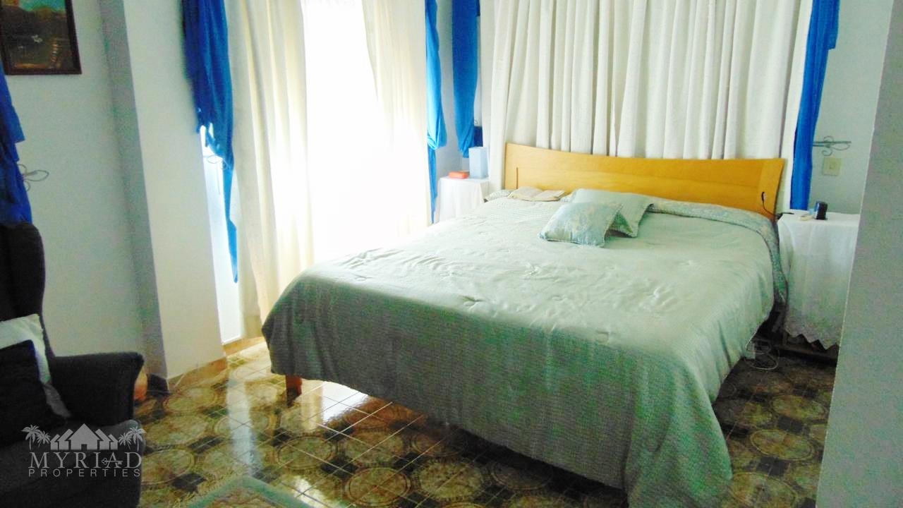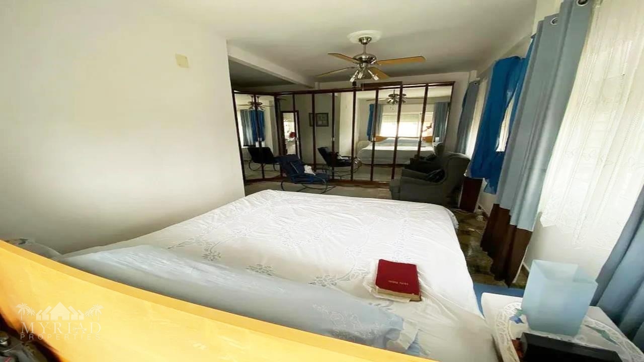 Upstairs, the master bedroom features air conditioning, fitted wardrobes, a ceiling fan, and an en-suite bathroom with a Jacuzzi bath and separate shower cubicle.