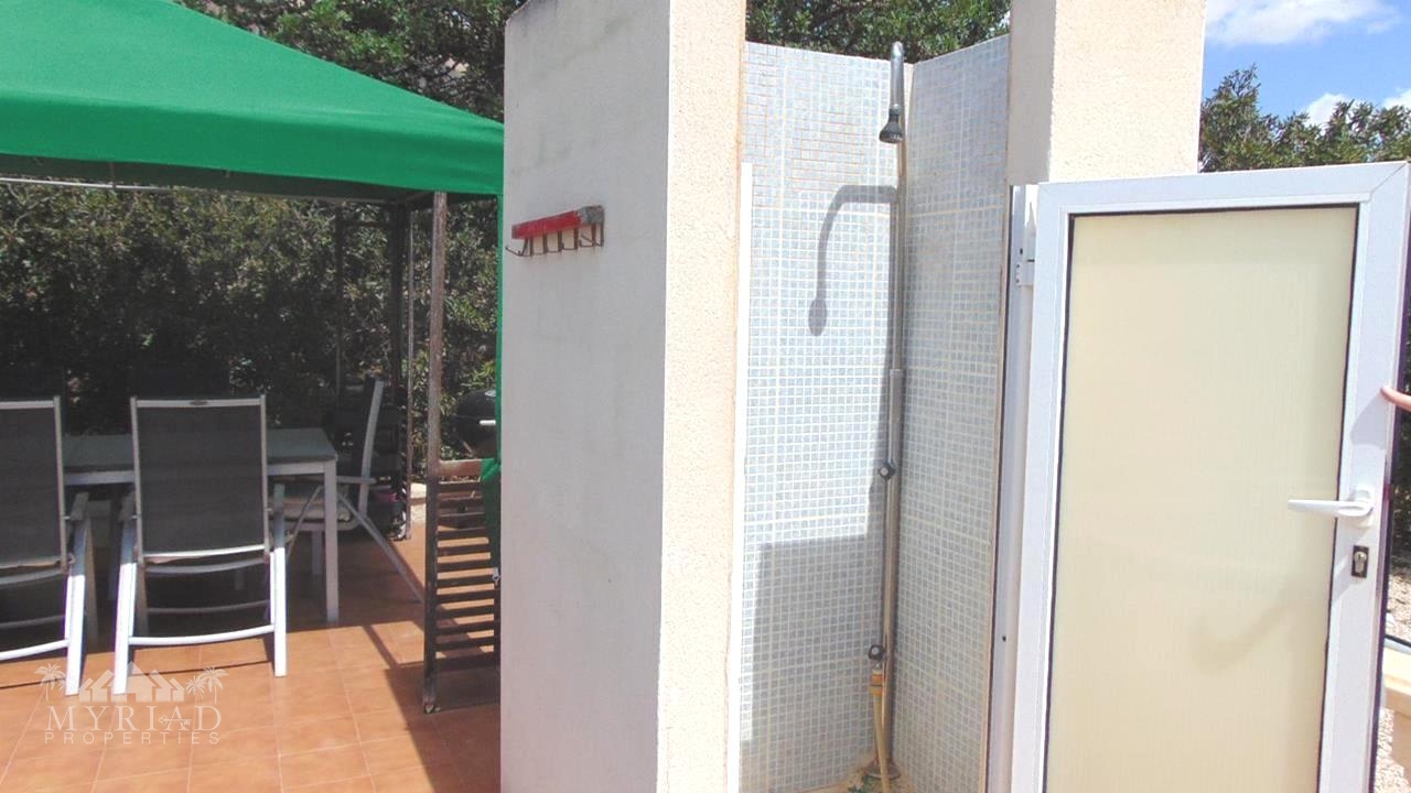 As you enter through the automatic gate, you are welcomed by landscaped gardens and a spacious carport providing shade for your vehicle. The plot features easy-to-maintain grounds with an olive orchard, a poolside covered area with electricity and water supply, perfect for outdoor dining, and a 12×6m swimming pool with stunning views. There’s also a garden shed for storage, a pool shower, and to the rear, a utility room with a combi boiler.