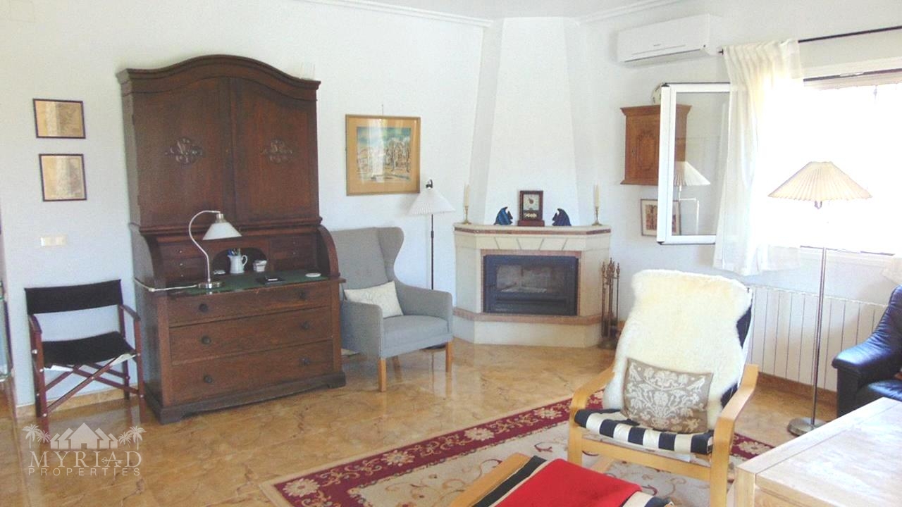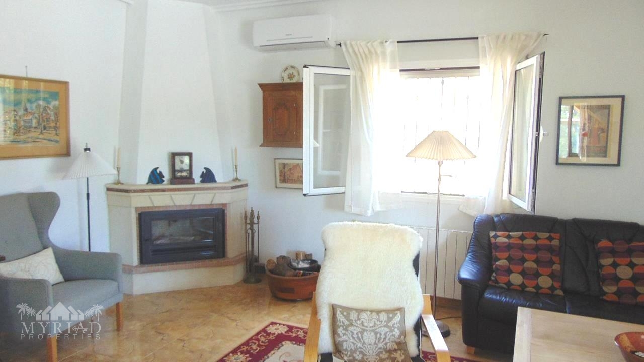 Inside, the main entrance opens into a spacious kitchen and a large, bright lounge — both equipped with air conditioning. The lounge also features patio doors leading back to the terrace, as well as a cosy wood-burning fireplace for winter evenings.