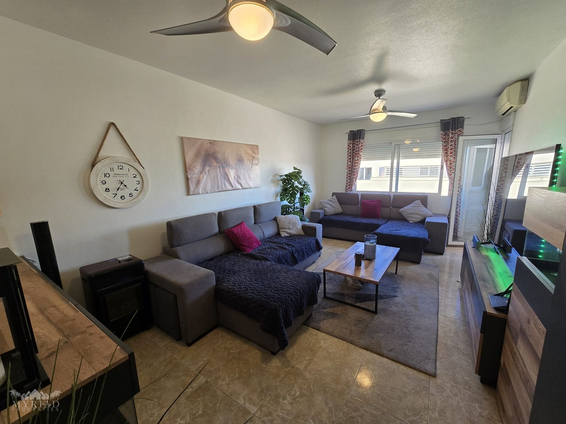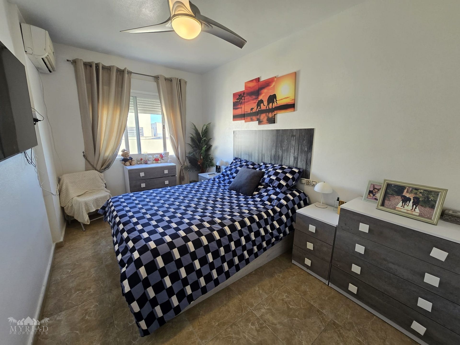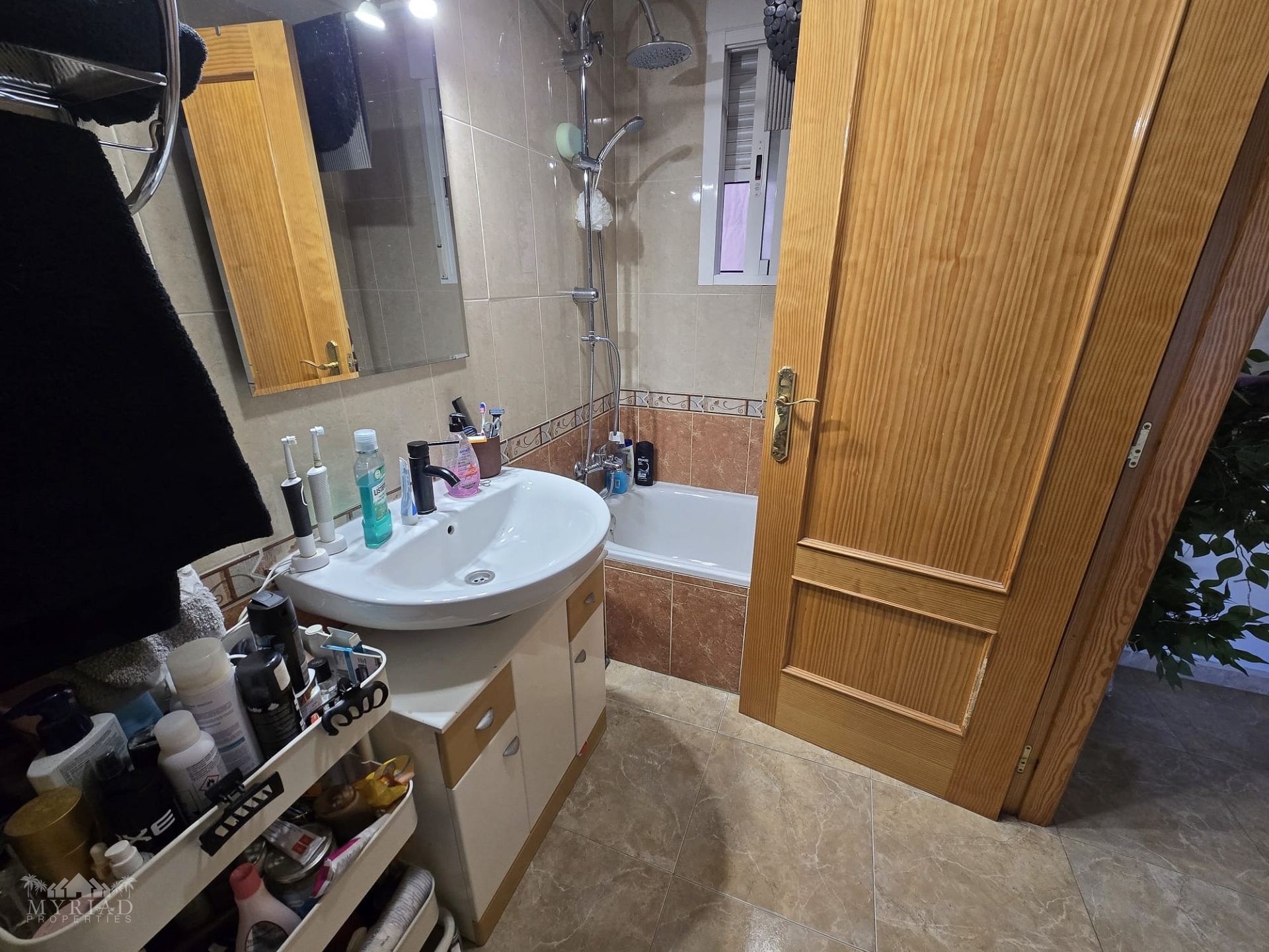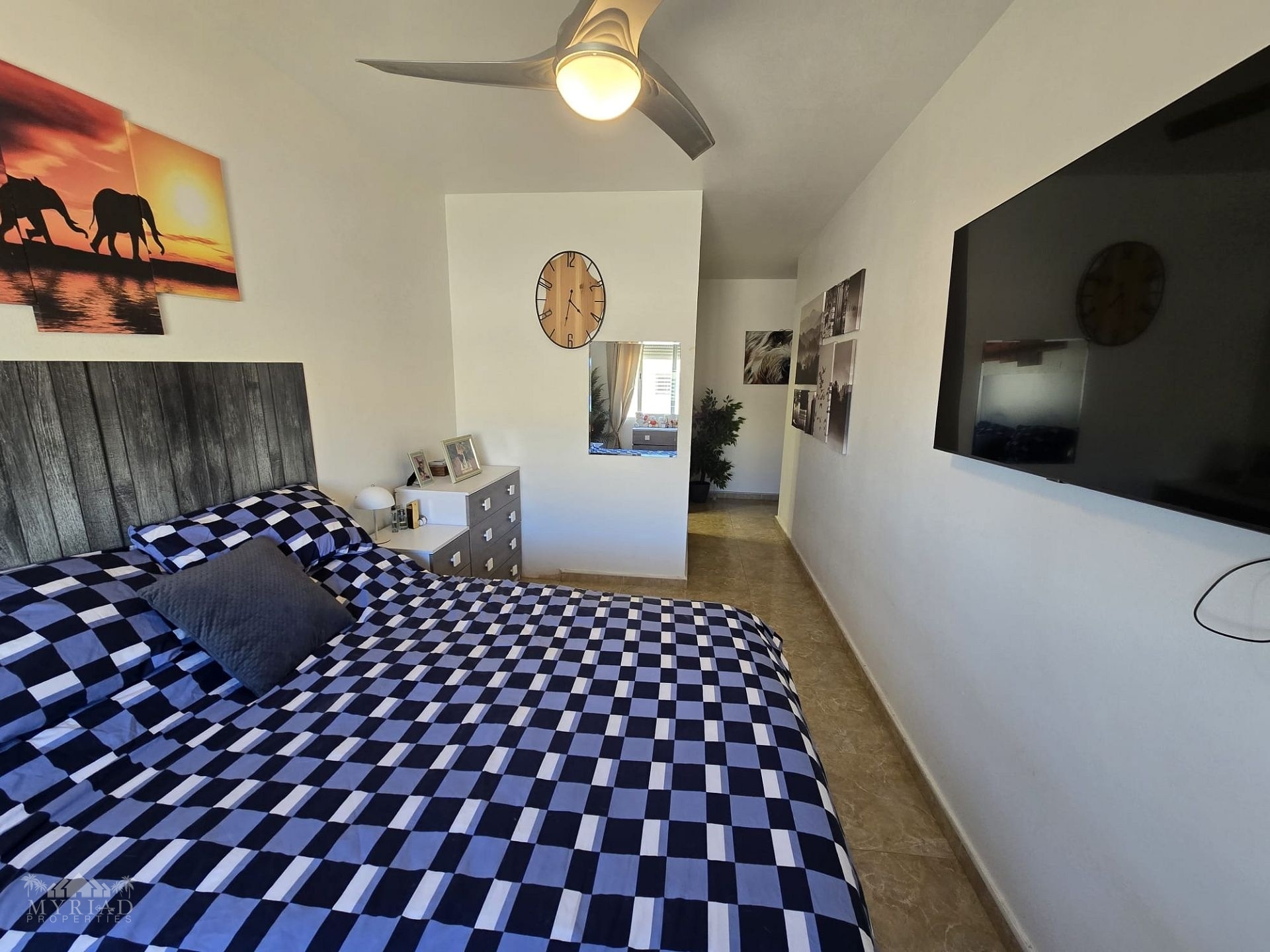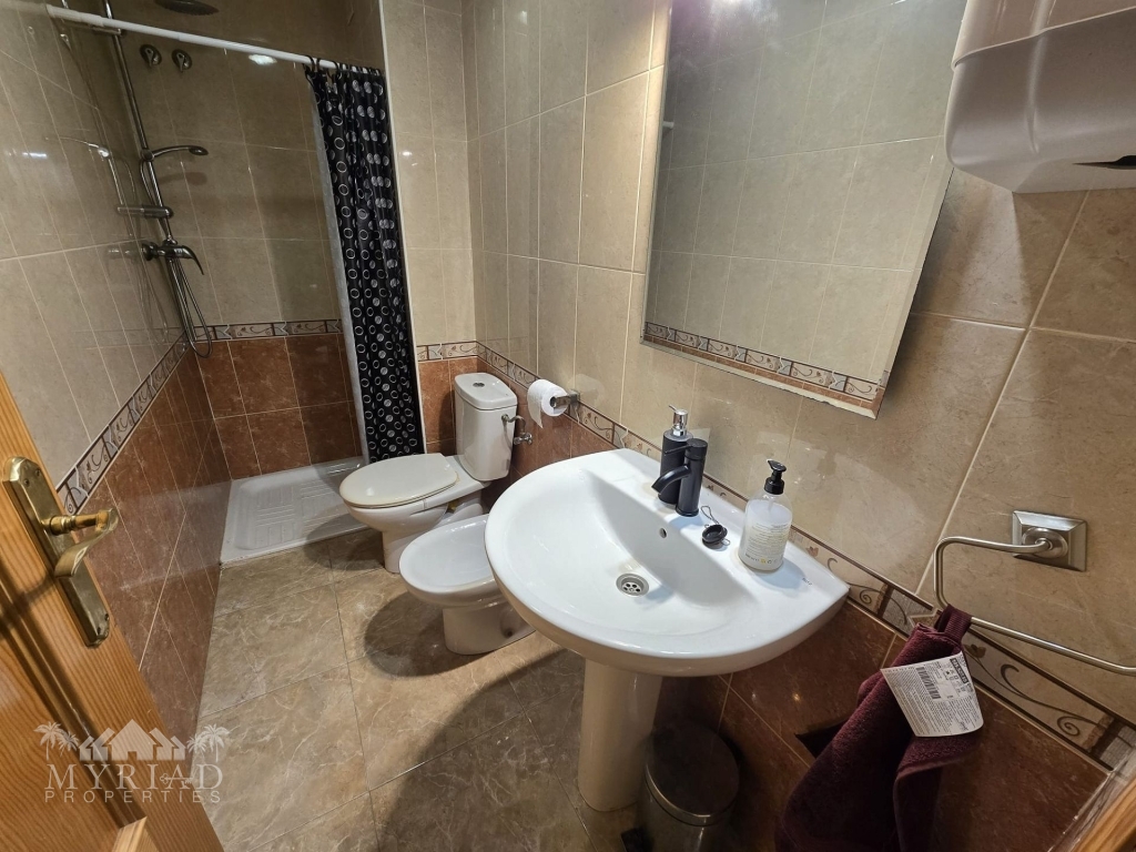 Upon entering the building, you can choose either the stairs or the lift to reach the first floor, where the apartment is well positioned with its front door facing the private outdoor area. Inside, the hallway first leads to the family bathroom, followed by a spacious kitchen with a utility room that provides access to the smaller outdoor space—an excellent spot to enjoy the fresh morning air. The corridor continues to the generously sized lounge, which opens onto its own balcony with views of the mountains and the medical centre. At this end of the apartment, you will also find two good-sized double bedrooms, one currently used as a dressing room or walk-in closet, as well as the master bedroom. The master bedroom enjoys mountain views and features its own private en-suite bathroom.