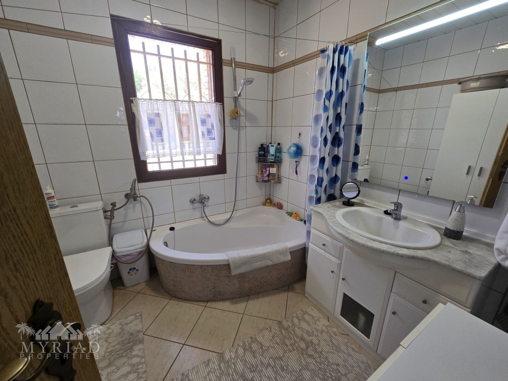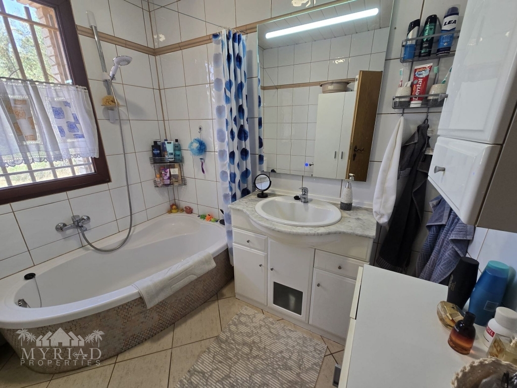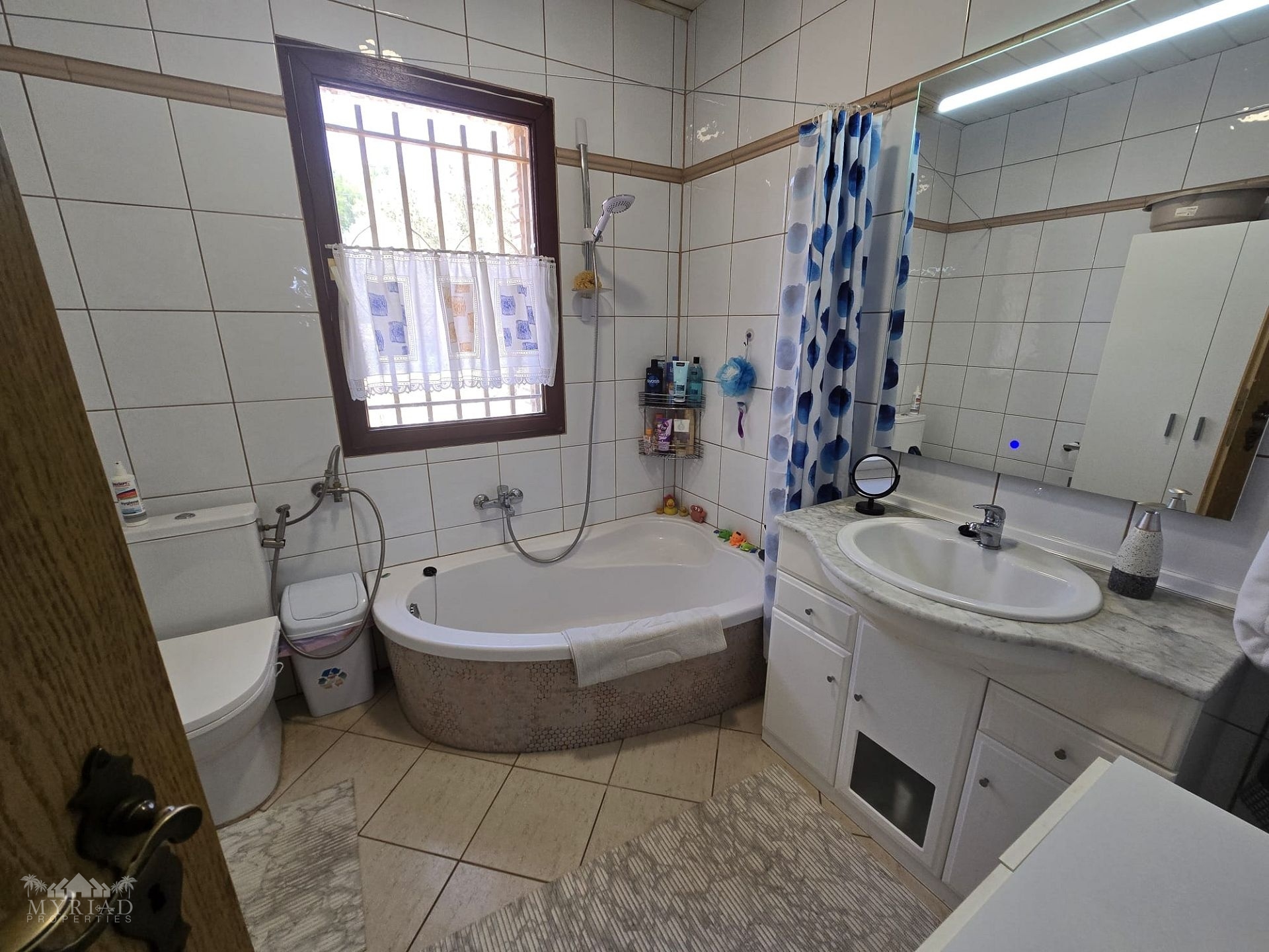 Stepping outside, you will discover an expansive garden of nearly 4,000 m², where you can relish the tranquility and beauty of nature. With multiple olive trees and vines, this is the ideal setting for anyone who cherishes outdoor living. The garden offers countless possibilities for landscaping, relaxation, or even a small vegetable garden.