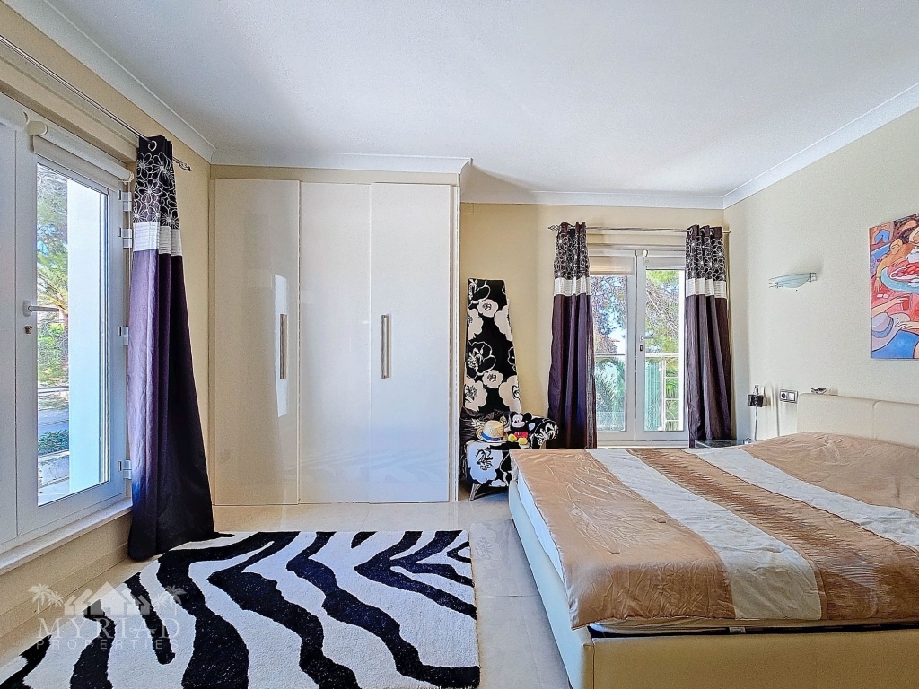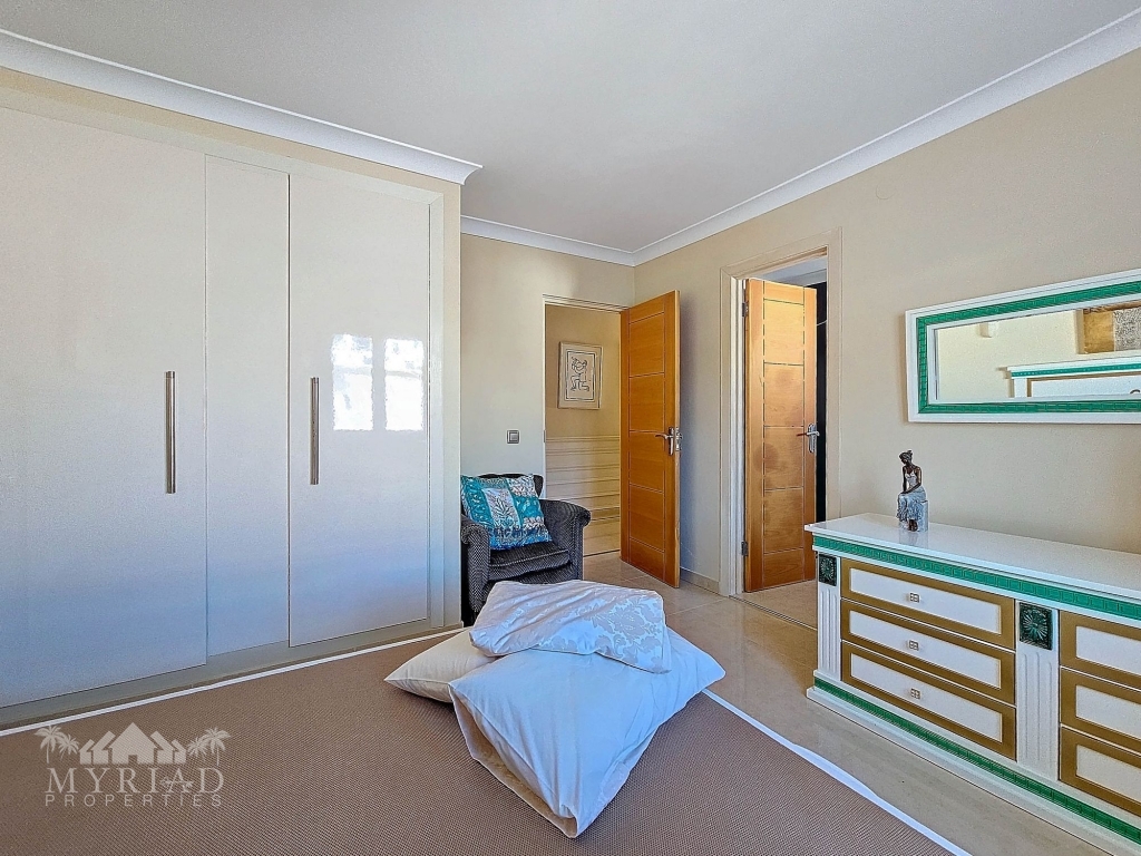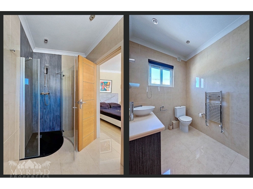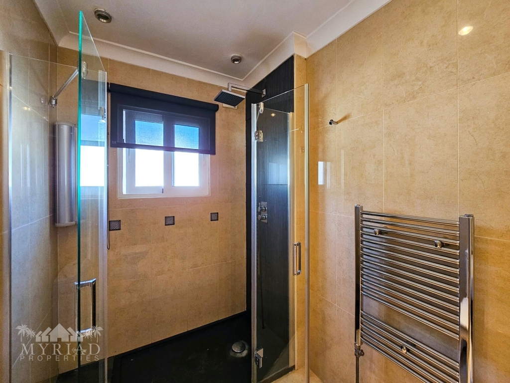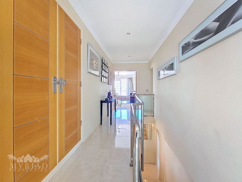 A stylish staircase leads you to the upper floor, where you will find additional storage space and access to a narrow balcony that wraps around the rear and side of the villa. This balcony is accessible from two bedrooms. Here, you will also find a bedroom with built-in wardrobes and an ensuite bathroom with a bathtub, as well as a bedroom with built-in wardrobes and an ensuite bathroom with a shower. This bedroom also provides access to a generous terrace.