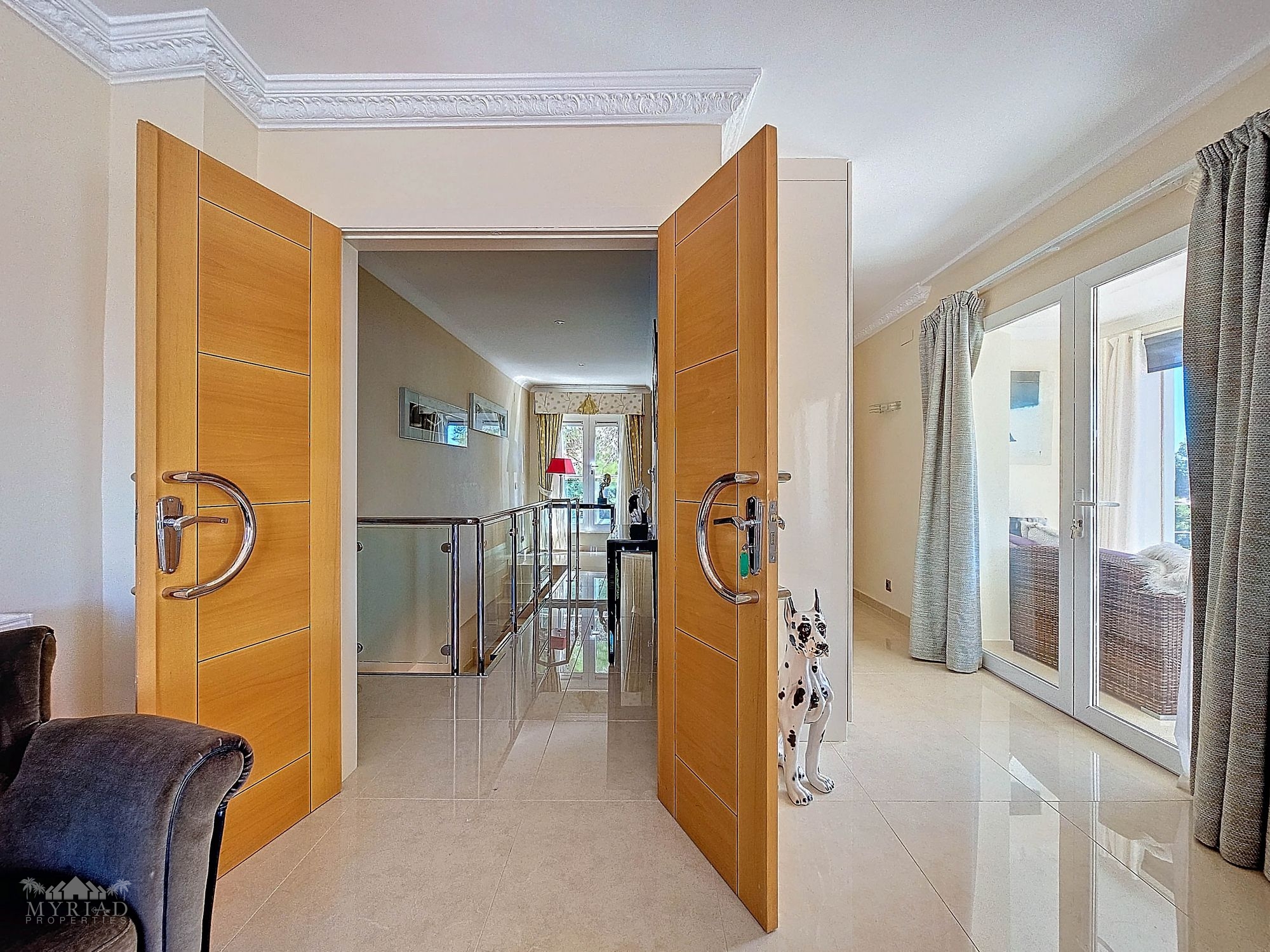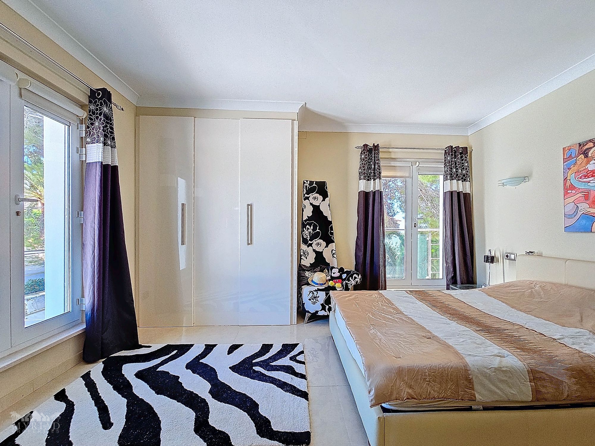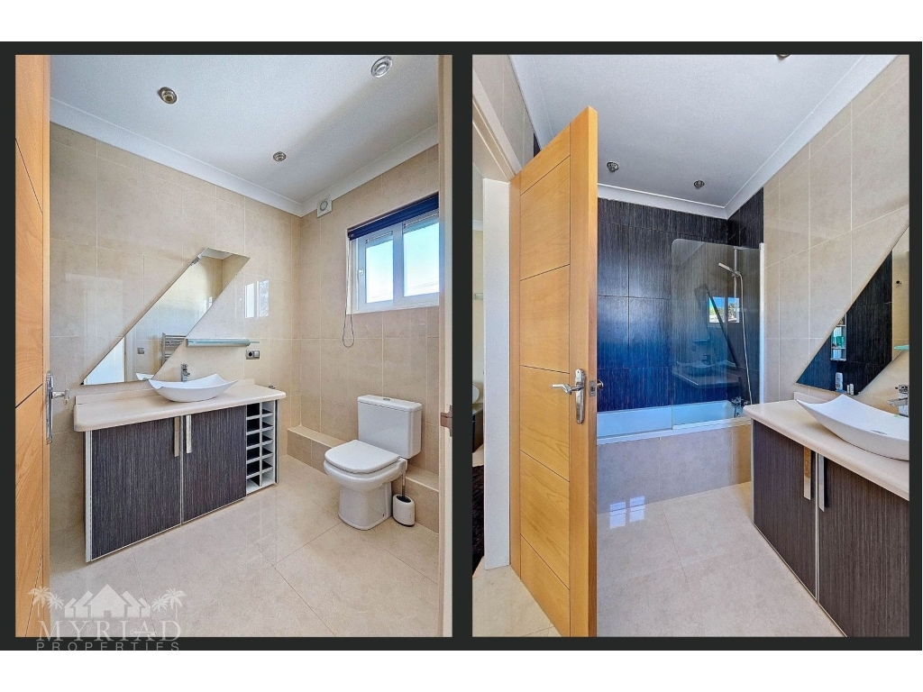 A stylish staircase leads you to the upper floor, where you will find additional storage space and access to a narrow balcony that wraps around the rear and side of the villa. This balcony is accessible from two bedrooms. Here, you will also find a bedroom with built-in wardrobes and an ensuite bathroom with a bathtub, as well as a bedroom with built-in wardrobes and an ensuite bathroom with a shower. This bedroom also provides access to a generous terrace.