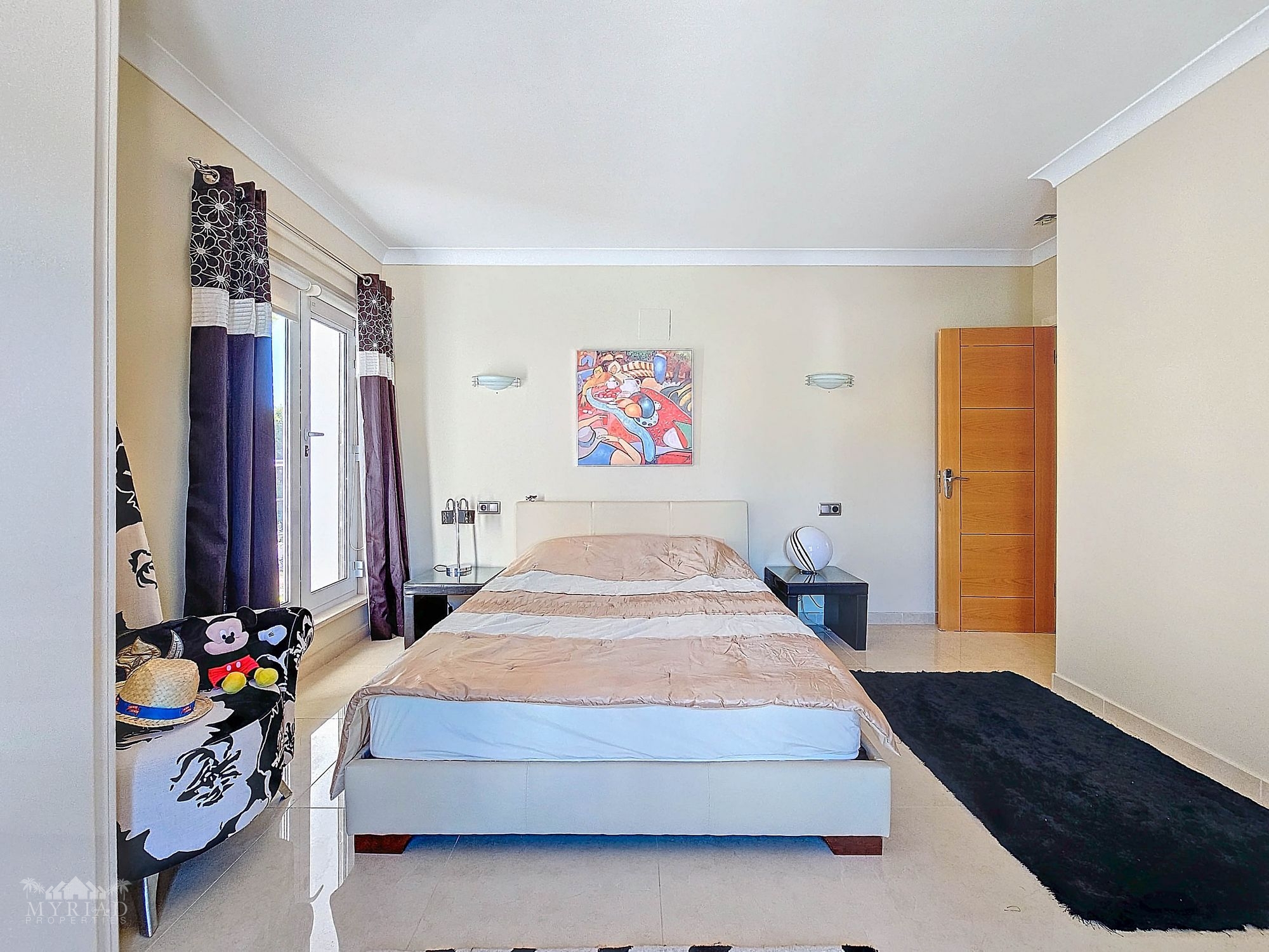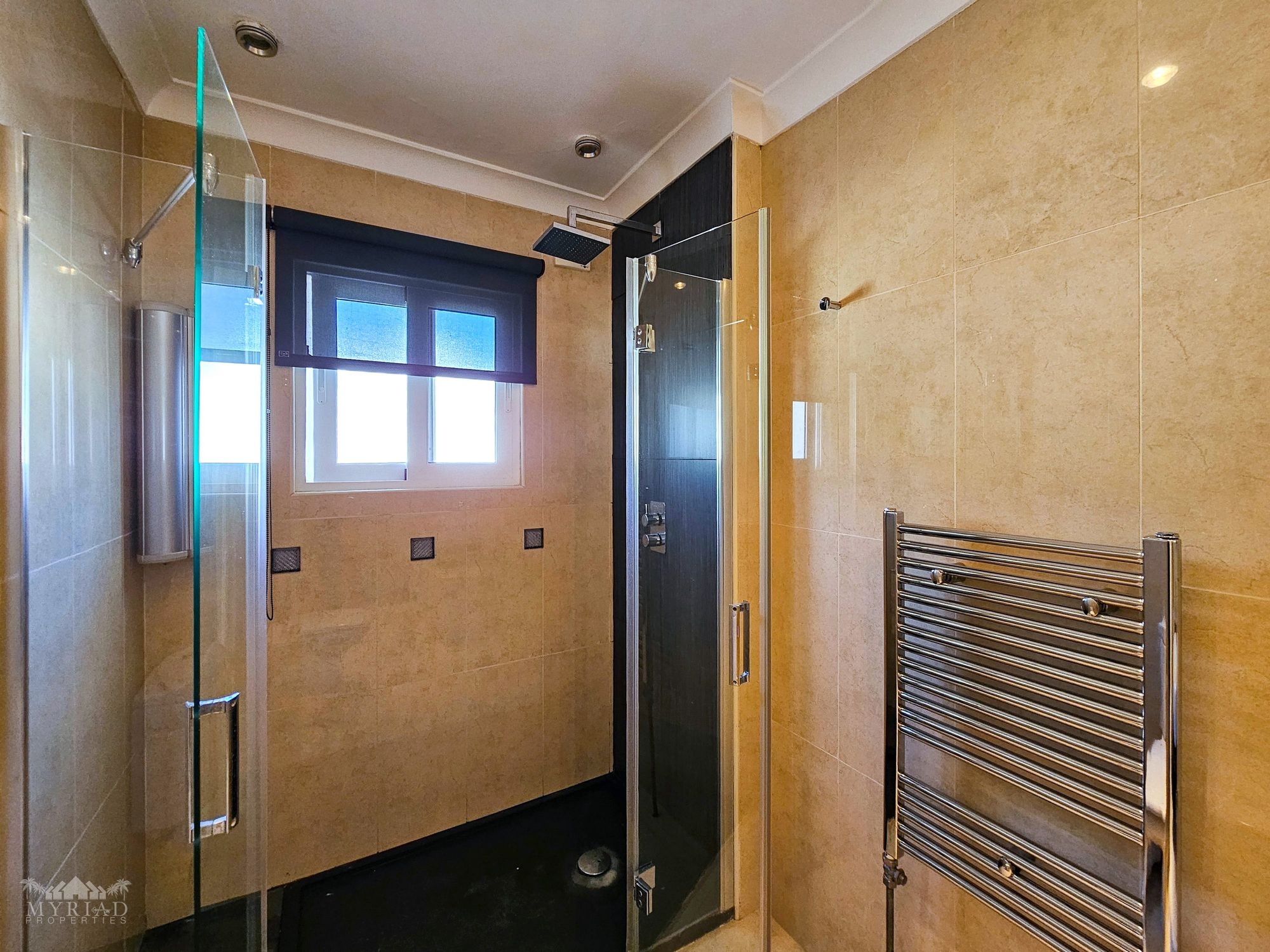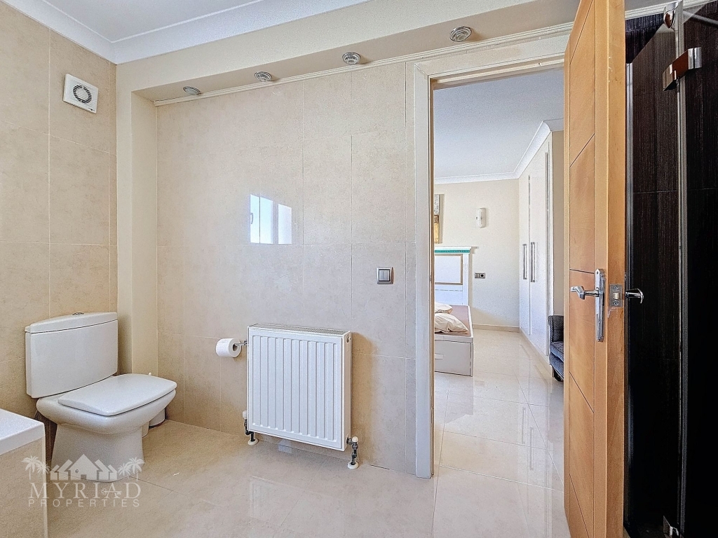 Finally, there is the very spacious master bedroom, again equipped with built-in wardrobes and access to a large terrace. This master bedroom has an ensuite bathroom with both a bathtub and a shower. A true bonus is the terrace with sea views, fully equipped with glass curtains, making it a delightful place to be even in colder periods.