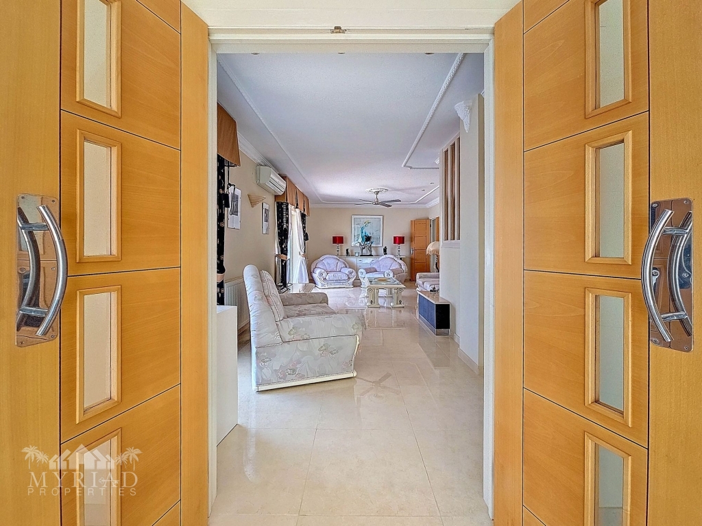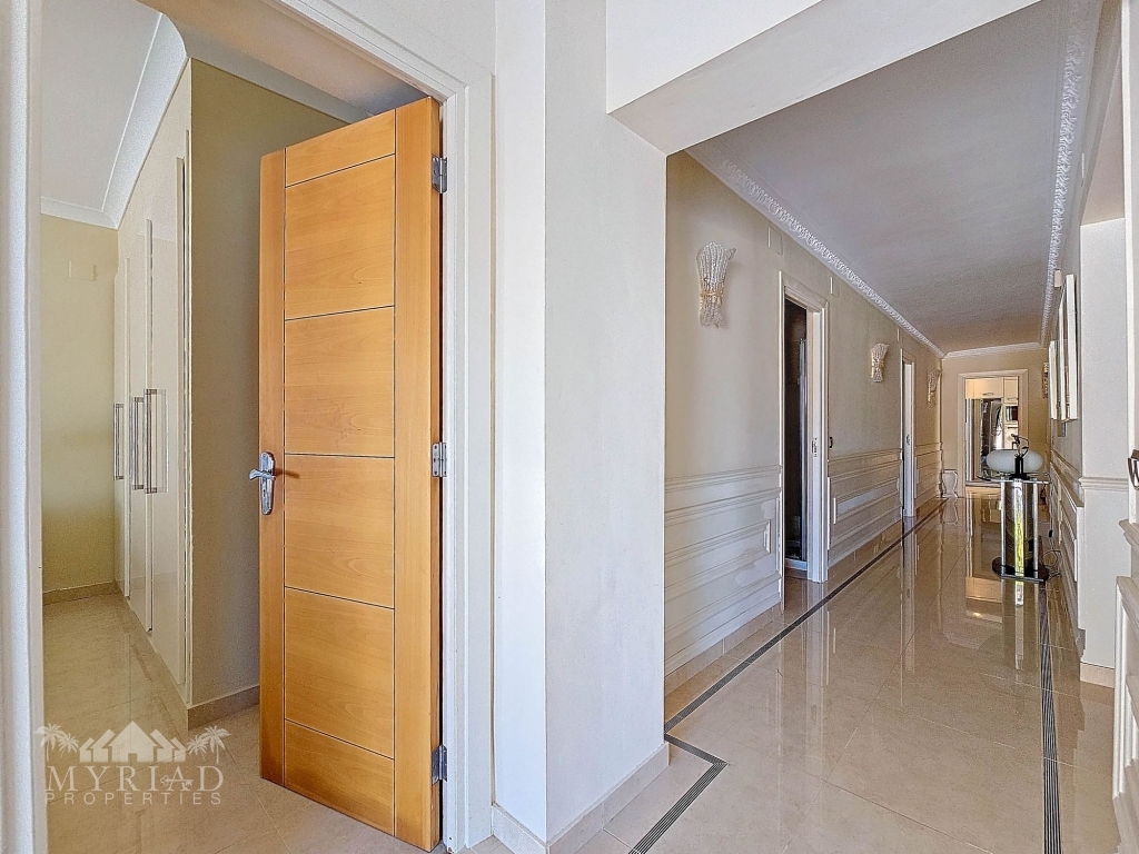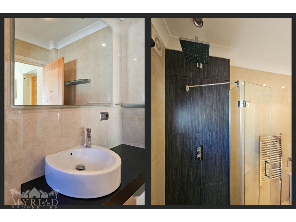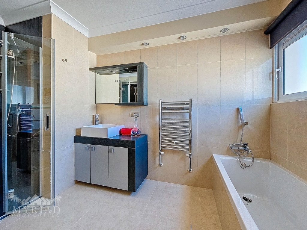 Finally, there is the very spacious master bedroom, again equipped with built-in wardrobes and access to a large terrace. This master bedroom has an ensuite bathroom with both a bathtub and a shower. A true bonus is the terrace with sea views, fully equipped with glass curtains, making it a delightful place to be even in colder periods.