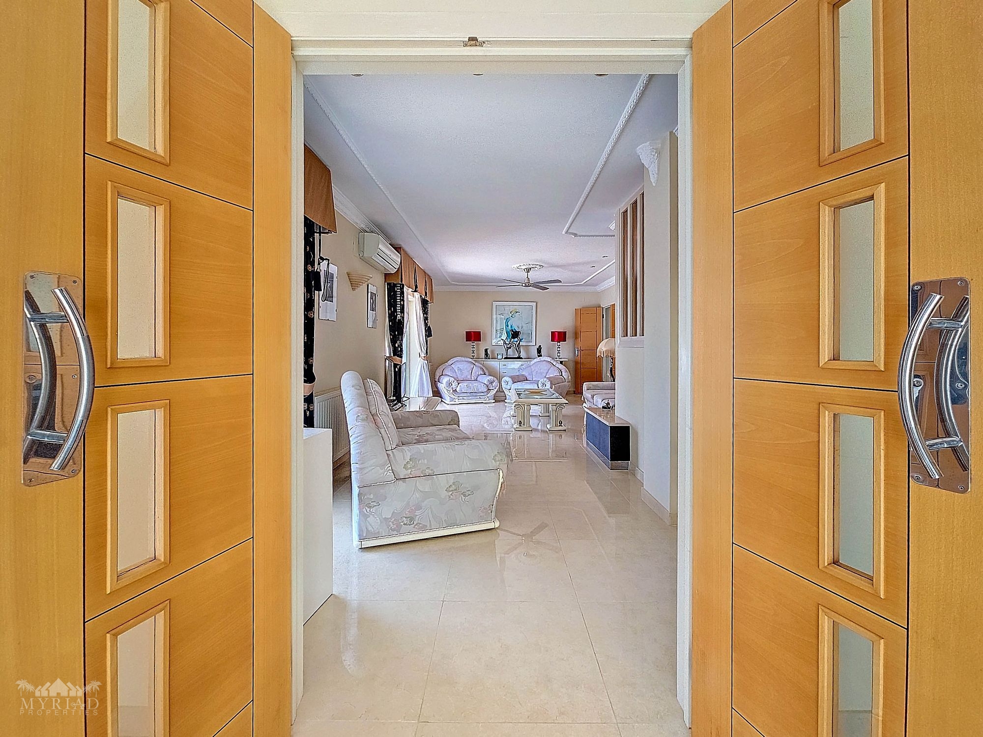 Upon entering the villa, you immediately experience its luxurious and light ambiance. On the ground floor, you will find the living room with double doors leading to the terrace and the pool. This living area flows into a dining area and a spacious, well-equipped kitchen. At the rear of the villa, you have access to the terrace, perfect for outdoor dining. Additionally, on the ground floor, there is a separate guest toilet with a shower and two bedrooms with ensuite bathrooms (one with a shower and the other with both a shower and a bathtub). One of these bedrooms has access to its own terrace, and both bedrooms are equipped with beautiful built-in wardrobes with lighting.