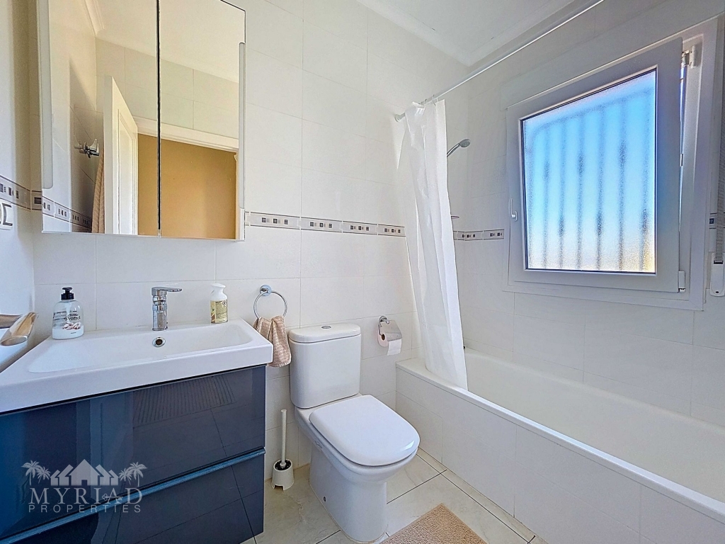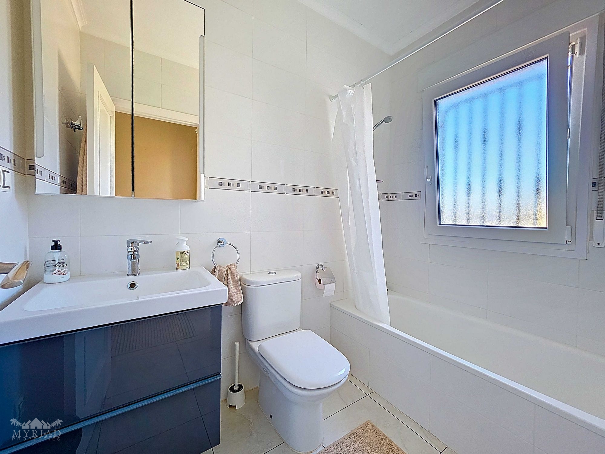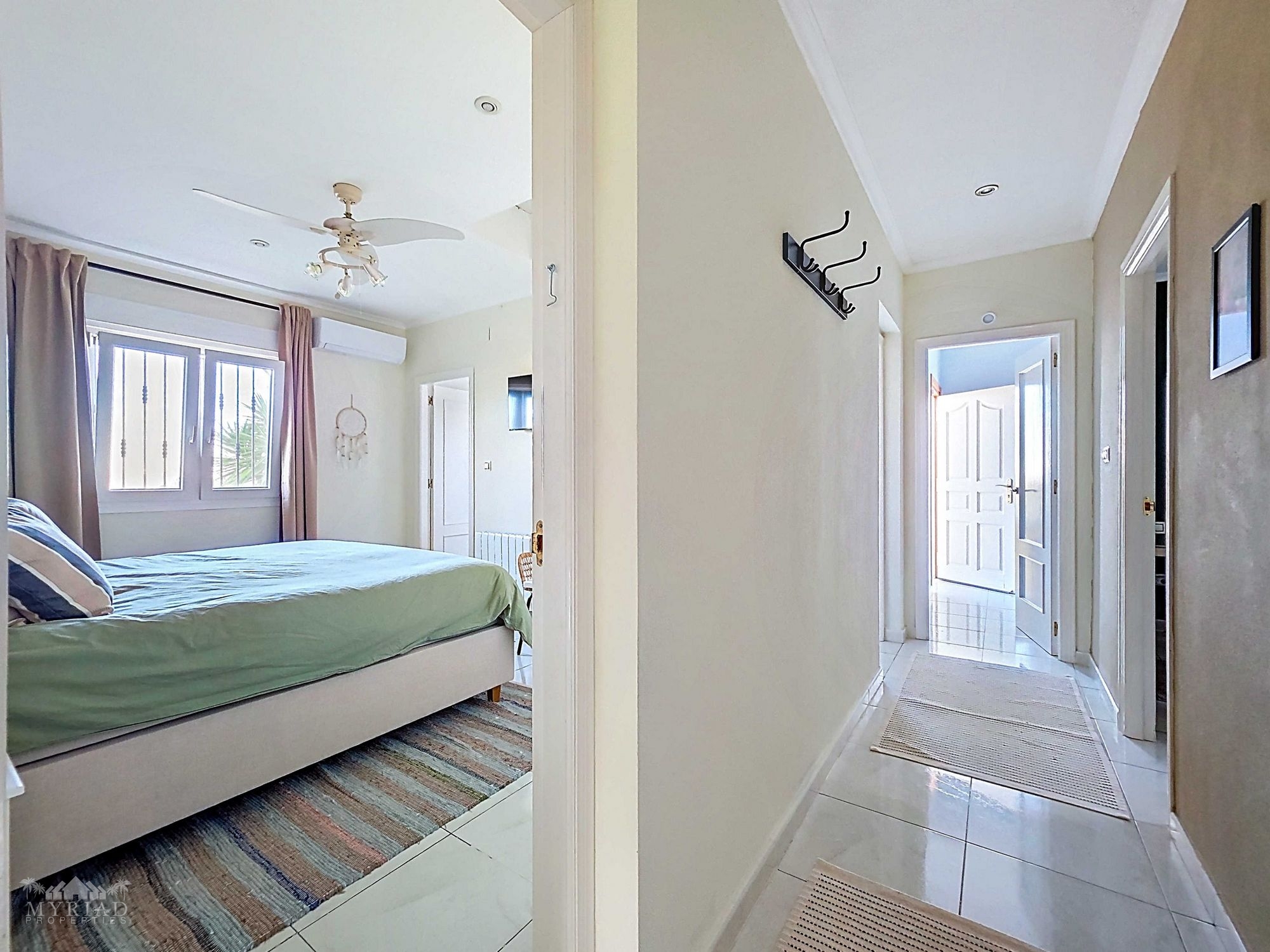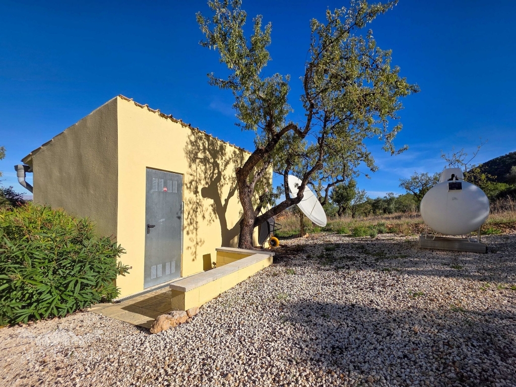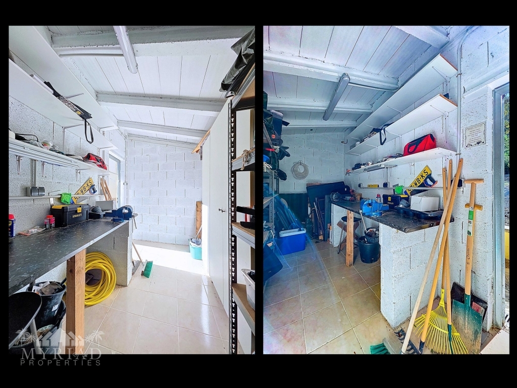 Beyond the electric gate lies the fully fenced and spacious plot. The low-maintenance garden is well maintained and includes several olive and almond trees with automatic irrigation. In the garden there is a detached brick storage room (2.5 x 5 meters).