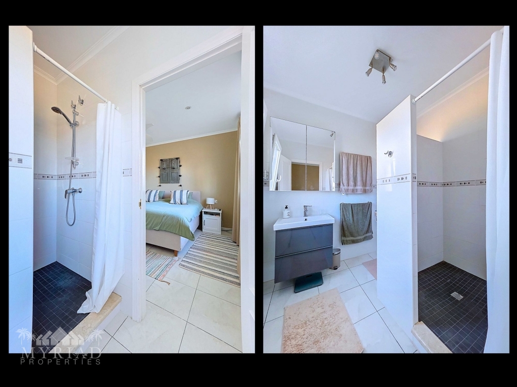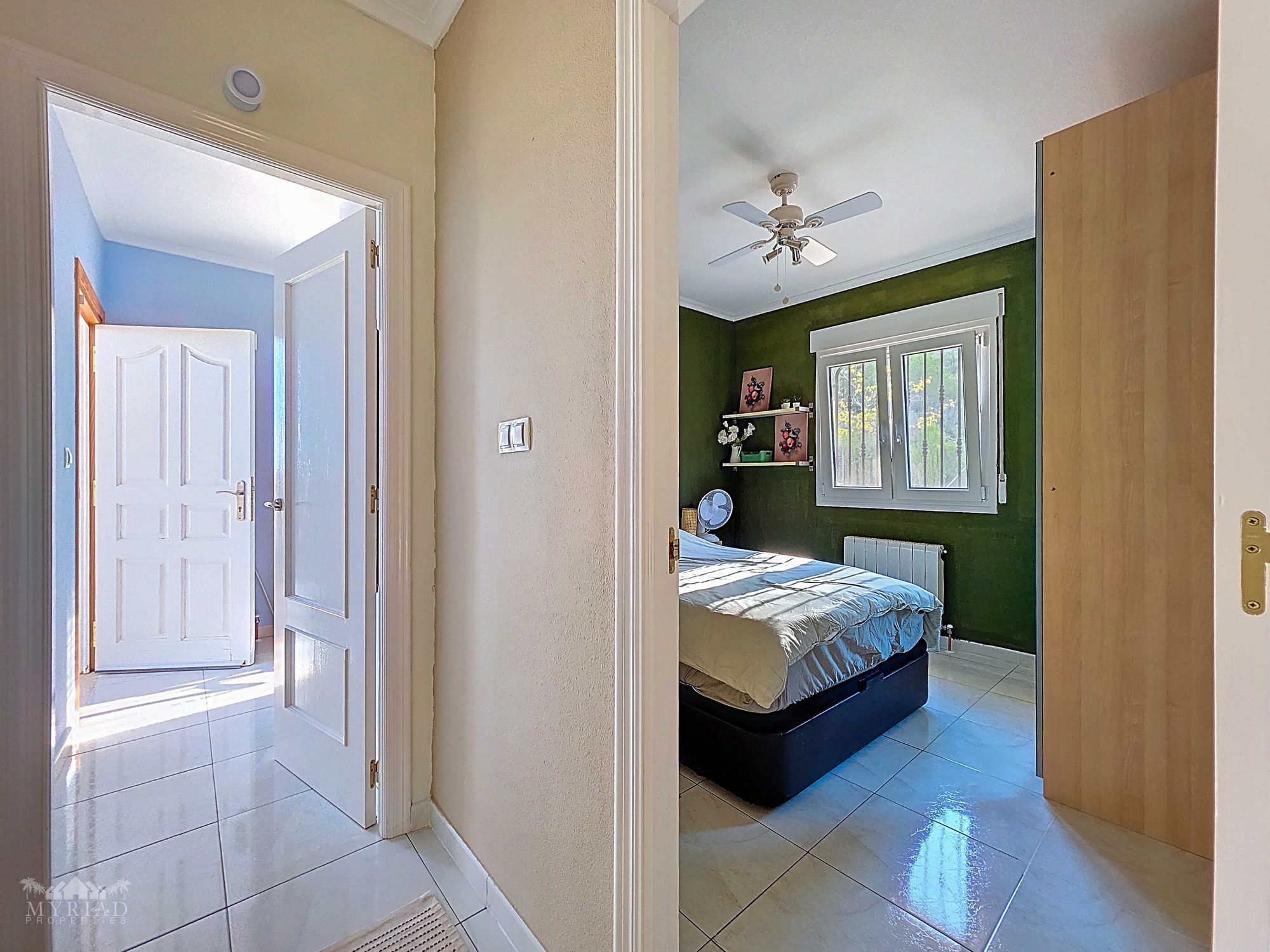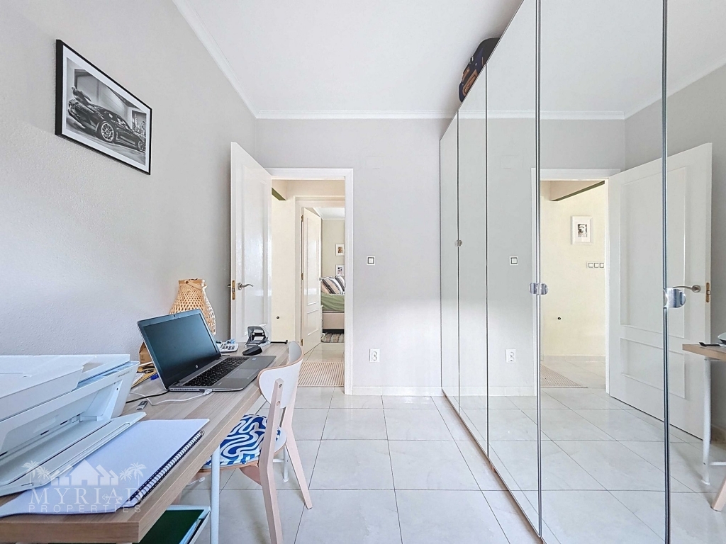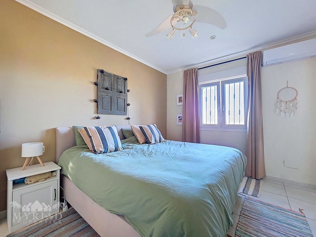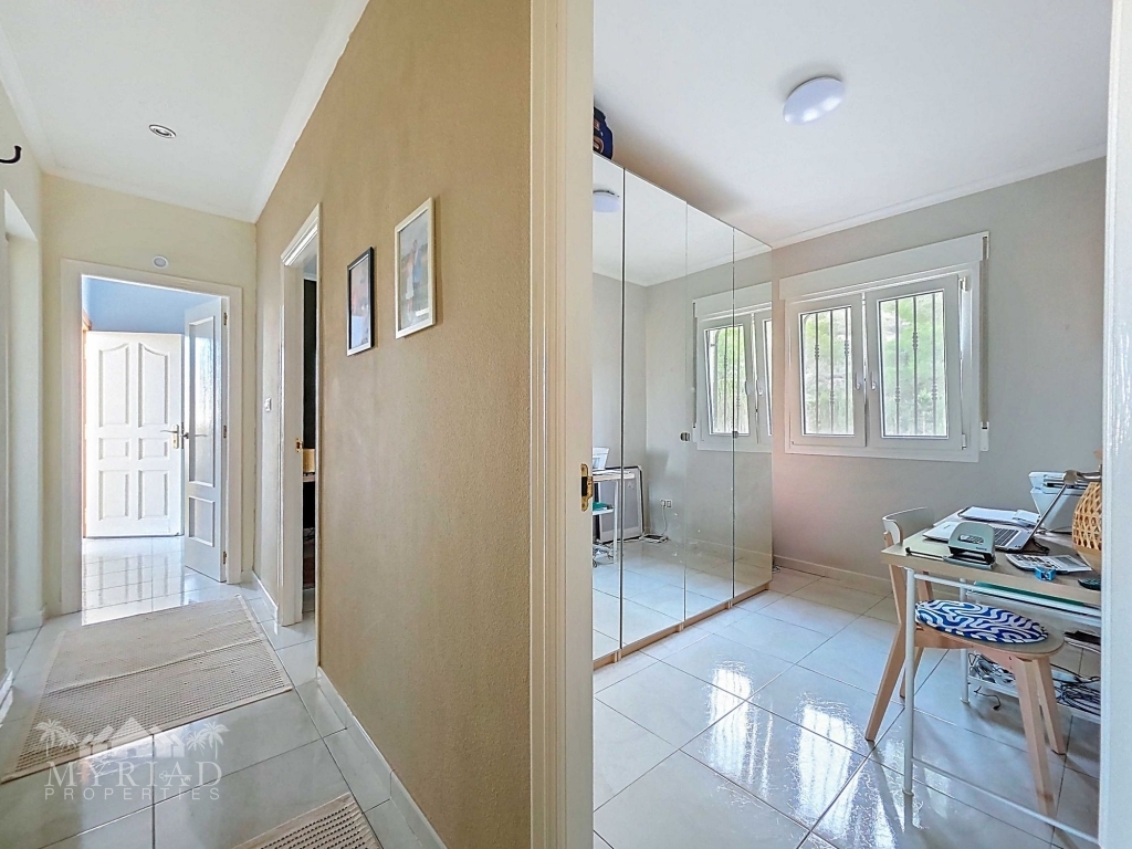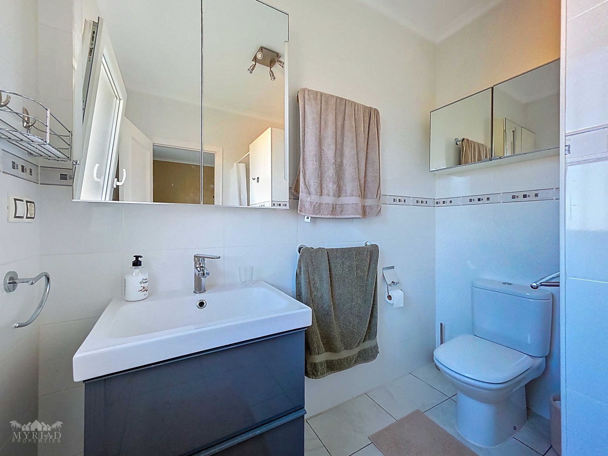 Beyond the electric gate lies the fully fenced and spacious plot. The low-maintenance garden is well maintained and includes several olive and almond trees with automatic irrigation. In the garden there is a detached brick storage room (2.5 x 5 meters).