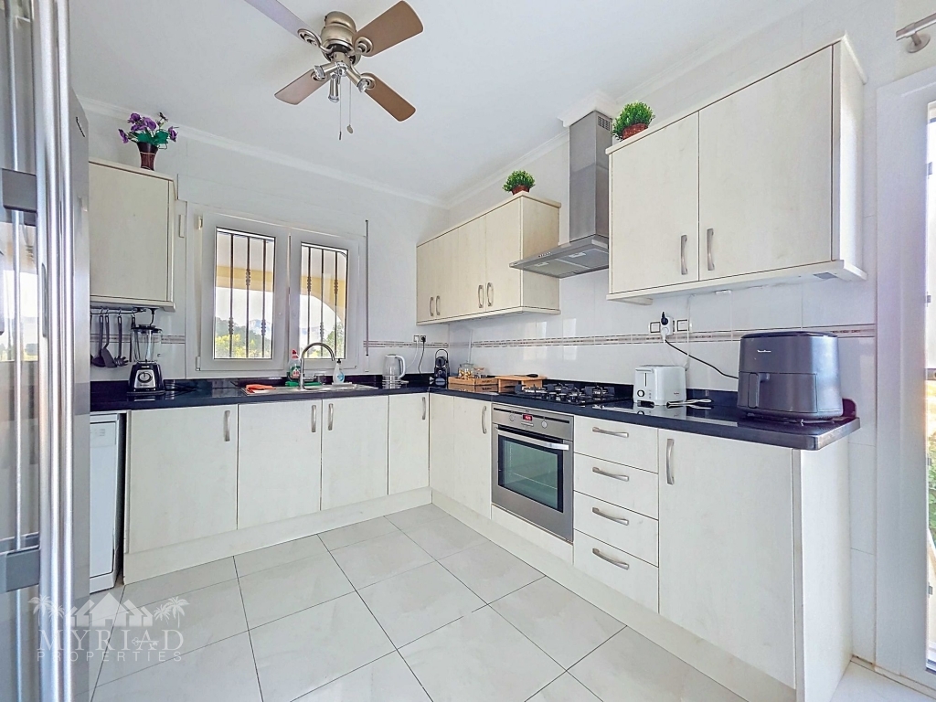 The villa is in excellent condition and ready for immediate living. Furniture can be taken over if desired, making it possible to move in right away or use it as a holiday home. The villa has a bright and spacious living room that flows into a dining area and a well-equipped kitchen with top-brand appliances.