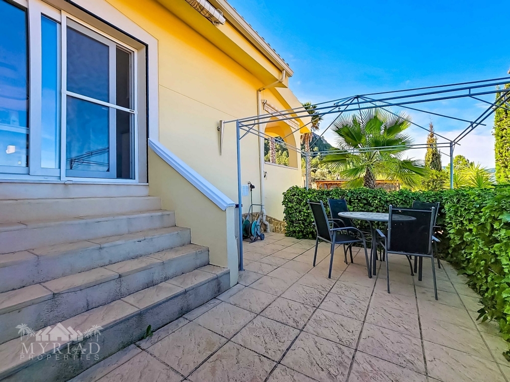 The living room opens onto a large covered terrace overlooking the pool, while the dining area by the kitchen gives access to a second terrace with a wide panoramic view across the valley.